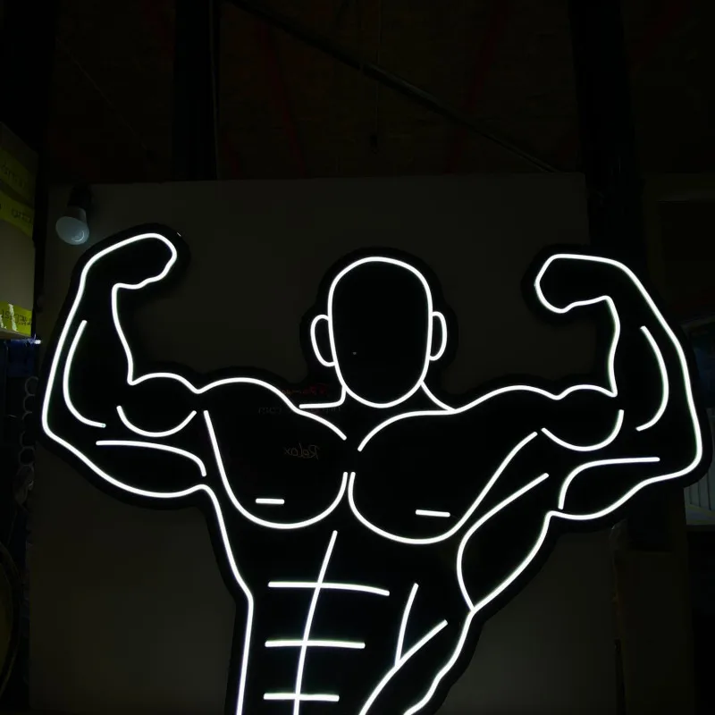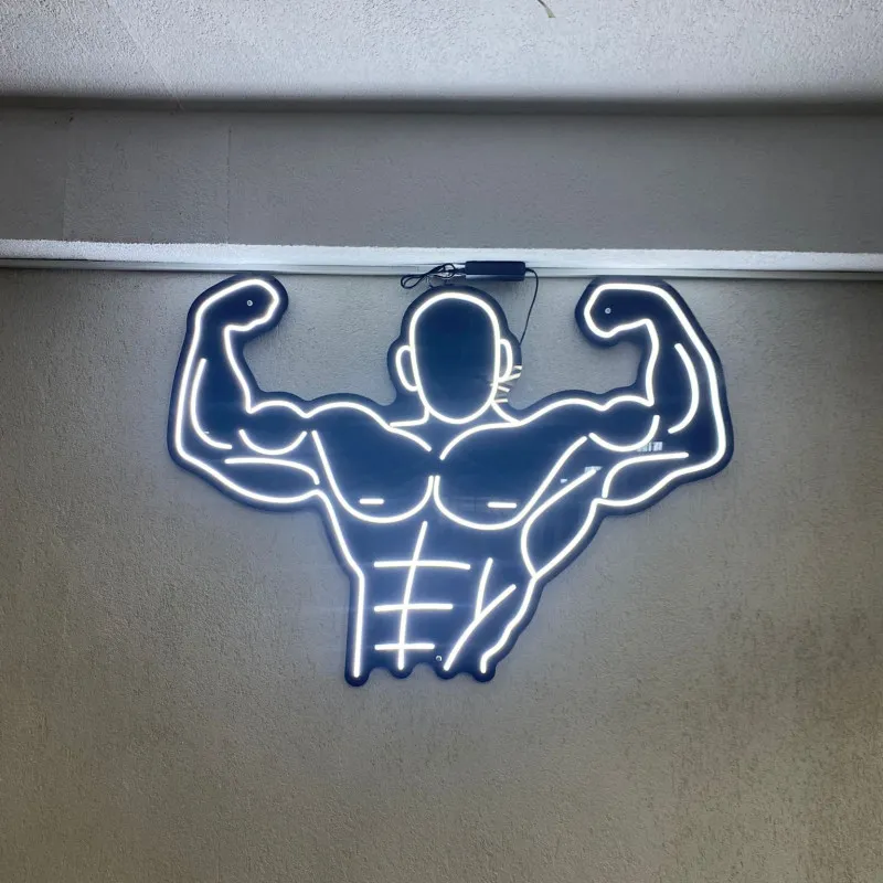 Das beleuchtete „Fit Gym“-Schild ist auf schwarzem Plexiglas montiert, was ihm einen eleganten und modernen Touch verleiht. Mit der hellen, kühlen weißen Schrift leuchtet das „Fit Gym“-Schild hell vor dem dunklen Hintergrund und hebt seine Botschaft auffällig hervor.
