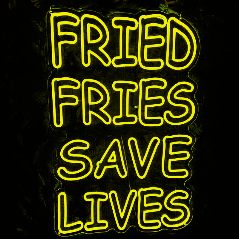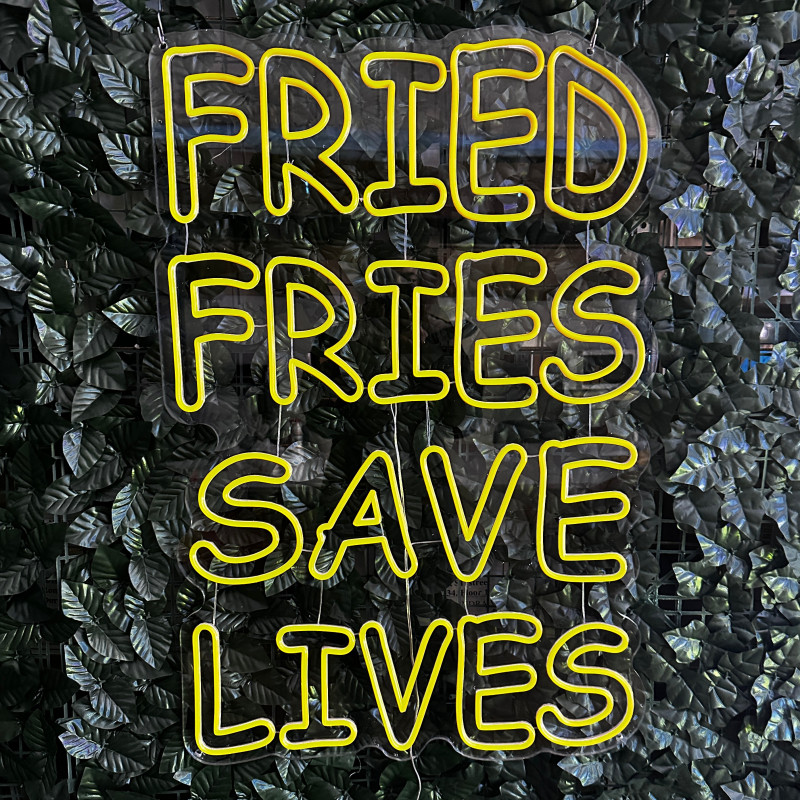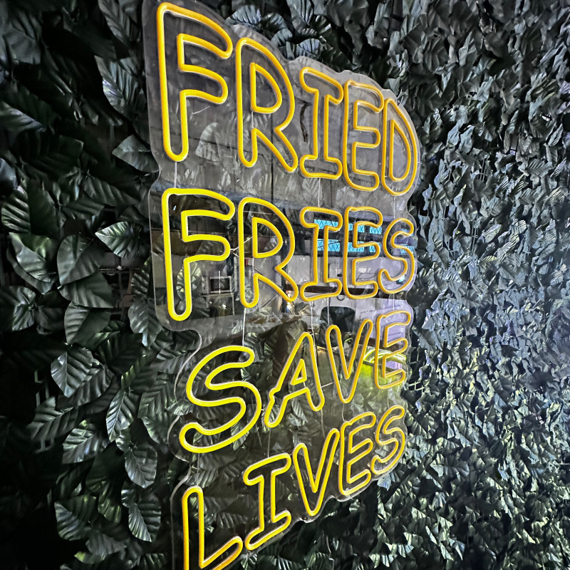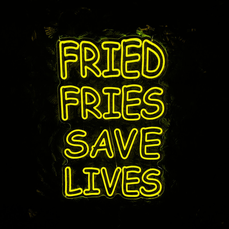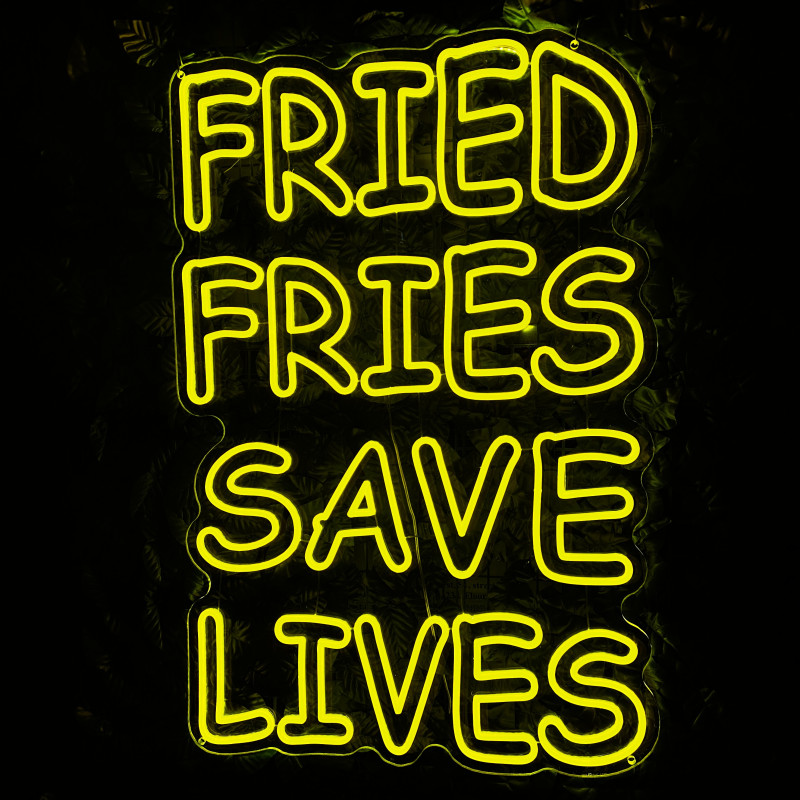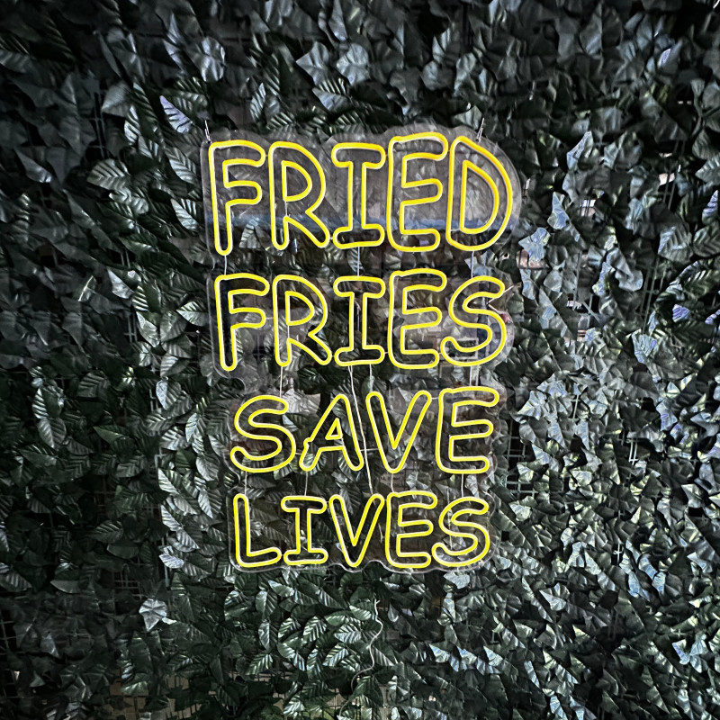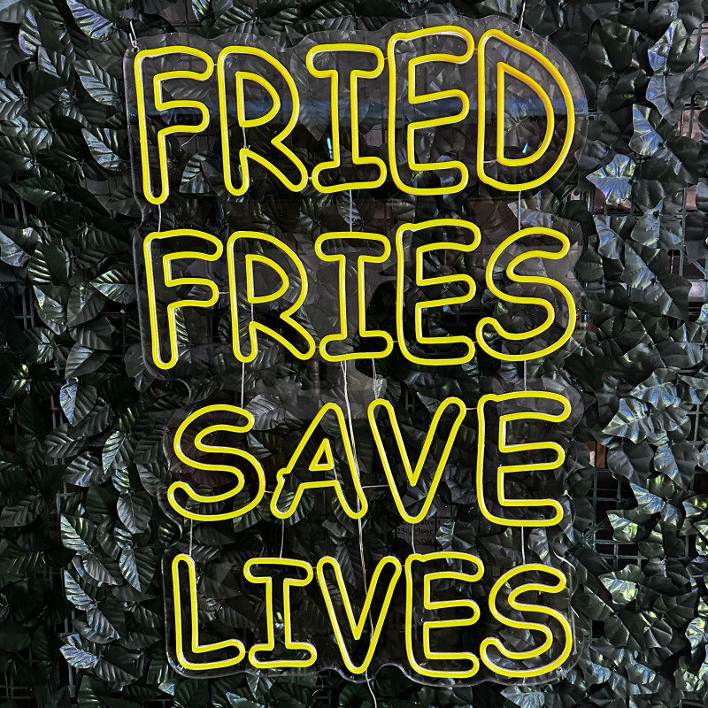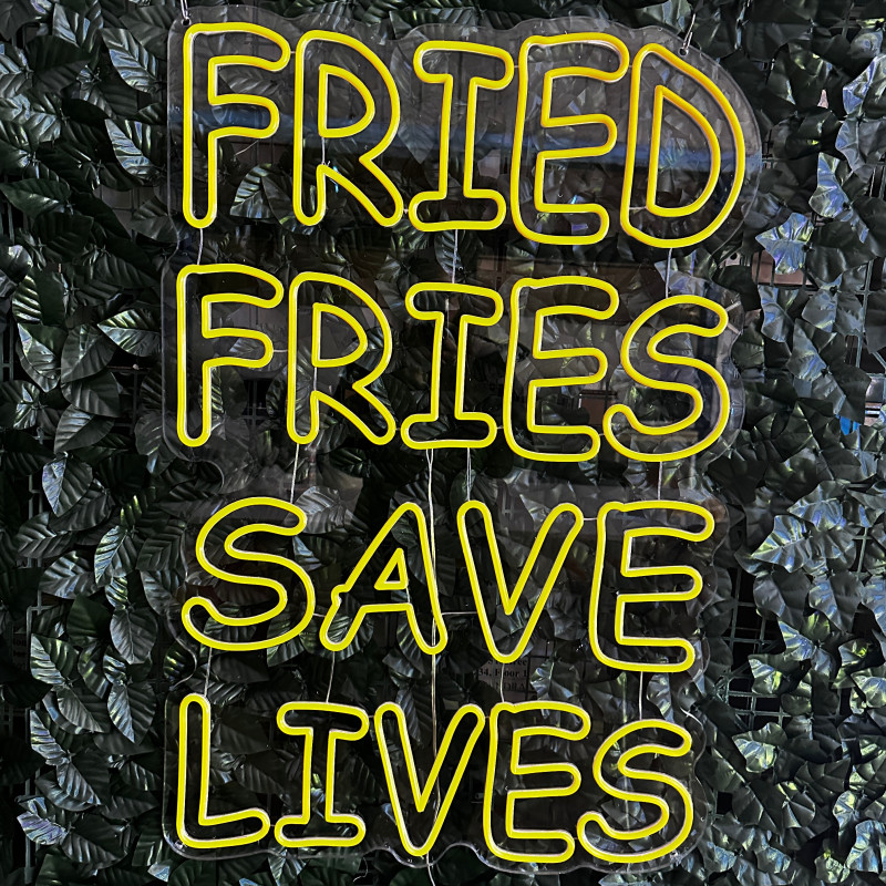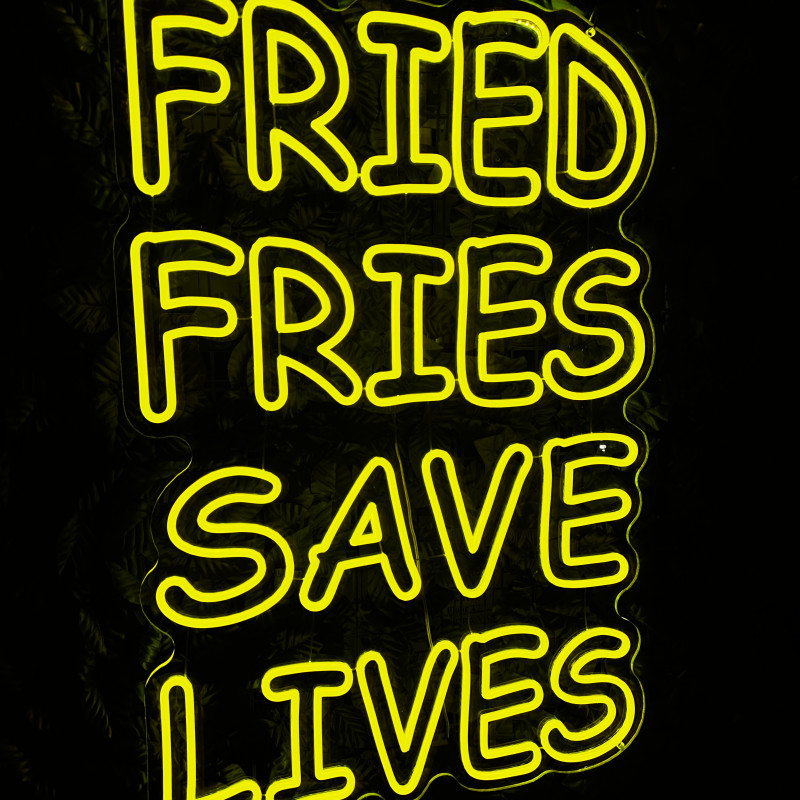 Mr. Paco este un brand de fast-food axat pe preparate din pui, cartofi prăjiți și meniuri pentru servire rapidă. Pentru ei am realizat semnul luminos FRIED FRIES SAVE LIVES, gândit ca ancoră de identitate la tejghea, în zona de servire sau ca photo spot. Profil subțire, lumină uniformă, montaj curat; complet personalizabil (dimensiuni, culori, finisaje) pentru integrare în designul locației.