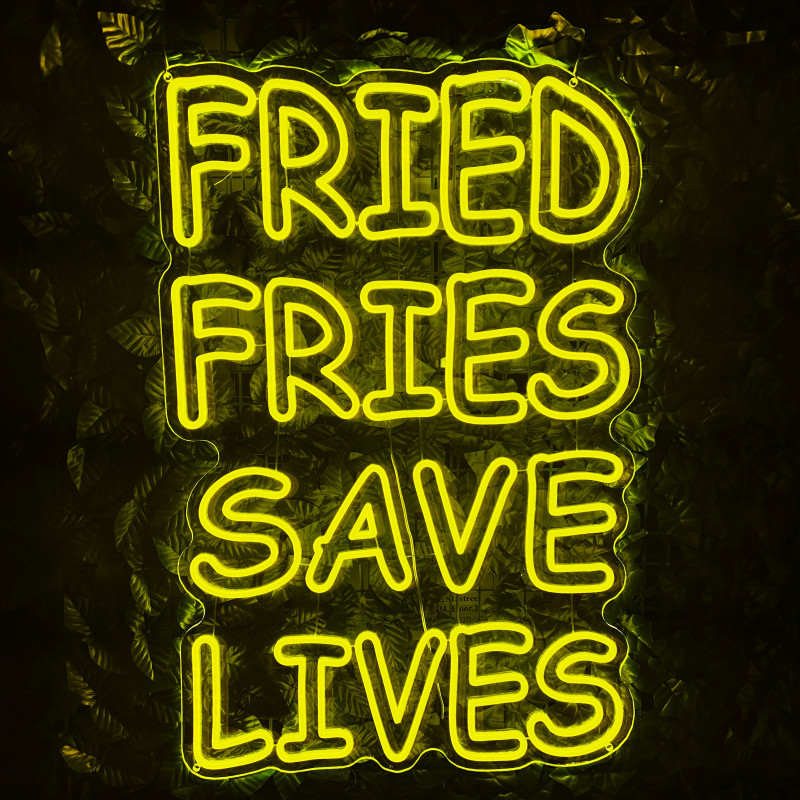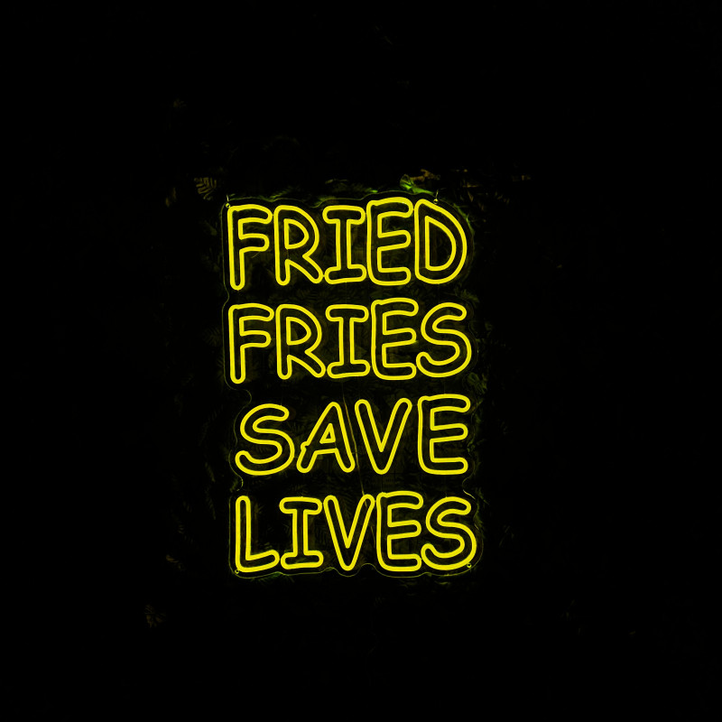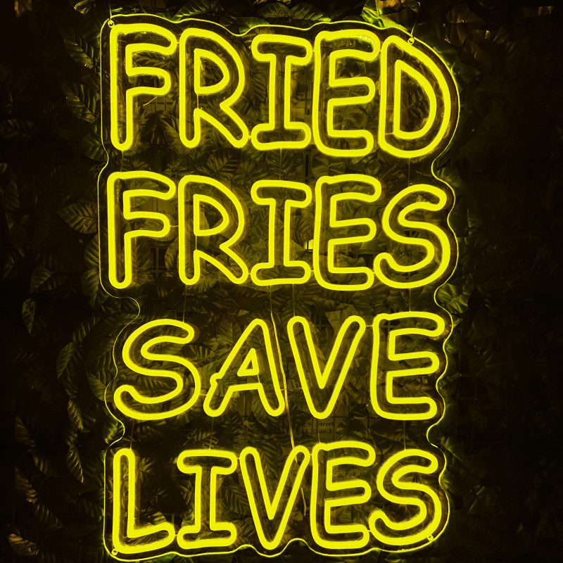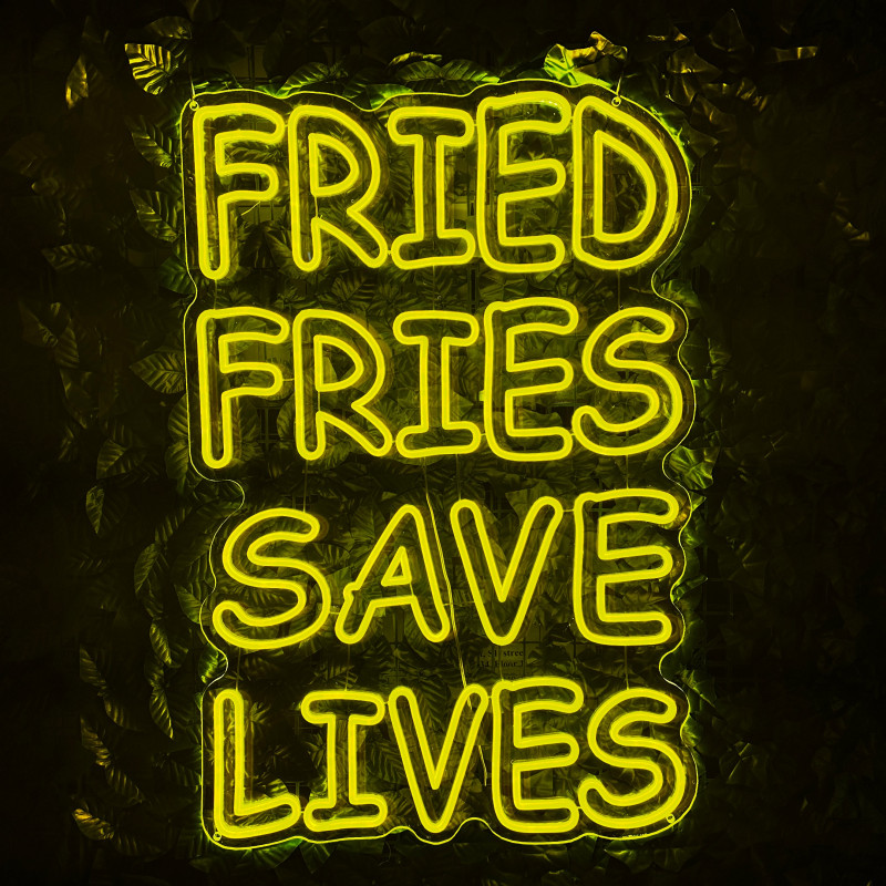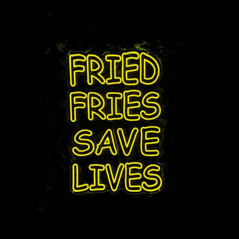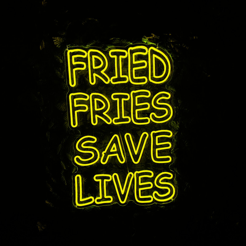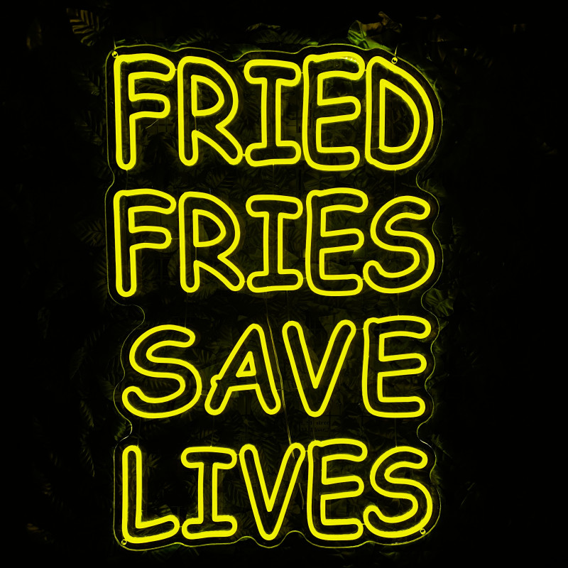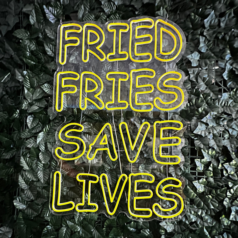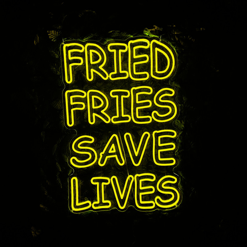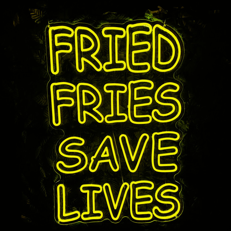 Mr. Paco este un brand de fast-food axat pe preparate din pui, cartofi prăjiți și meniuri pentru servire rapidă. Pentru ei am realizat semnul luminos FRIED FRIES SAVE LIVES, gândit ca ancoră de identitate la tejghea, în zona de servire sau ca photo spot. Profil subțire, lumină uniformă, montaj curat; complet personalizabil (dimensiuni, culori, finisaje) pentru integrare în designul locației.