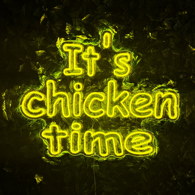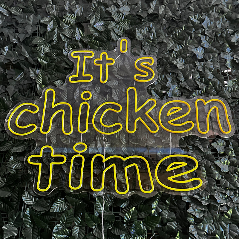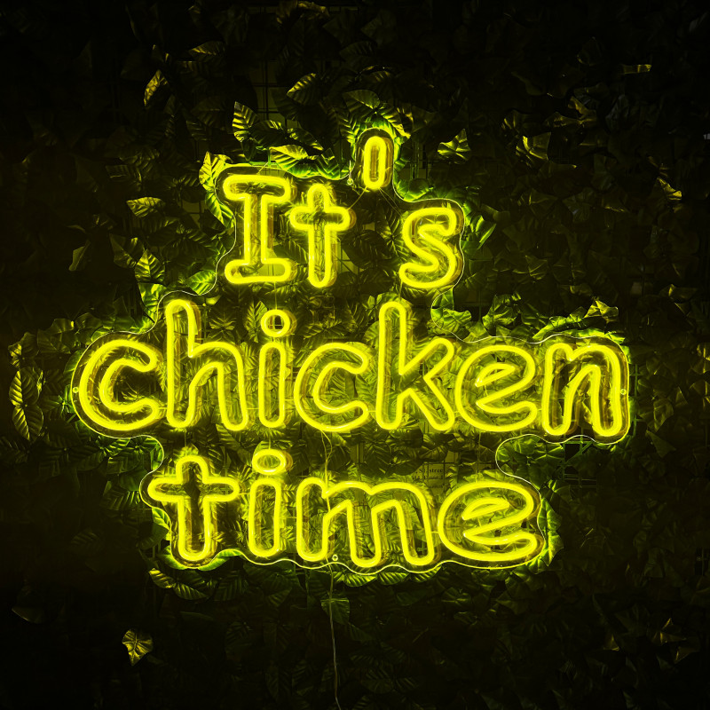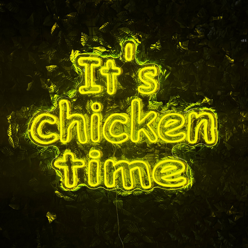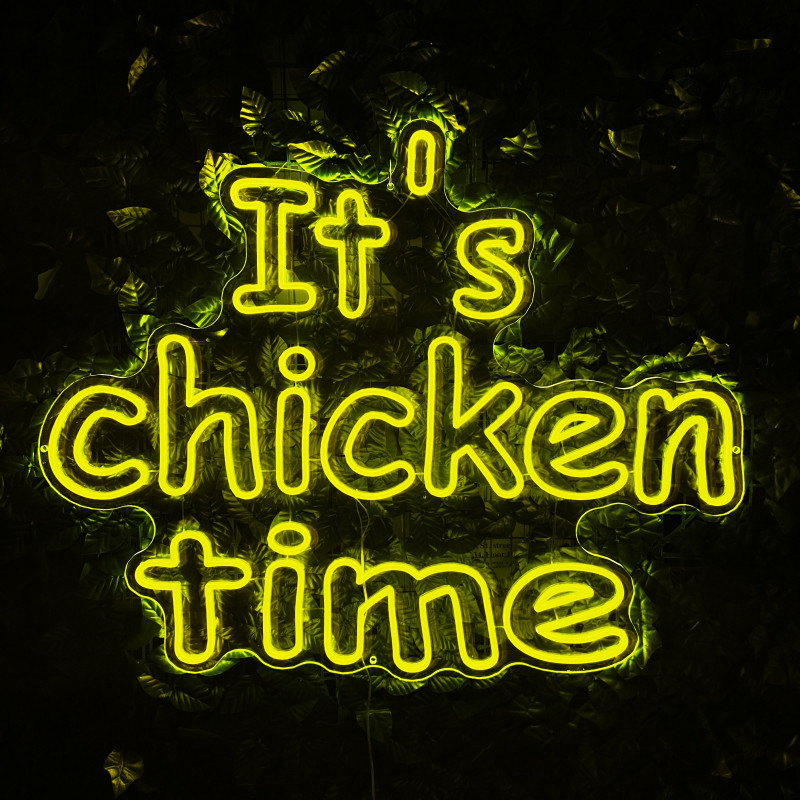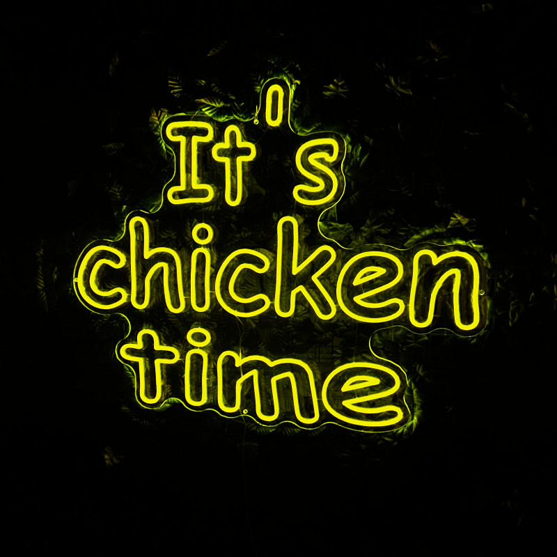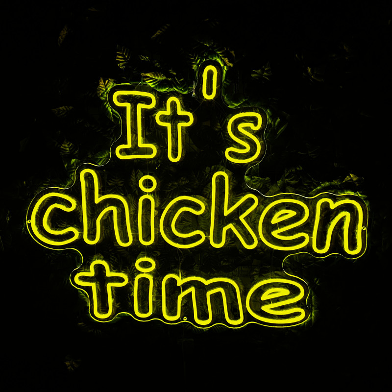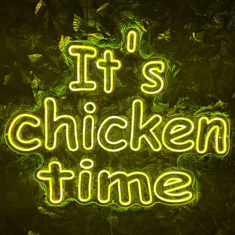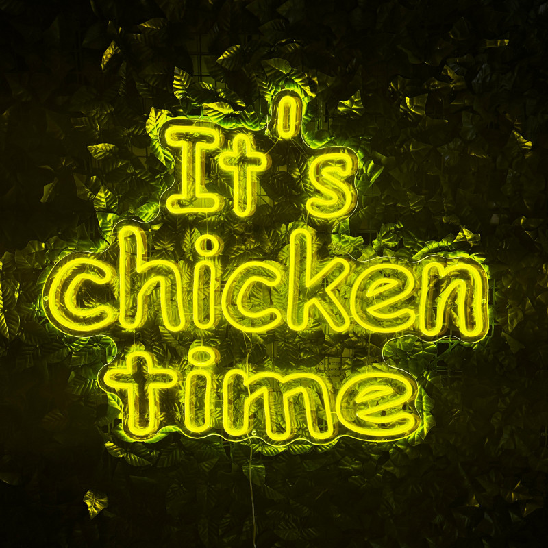 Mr. Paco ist ein Fast-Food-Brand in Arad mit Crispy-Chicken, Wings, Burgern und Shawarma sowie Online-Bestellung und Lieferung. Das It's chicken time-Leuchtschild dient als Brand-Anker am Ausgabebereich und als Fotospot — schlanke Bauweise, gleichmäßige Ausleuchtung, saubere Montage; anpassbar in Größe, Farben und Finish.