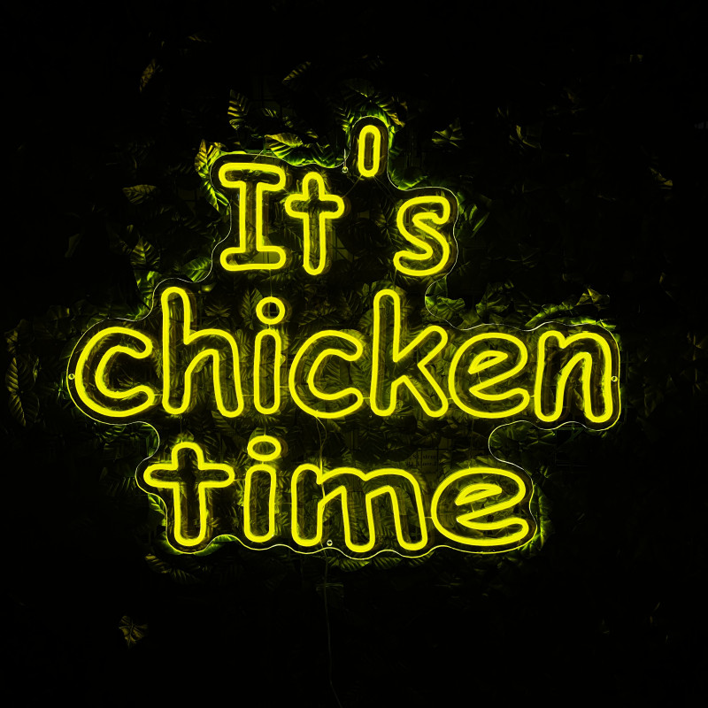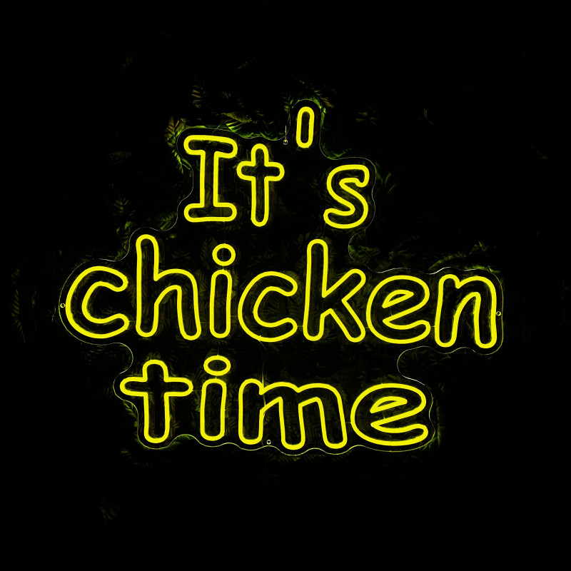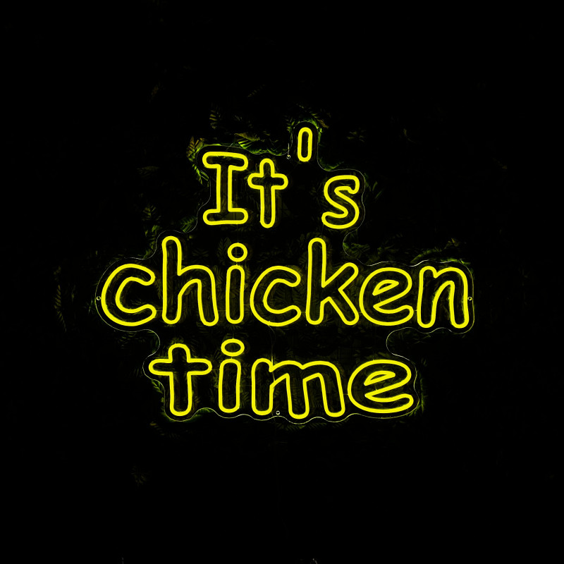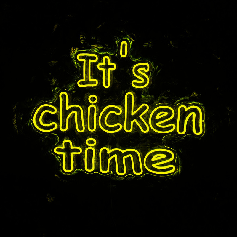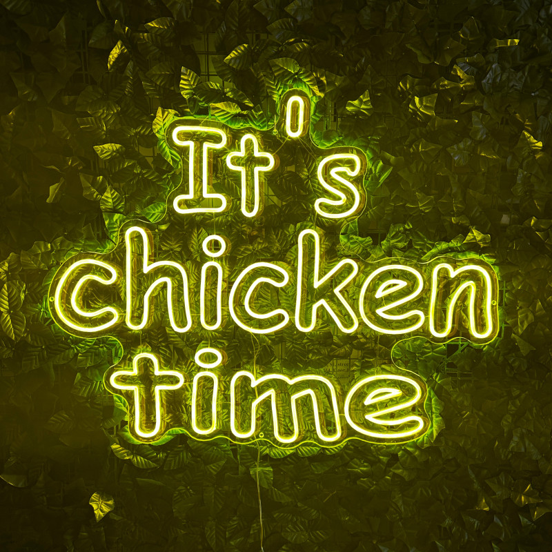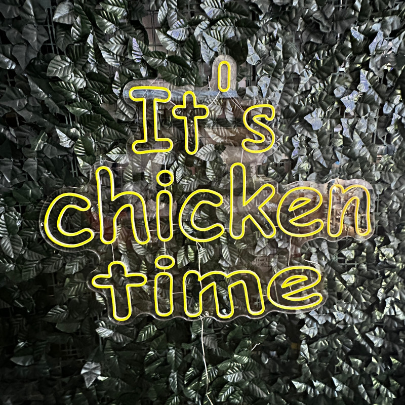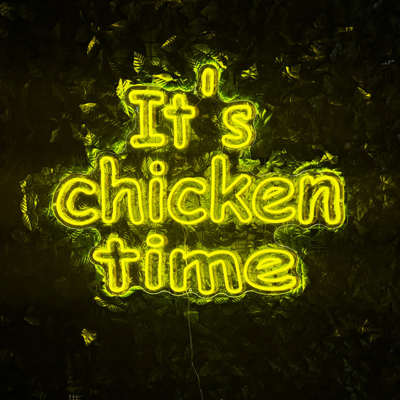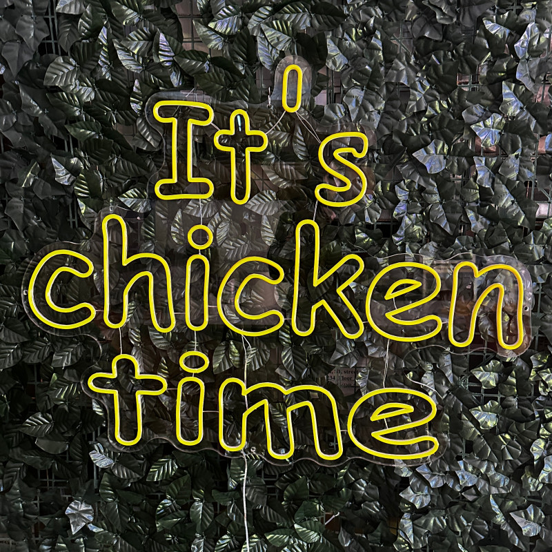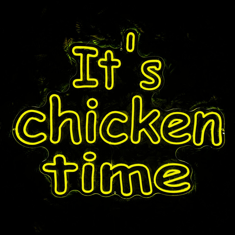 Mr. Paco ist ein Fast-Food-Brand in Arad mit Crispy-Chicken, Wings, Burgern und Shawarma sowie Online-Bestellung und Lieferung. Das It's chicken time-Leuchtschild dient als Brand-Anker am Ausgabebereich und als Fotospot — schlanke Bauweise, gleichmäßige Ausleuchtung, saubere Montage; anpassbar in Größe, Farben und Finish.