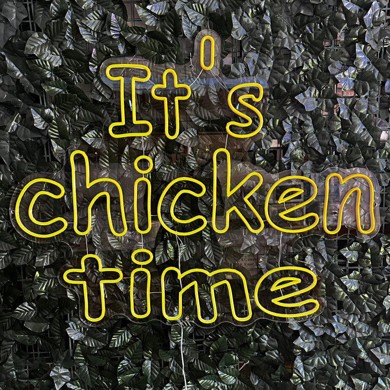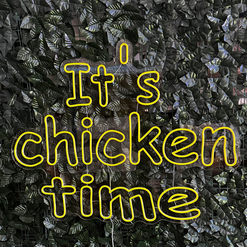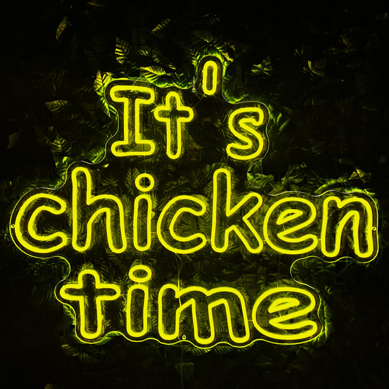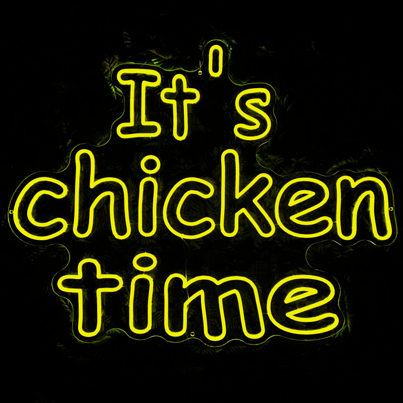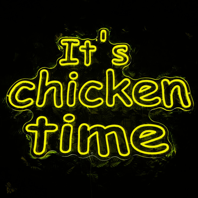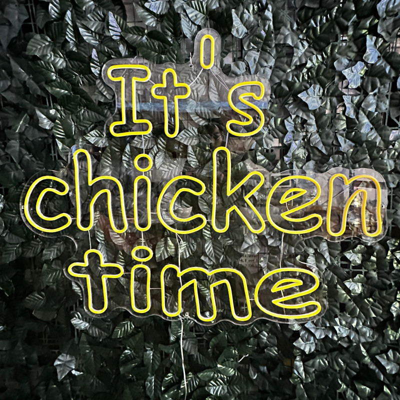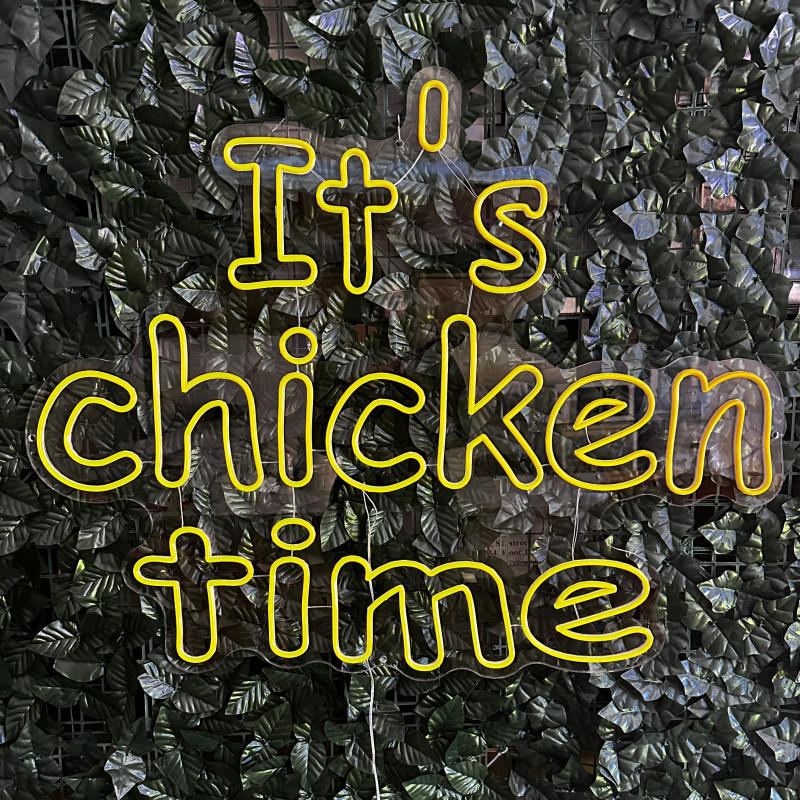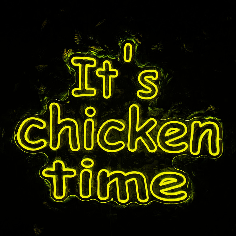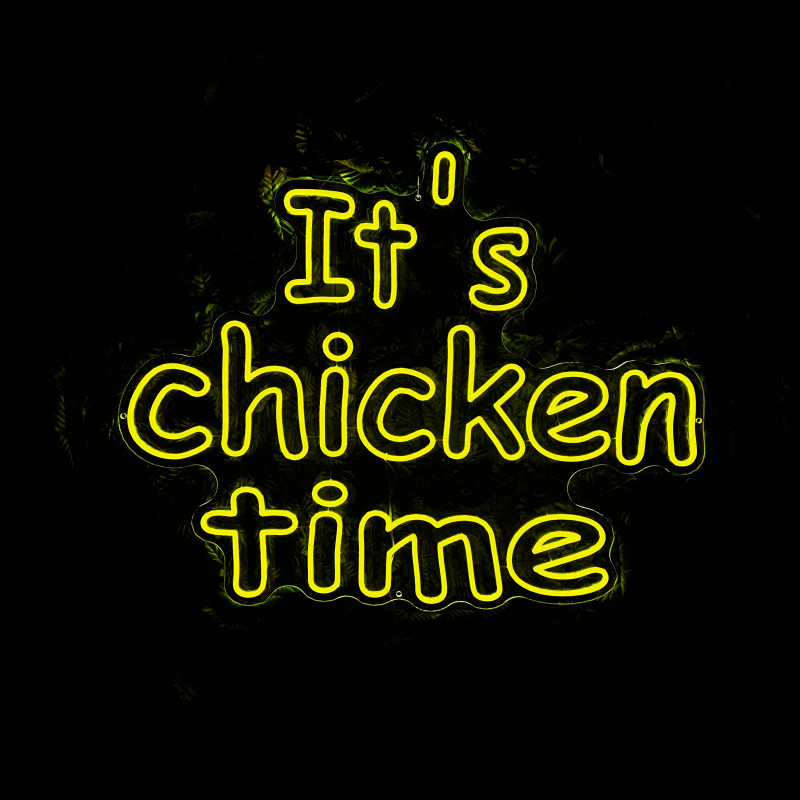 Mr. Paco ist ein Fast-Food-Brand in Arad mit Crispy-Chicken, Wings, Burgern und Shawarma sowie Online-Bestellung und Lieferung. Das It's chicken time-Leuchtschild dient als Brand-Anker am Ausgabebereich und als Fotospot — schlanke Bauweise, gleichmäßige Ausleuchtung, saubere Montage; anpassbar in Größe, Farben und Finish.
