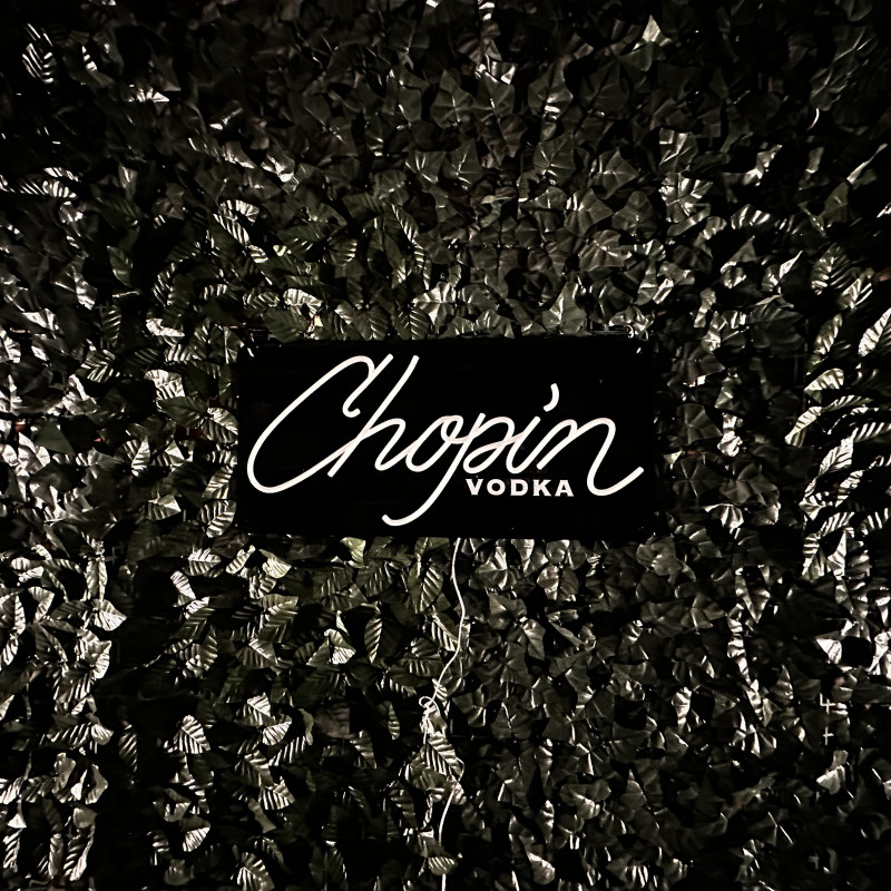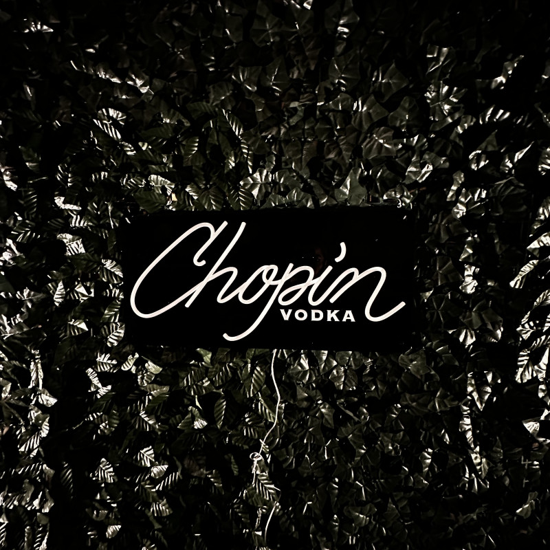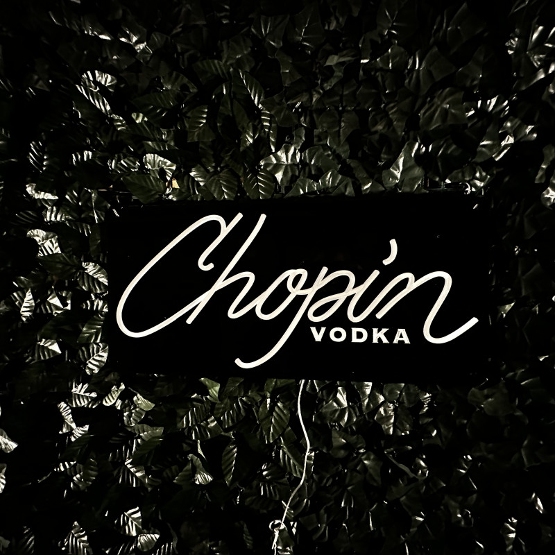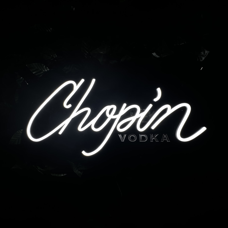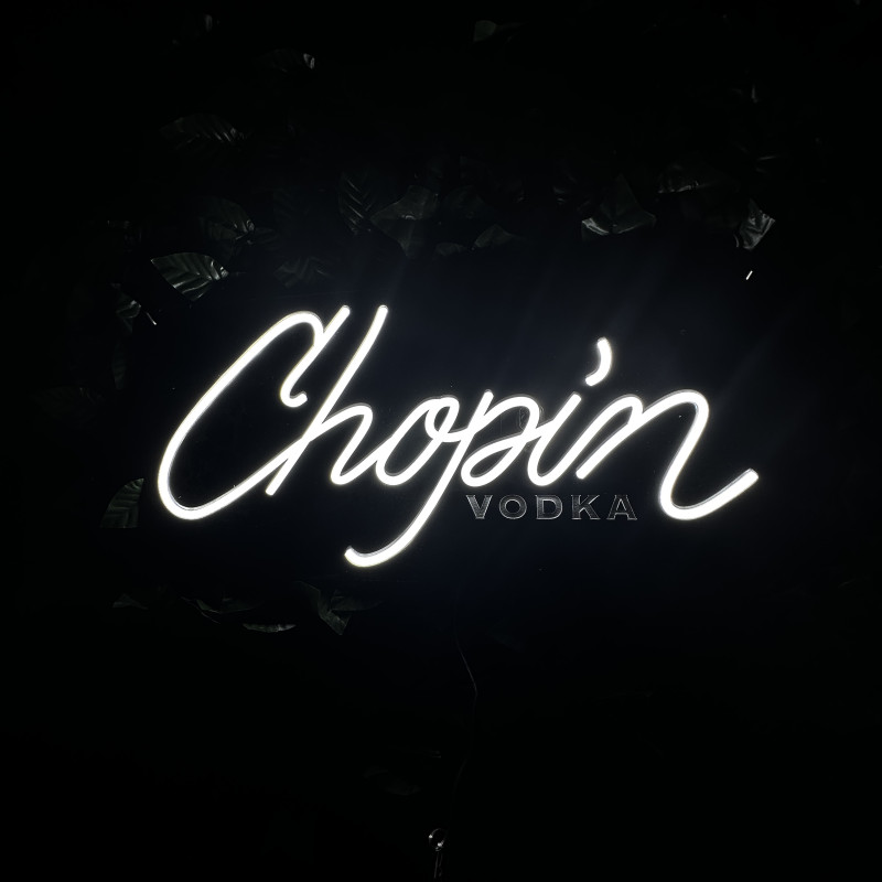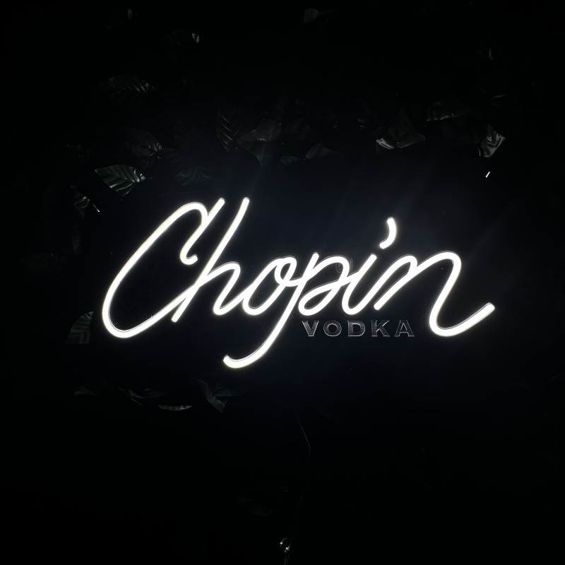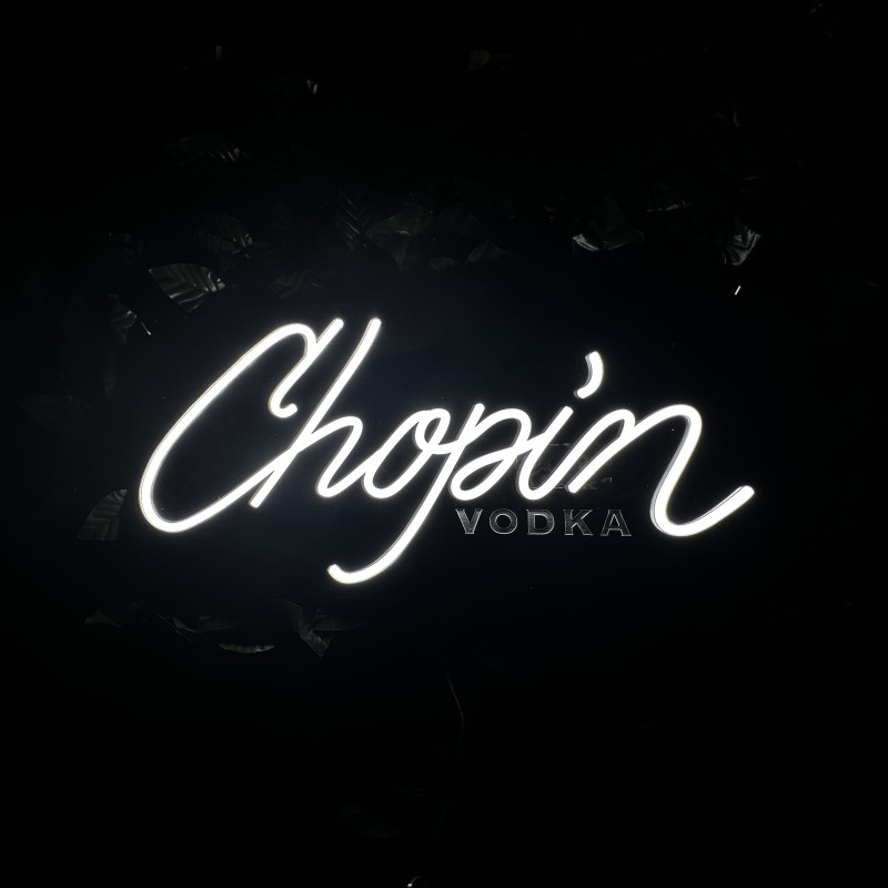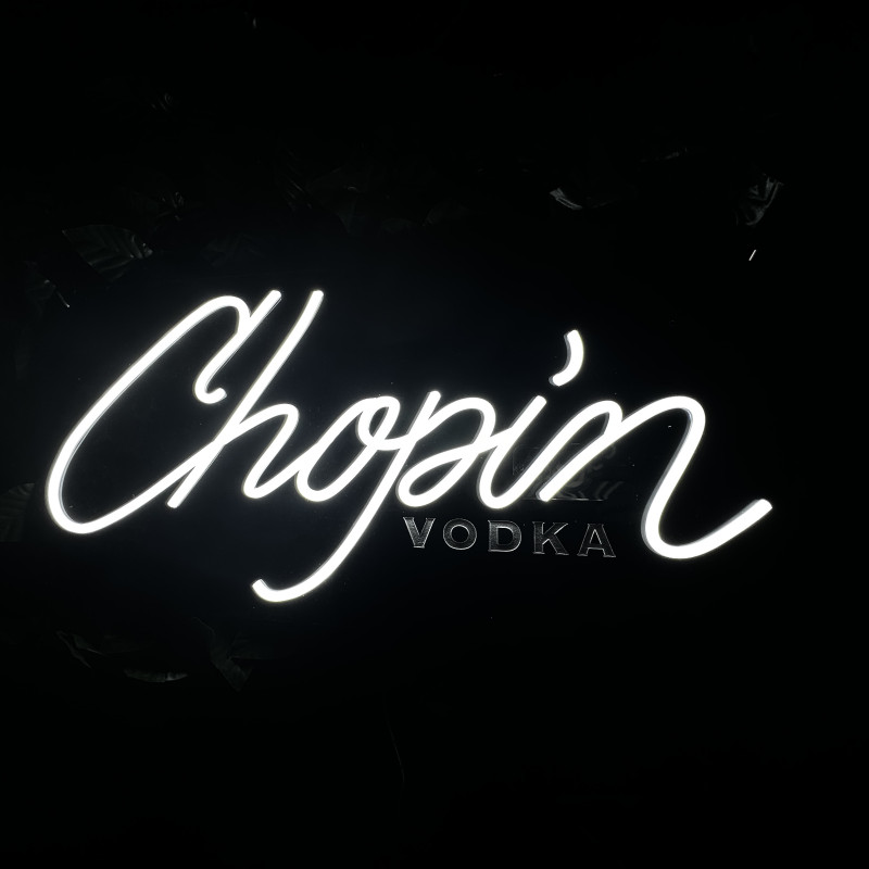 Designed for premium visibility on bar, back-bar, window display, or photo spot. “Chopin vodka” delivers a clean outline and uniform glow—ideal for photo/video and event activations. Slim build, discreet mounting, low maintenance. Quickly customizable in size, colors, and finishes, or adaptable to other names/logos without losing impact.