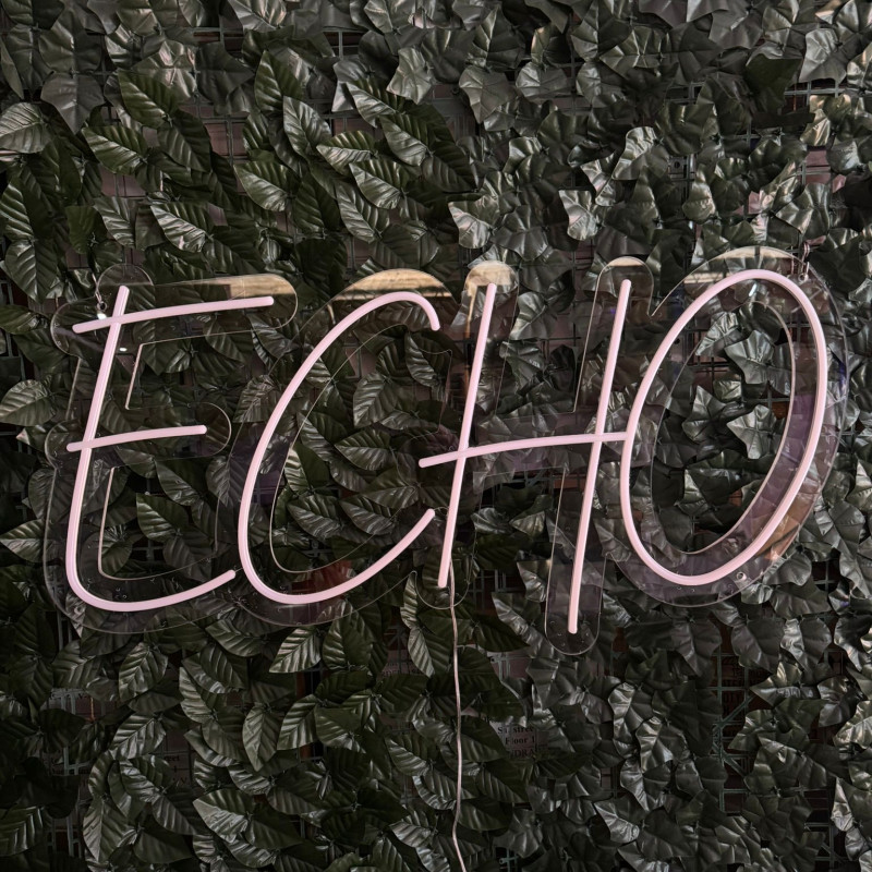 The ECHO text measures 900 x 460 mm. The cup symbol measures 480 x 600 mm. Each element is irregularly cut following its contour.