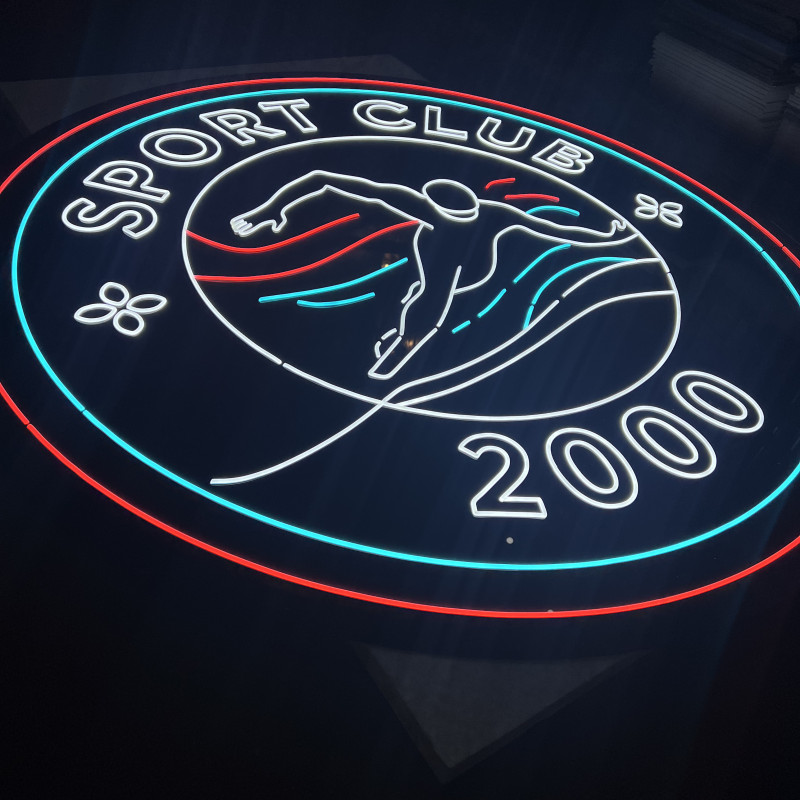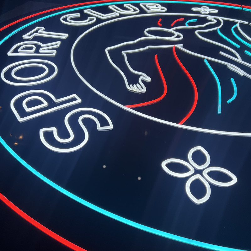 The "Sport Club 2000" sign measures 200 cm in diameter and is crafted on a black plexiglass base, irregularly cut to the circular graphic shape. Illumination is provided by LED strip chips in cool white, orange, and cyan, covered with white silicone for a sharp contour. The system includes a remote control with a dimmer and a kit of 12 metal spacers for stable wall mounting.