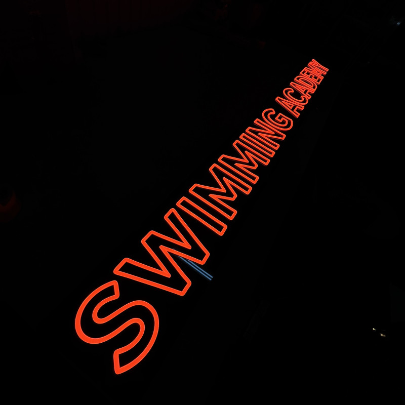 The "Swimming Academy" sign is 250 cm long and 24 cm high, features a regular cut on a black plexiglass base. The lighting is designed for high contrast and long-distance readability. It includes a remote control with a dimmer and a kit of 6 metal spacers.