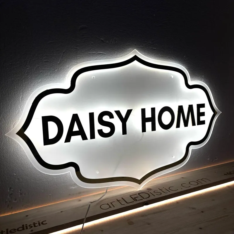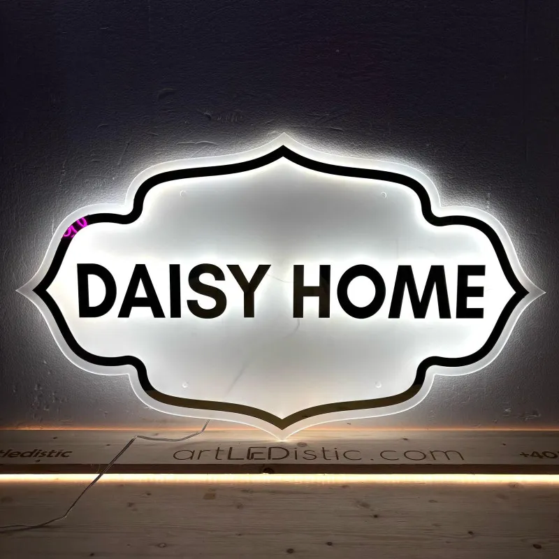 The “Daisy Home” LED sign, designed for a gift and floral decoration shop, is made of frosted transparent plexiglass, giving it an elegant and diffused appearance. The cool white illumination adds a modern, clean look—ideal for a welcoming and refined space. The name “Daisy Home” is highlighted with golden mirror plexiglass letters, creating a luxurious and radiant contrast. The subtle combination of matte and glossy finishes offers a premium aesthetic, perfect for a concept store that values elegance, detail, and refined taste.