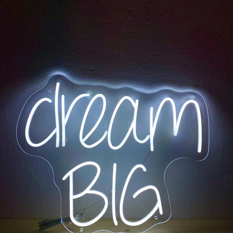 The "Dream Big" light sign is a bright affirmation of aspirations and bold dreams, embedded in an eye-catching display on a clear Plexiglas plate. Illuminated in a cool white, this sign emits a clear and vibrant light, giving a cool and modern feel.