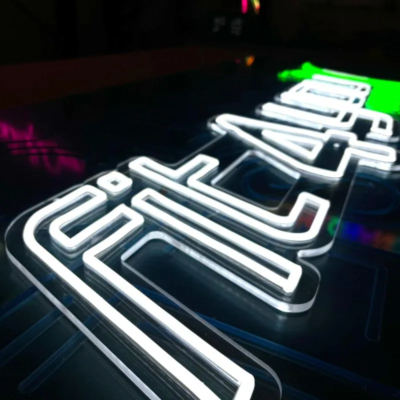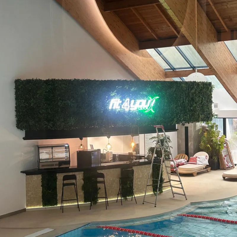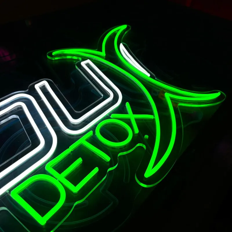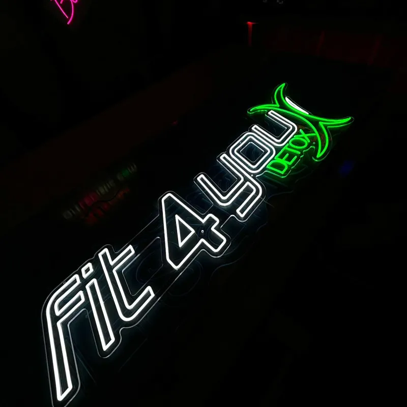 The "Fit 4 You Detox" light sign is made of transparent plexiglass, highlighted by a harmonious combination of cool white and green lighting. The main text 'Fit 4 You' is illuminated in an elegant cool white shade, suggesting clean, fresh and modern, while 'Detox' is highlighted with a vibrant green light. The transparent Plexiglas allows the sign to blend seamlessly into any decor, giving a subtle yet elegant effect. This sign is ideal for wellness centers, gyms or health spaces, perfectly reflecting a balanced and modern lifestyle.
