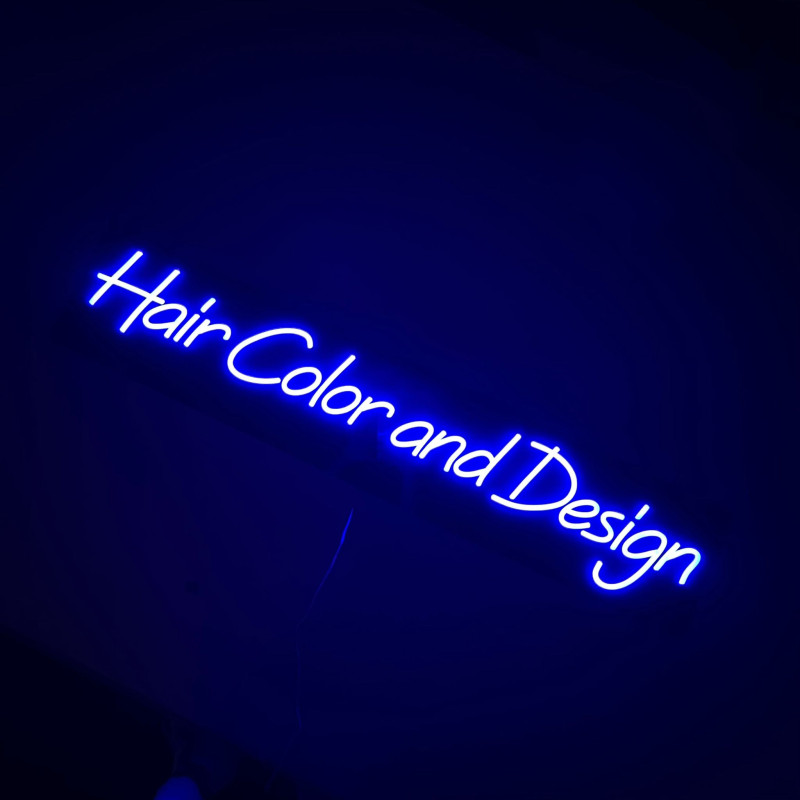 Hair Color and Design is an indoor luminous sign created to highlight the elegance and style of a brand. A blue LED strip, covered with white silicone, was chosen to provide an intense and uniform light. The Beachfront font adds a creative and modern touch, while the mounting on black plexiglass ensures contrast and visibility.