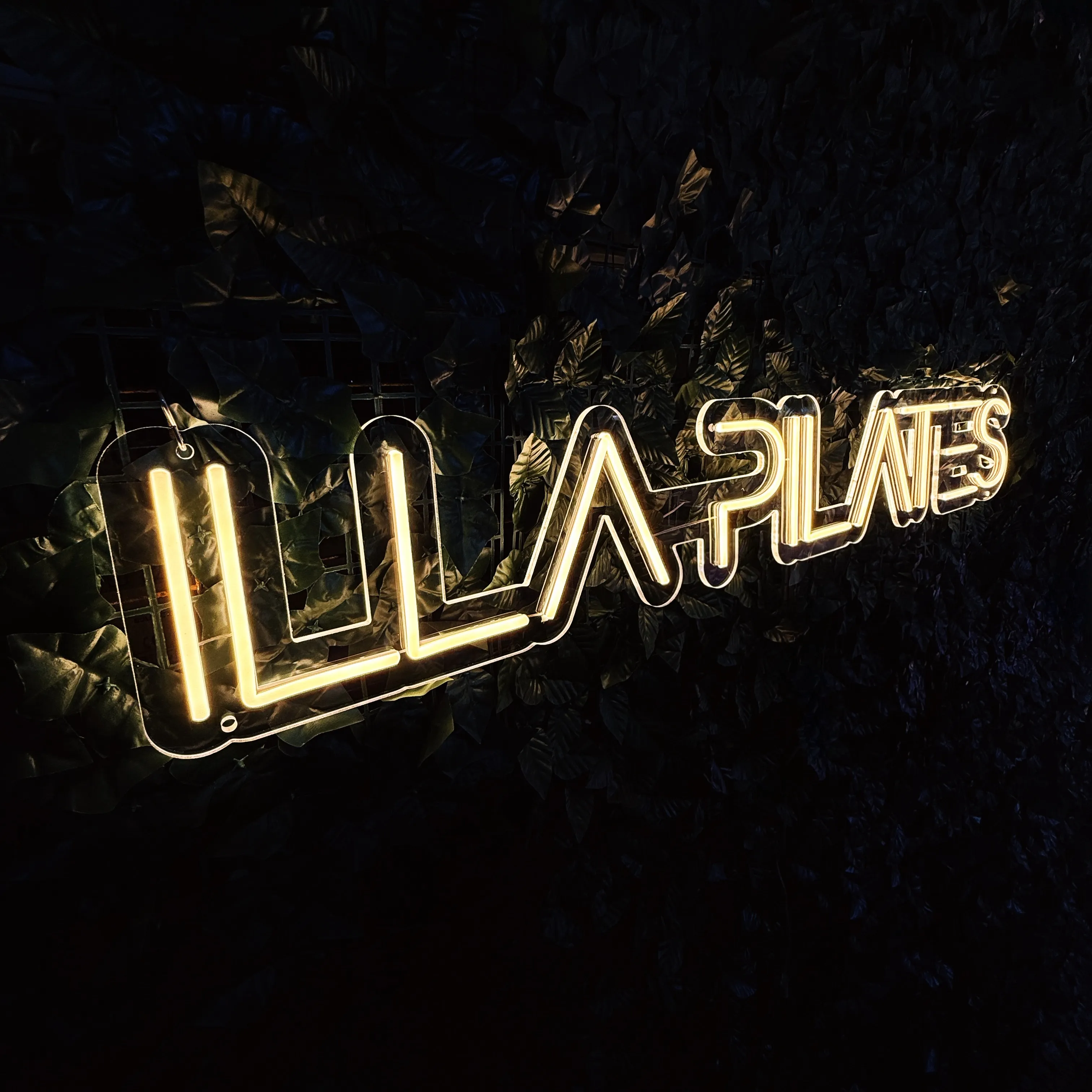 Custom LED neon sign “ILLA PILATES”, designed for indoor use, created to clearly highlight your brand and build a strong visual focal point in fitness, studio or wellness spaces.