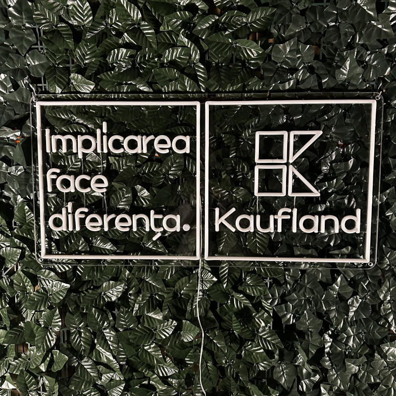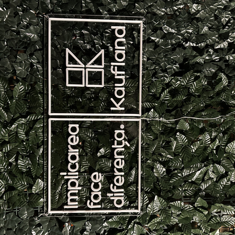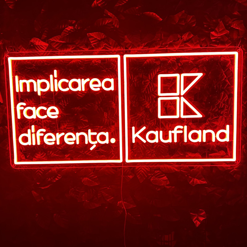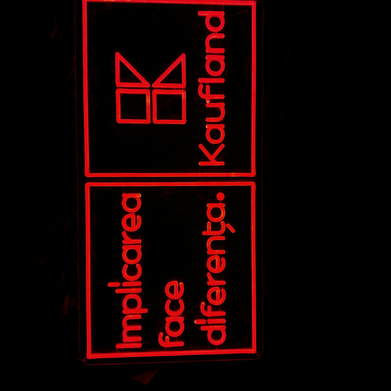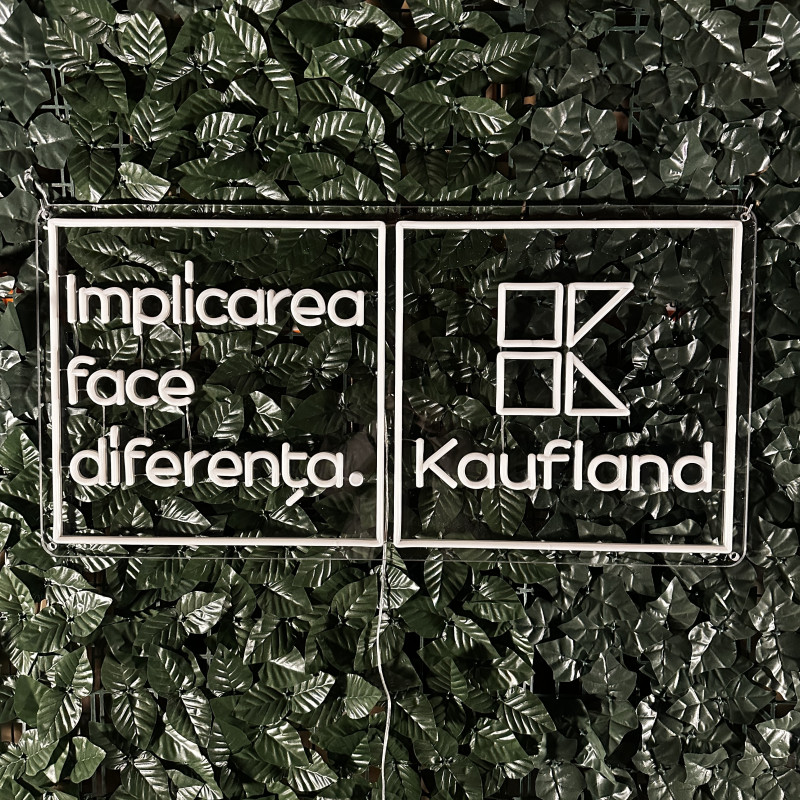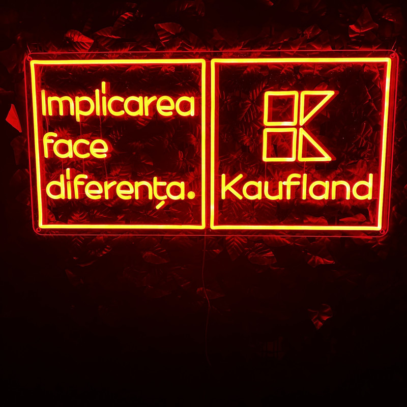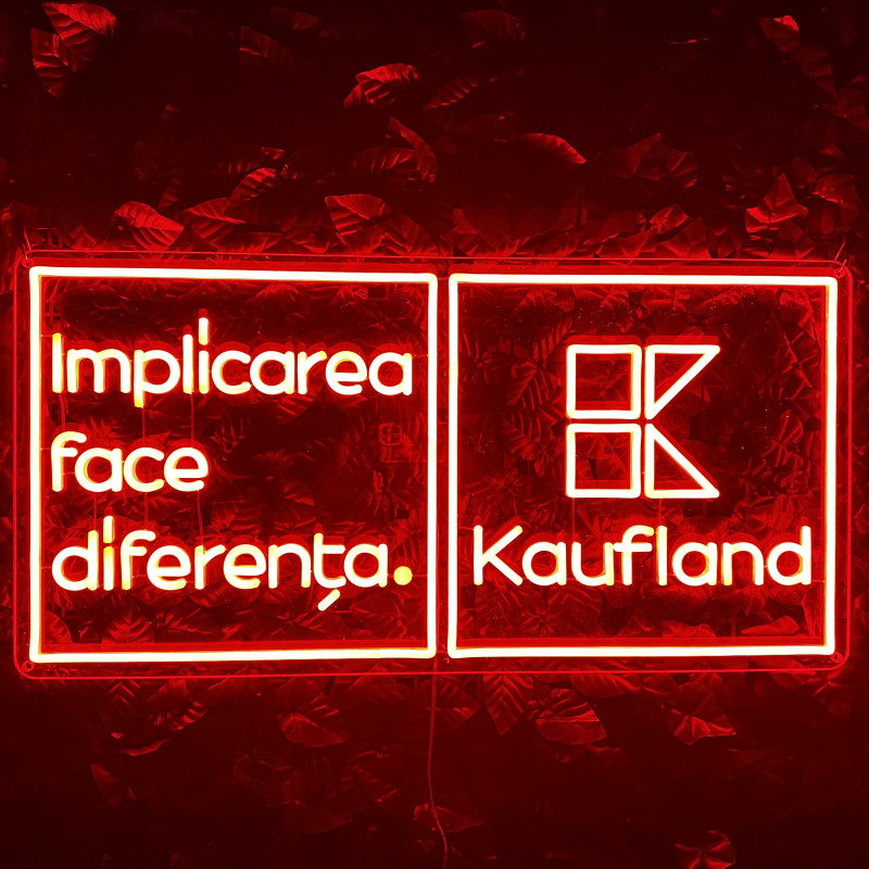 A project delivered for Kaufland a leading national retailer, centered on the message “Implicarea face diferența” (“Involvement makes the difference”). The lighted sign emphasizes clarity and instant recognition, working as a visual landmark in high-traffic areas (entrance, reception, campaign wall, info point). Slim build, energy-efficient, clean mounting, and uniform glow—made to look impeccable in photos/videos and support brand communications (CSR, community initiatives, internal campaigns). Easily customizable in size, colors, finishes, and integration with existing graphics.
