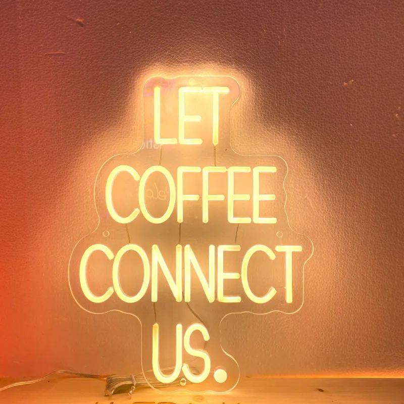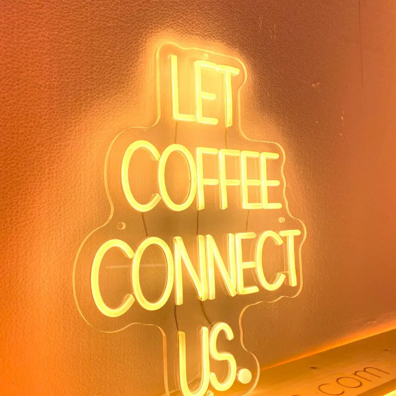 The clear Plexiglas provides a clean and elegant look, allowing light to pass through the cut-out letters. The "Let coffee connect us" message is illuminated with warm white LEDs with a color temperature between 2700 and 3000K. This provides a soft and pleasant light, perfect for creating a cozy ambience in cafes, meeting rooms or workspaces.