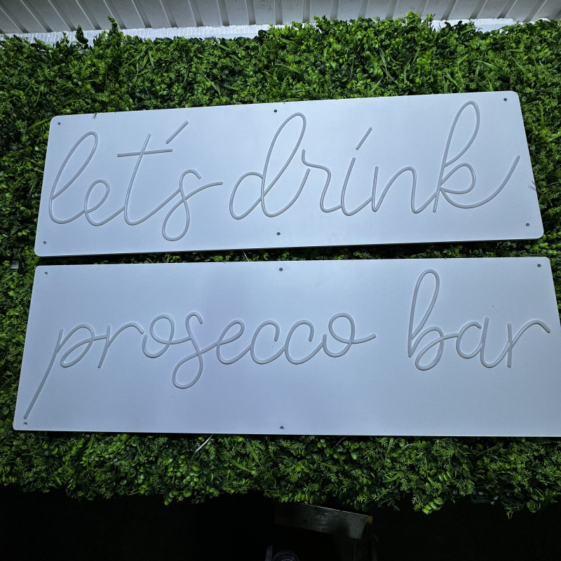 The duo that sets the mood. “Let’s drink” brings a clear invite to socialize; “Prosecco bar” pins the serving spot as a memorable photo corner. Slim, visible, and easy to install, the two signs work together for bars, events, pop-ups, or at home—and can be quickly adapted in size, fonts, and colors, or replaced with other words without losing impact.