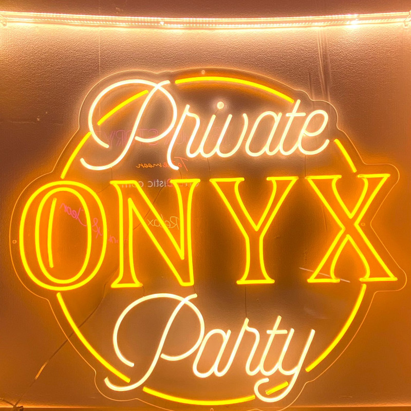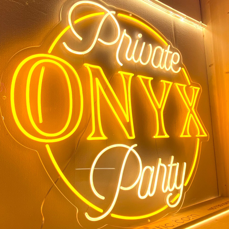 The transparent Plexiglas provides a clean and modern look, allowing light to pass through the lettering of the 'Private Onyx Party' inscription. The warm white and yellow LEDs are arranged to illuminate the message evenly, ensuring excellent visibility and an elegant visual impact. The warm white color, with a color temperature between 2700 and 3000K, creates a soft and comfortable light, while the yellow adds a vibrant and festive touch.