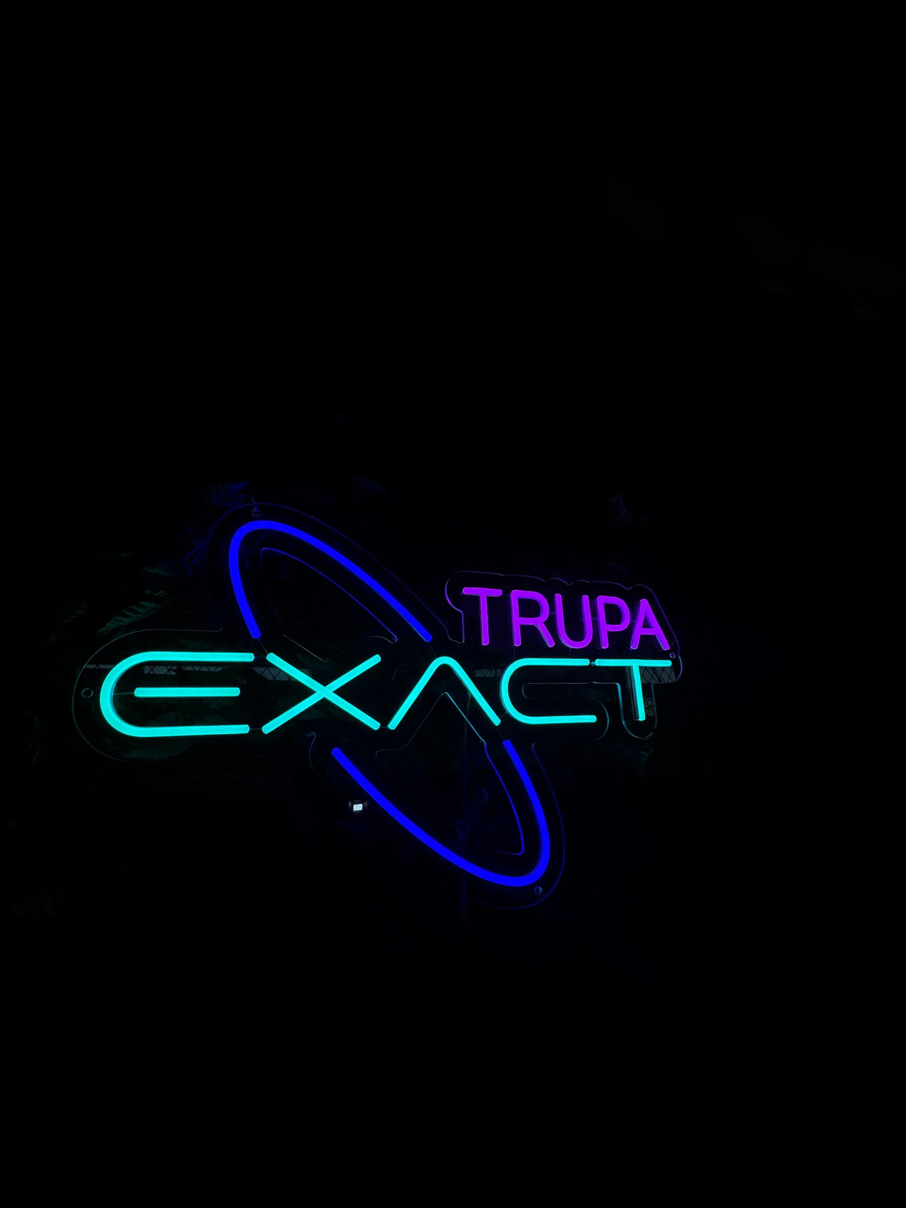 The LED sign “Trupa Exact”, created by artLEDistic, delivers a dynamic visual effect through a mix of purple, cyan and blue, enhanced by white silicone tubing. The design combines text and graphic elements for strong visibility.