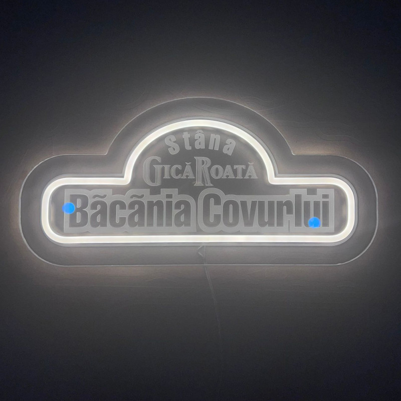 Le projet pour Stâna Gică Roată comprend la réalisation de deux enseignes lumineuses personnalisées, chacune conçue pour refléter l’identité du lieu. Les deux modèles sont fabriqués en plexiglas transparent gravé, avec un éclairage LED blanc chaud qui diffuse une lumière agréable et équilibrée. Découpées de manière irrégulière selon la forme de l’enseigne, elles conservent un aspect authentique et soigné. Conçues pour une utilisation intérieure, ces enseignes apportent raffinement et visibilité, tout en complétant l’atmosphère rustique et accueillante de la marque Gică Roată.
