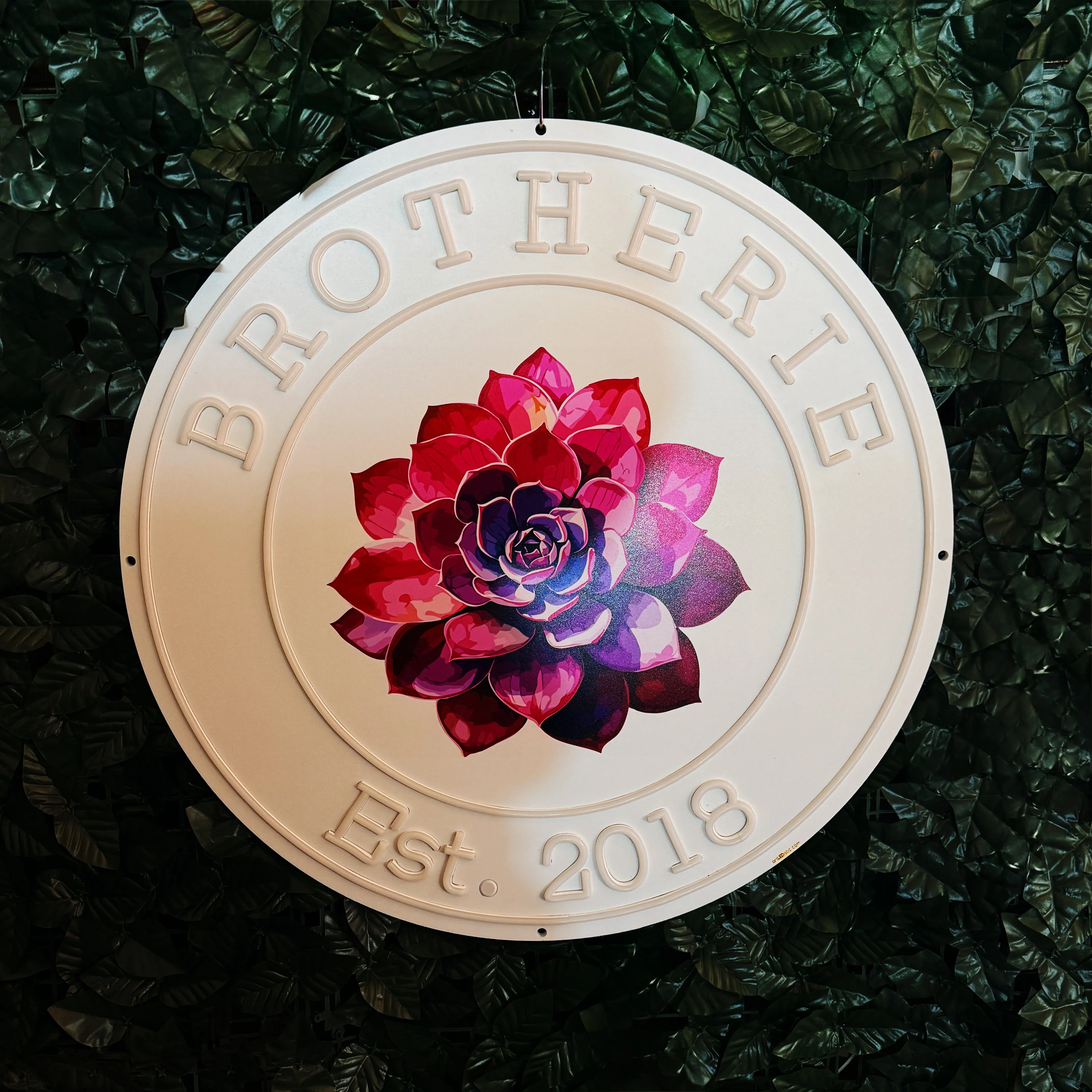Le design combine l’éclairage LED avec une impression centrale de haute qualité. L’élément graphique floral est imprimé directement sur le support et devient le point principal d’attention. La lumière blanc chaud souligne la forme circulaire et met en valeur le texte, en offrant un effet uniforme et agréable.