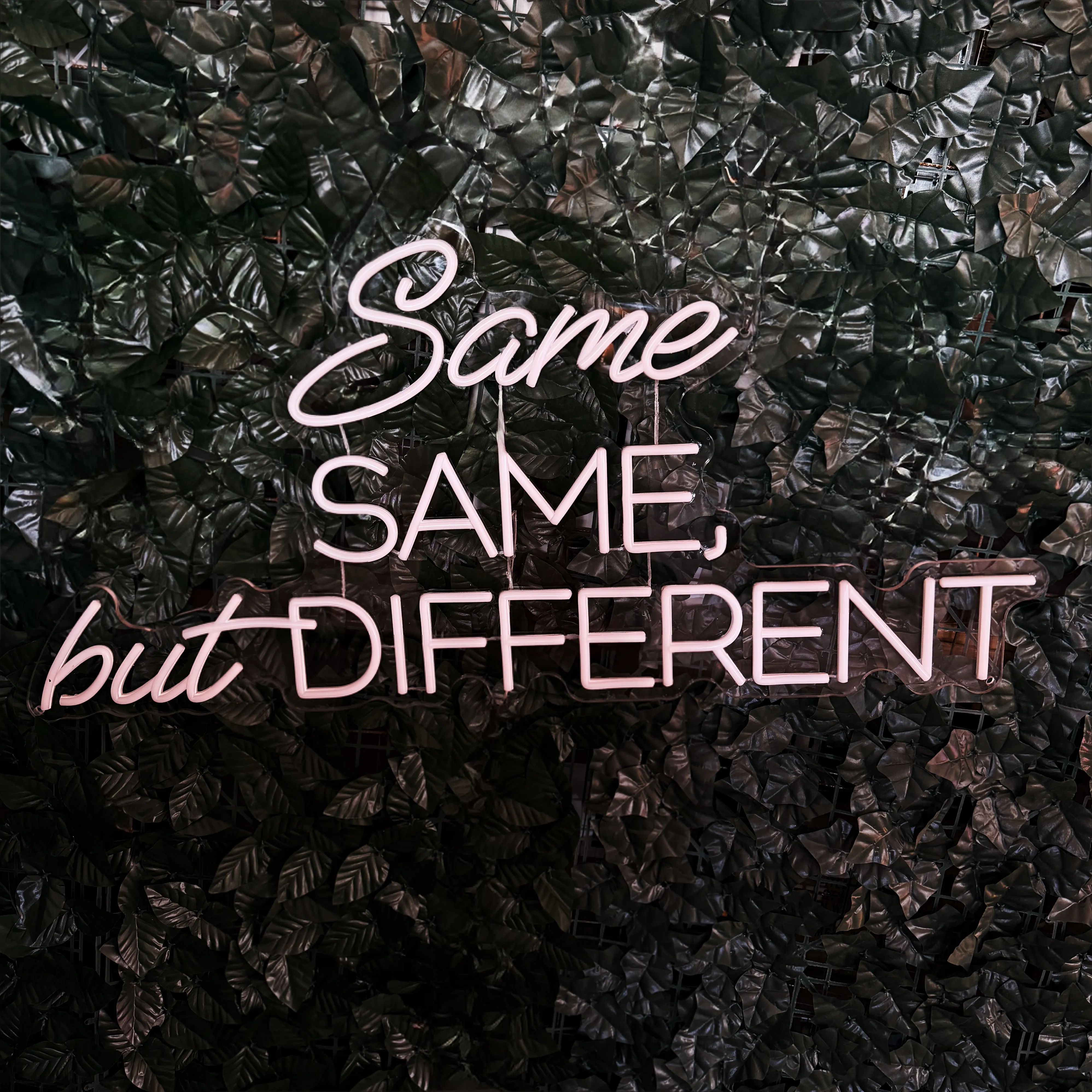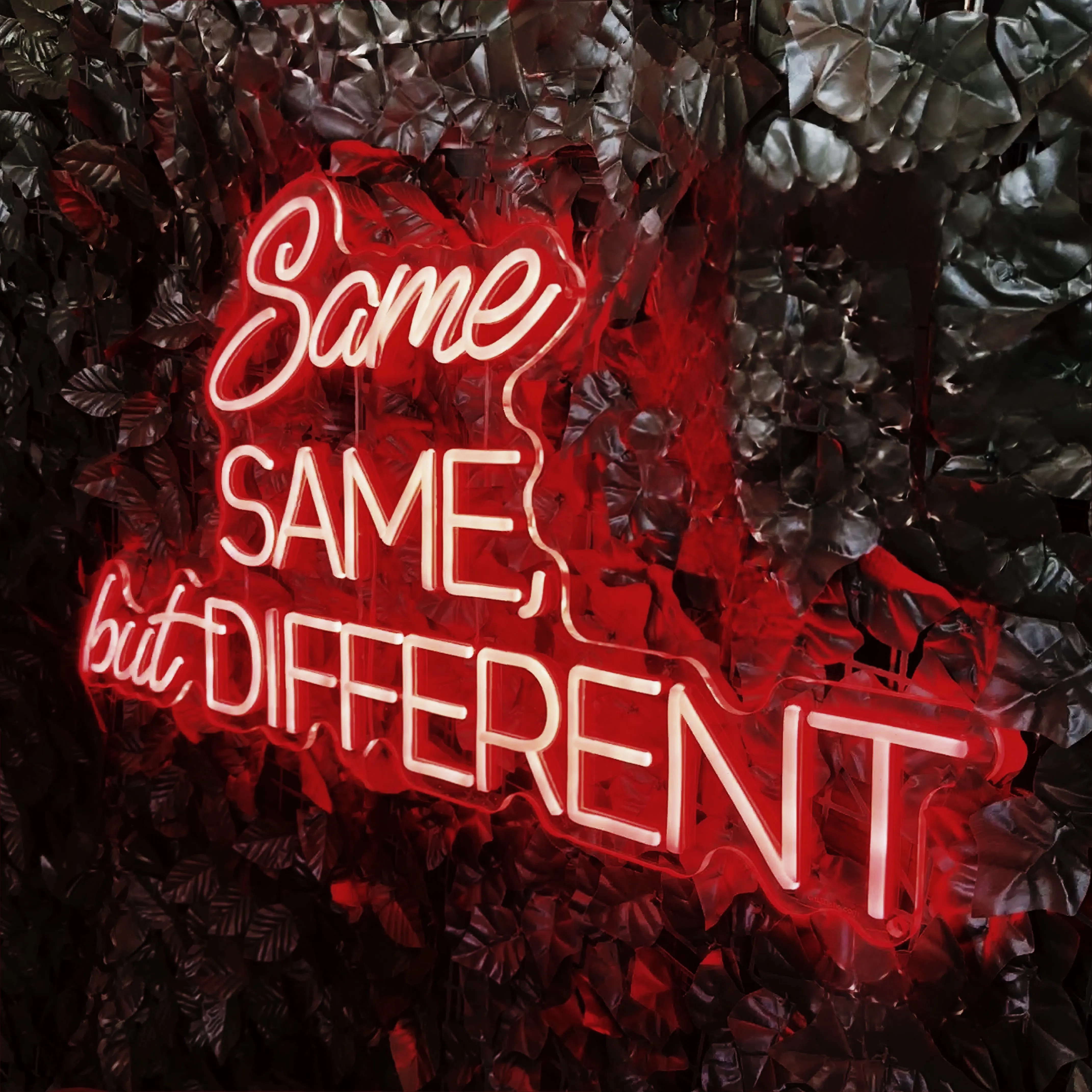 L’enseigne lumineuse LED « Same Same, but Different » attire l’attention grâce au contraste fort entre le message et l’éclairage intense. Le texte est disposé sur plusieurs lignes, avec une combinaison de polices qui crée un aspect dynamique et facile à remarquer. Elle convient aux espaces comme les bars, restaurants ou zones de socialisation, où le décor visuel joue un rôle important.