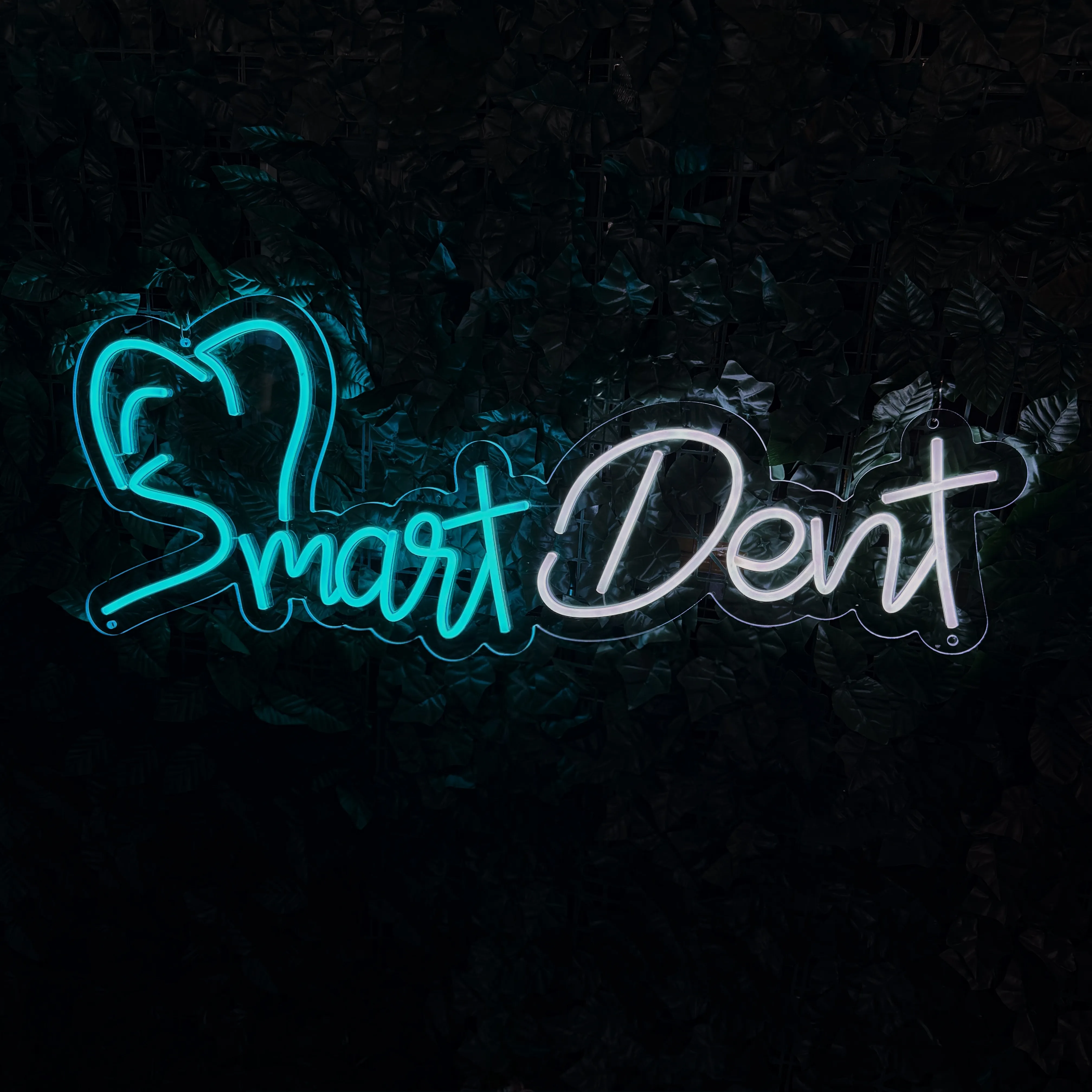 L’enseigne lumineuse LED « Smart Dent » attire immédiatement l’attention grâce à une combinaison claire de couleurs et un design personnalisé, adapté à un espace médical moderne. Le texte en écriture cursive est complété par un symbole graphique en forme de dent, qui transmet rapidement le domaine d’activité et crée un impact visuel fort.