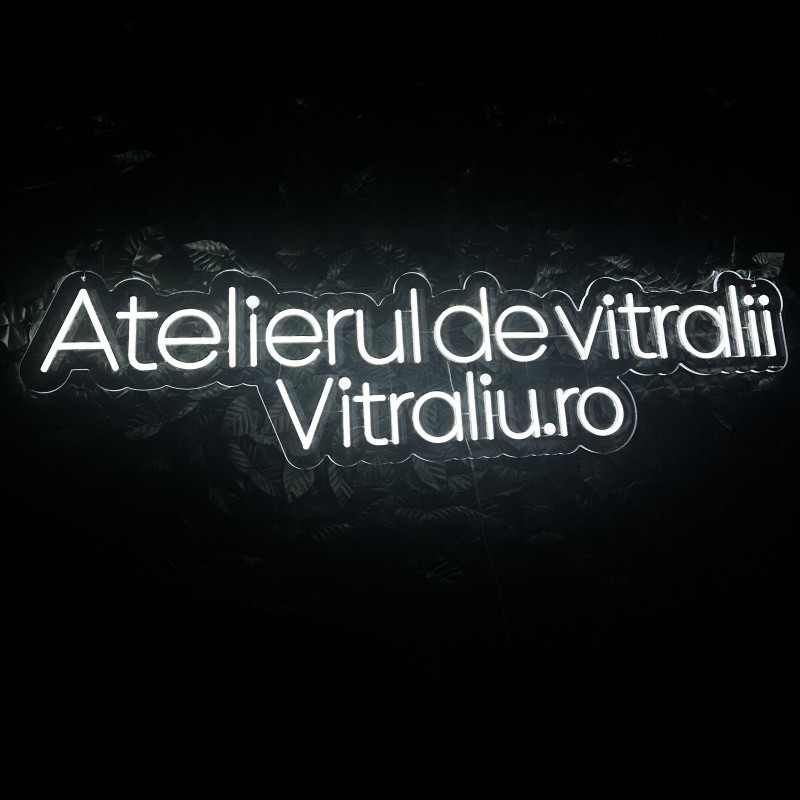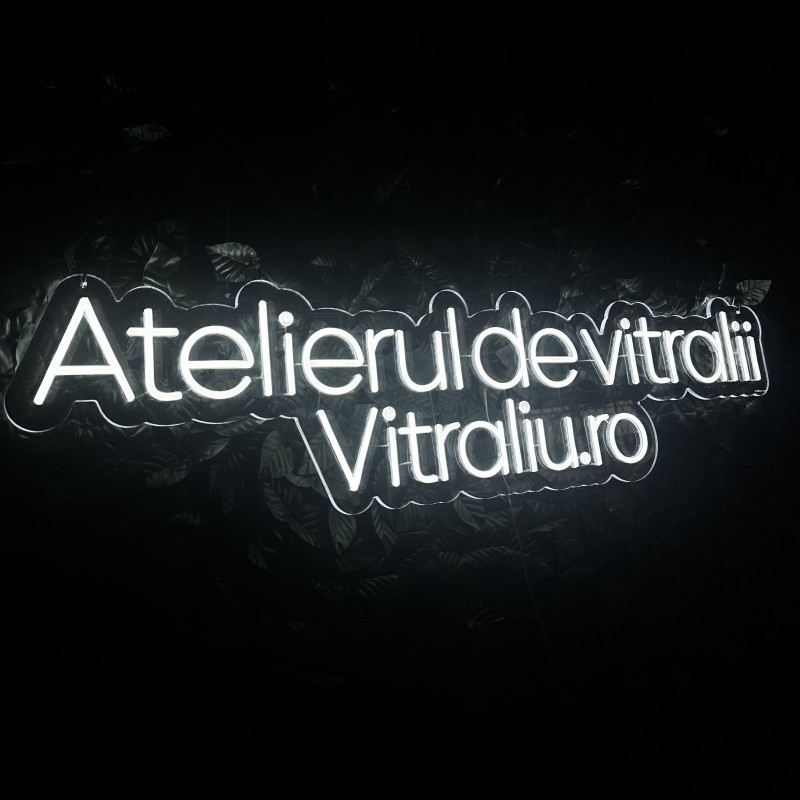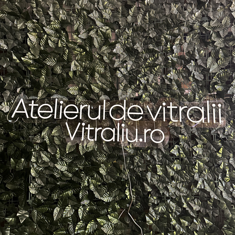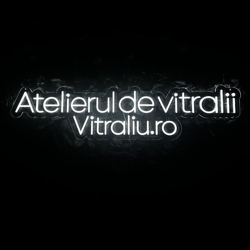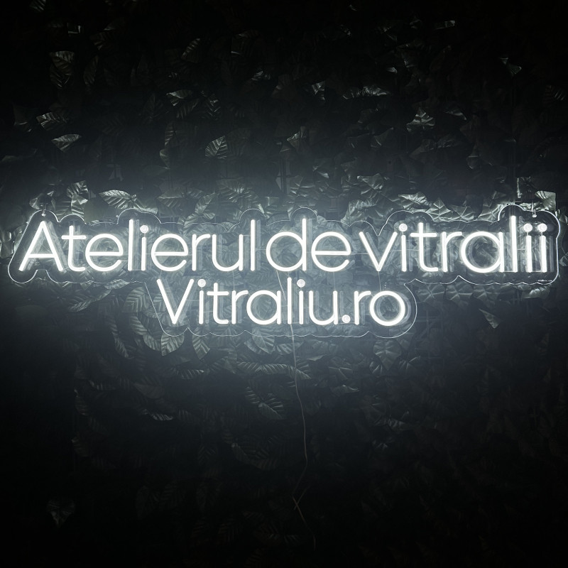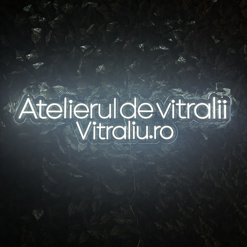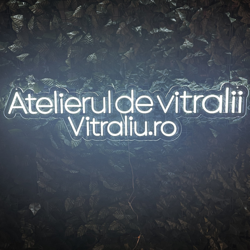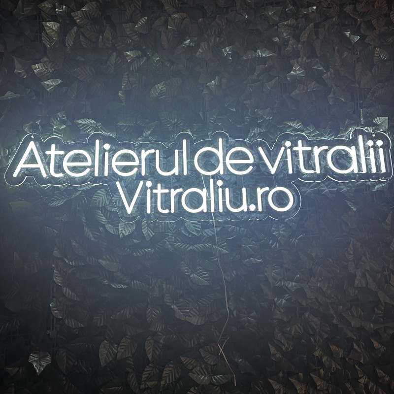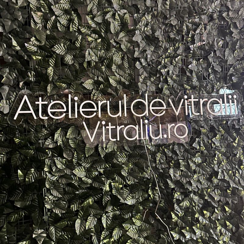 Pentru ei am creat semnul luminos „Atelierul de vitralii — Vitraliu.ro”, gândit ca ancoră de identitate pentru fațadă, recepție, showroom sau brand wall: profil subțire, lumină uniformă, montaj curat și personalizare rapidă (dimensiuni, culori, finisaje) — fotogenic în foto/video și coerent cu estetica sticlei artistice.