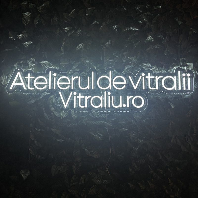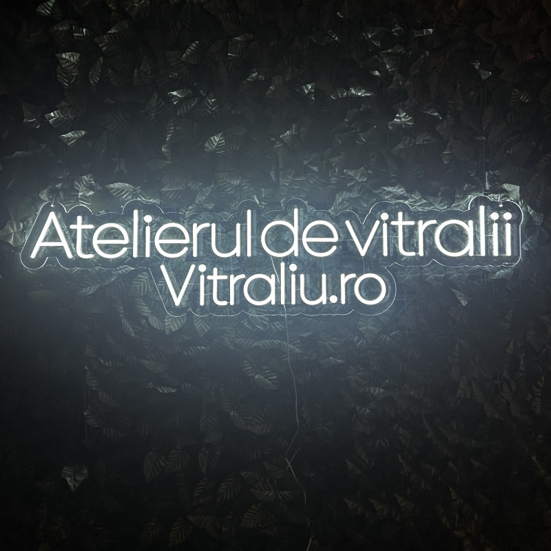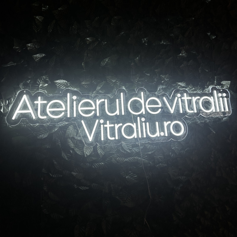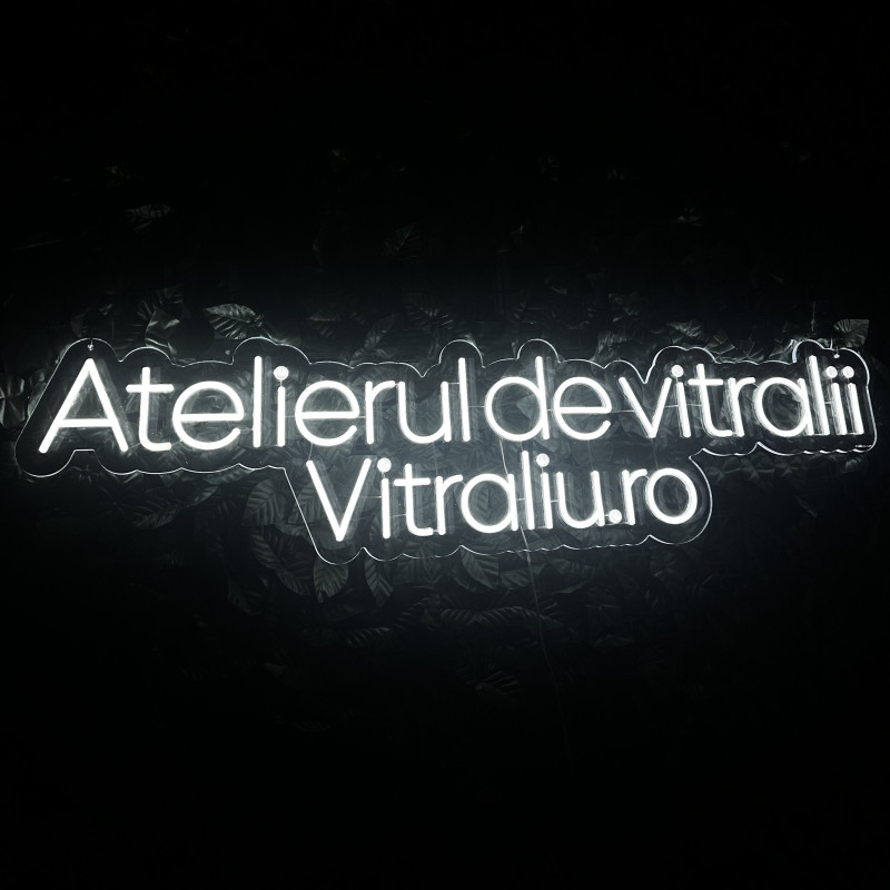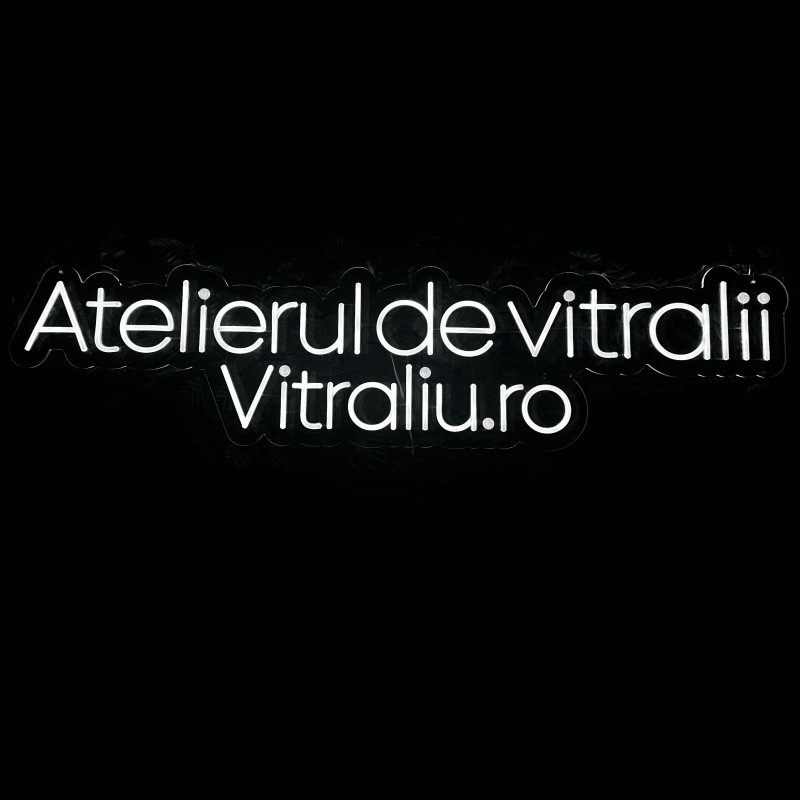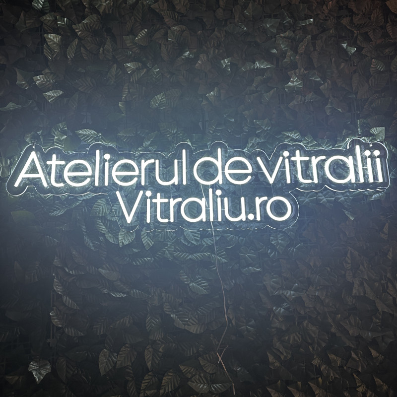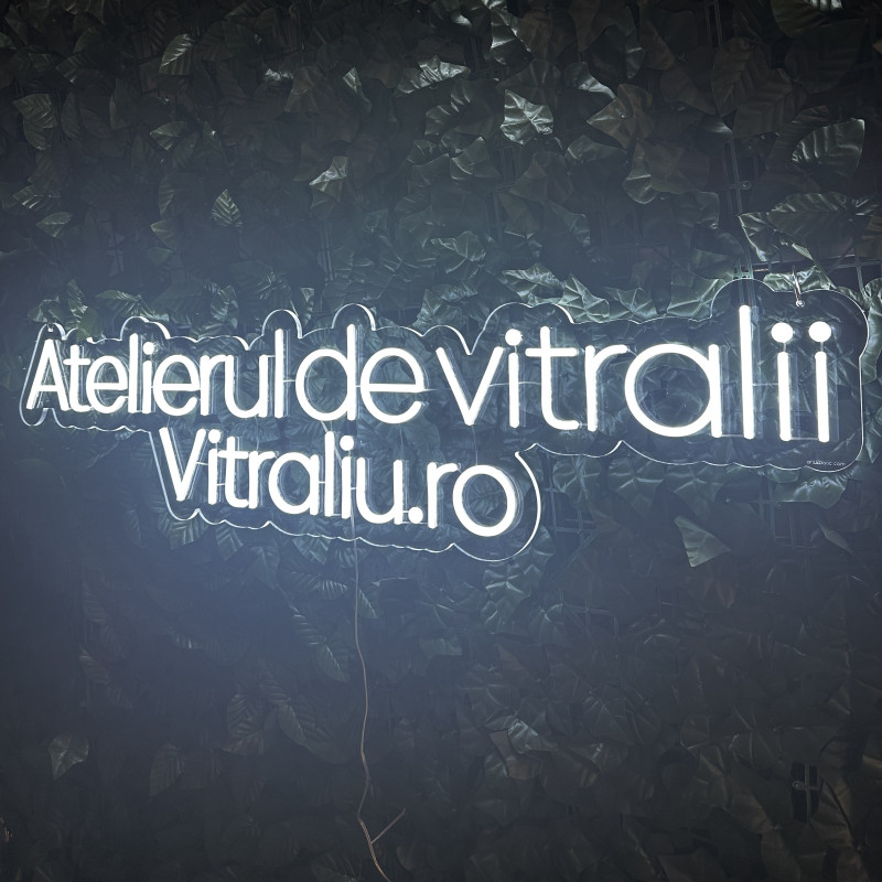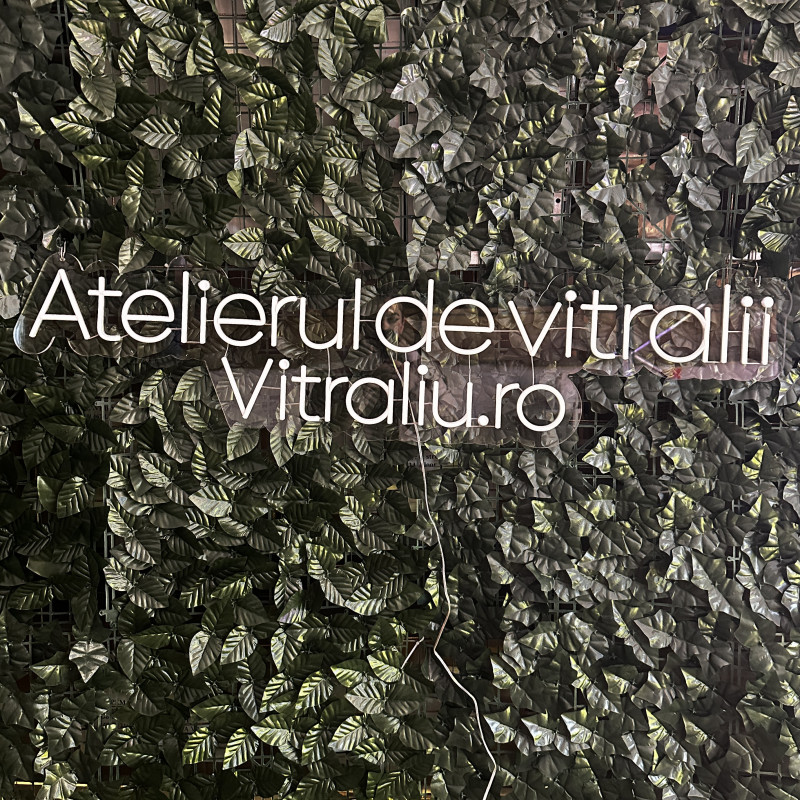Pentru ei am creat semnul luminos „Atelierul de vitralii — Vitraliu.ro”, gândit ca ancoră de identitate pentru fațadă, recepție, showroom sau brand wall: profil subțire, lumină uniformă, montaj curat și personalizare rapidă (dimensiuni, culori, finisaje) — fotogenic în foto/video și coerent cu estetica sticlei artistice.