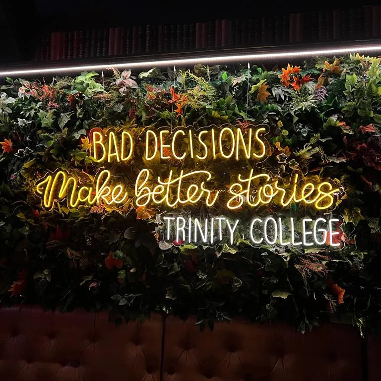 Acest semn luminos pe plexiglas este o expresie vibrantă a spiritului nostru aventurier și a abordării noastre pline de umor față de viață. Cu inscripția 'BAD DECISIONS Make better stories TRINITY COLLEGE', el încurajează curajul de a lua decizii îndrăznețe și de a transforma orice greșeală într-o poveste memorabilă.