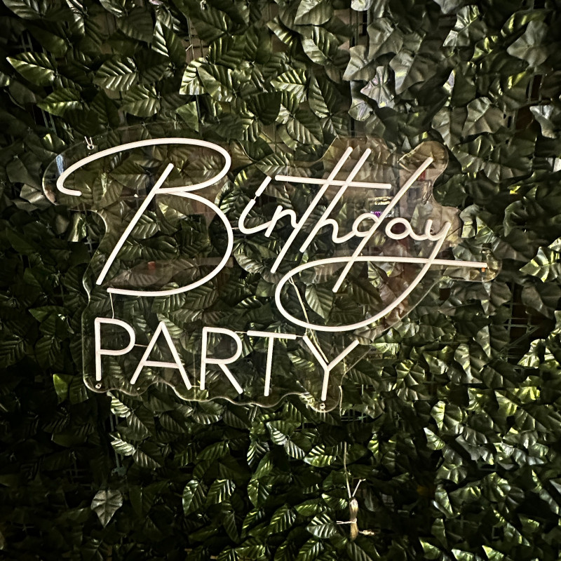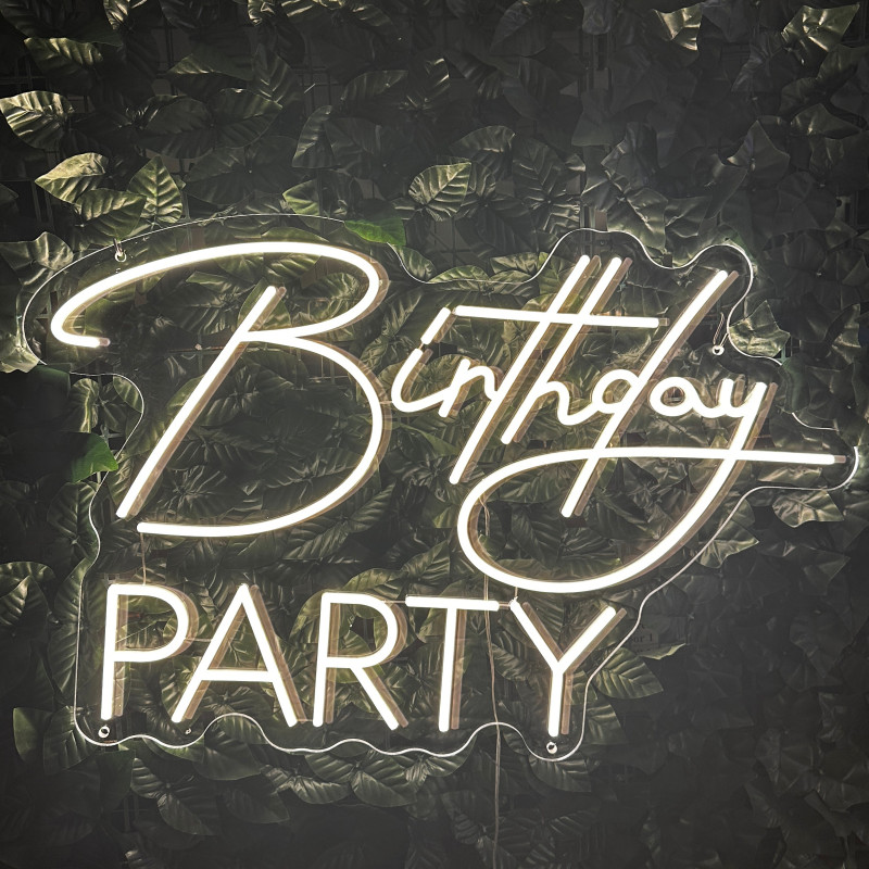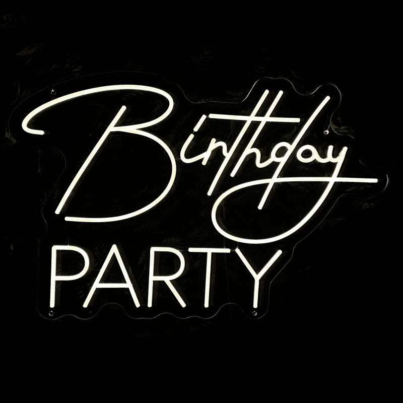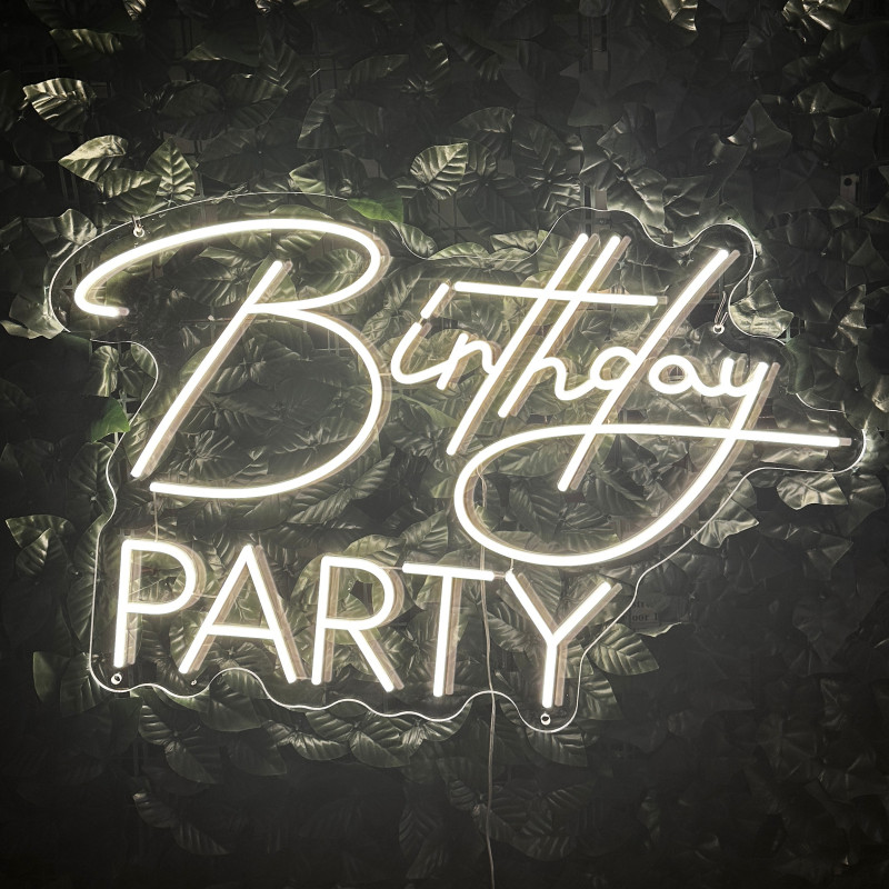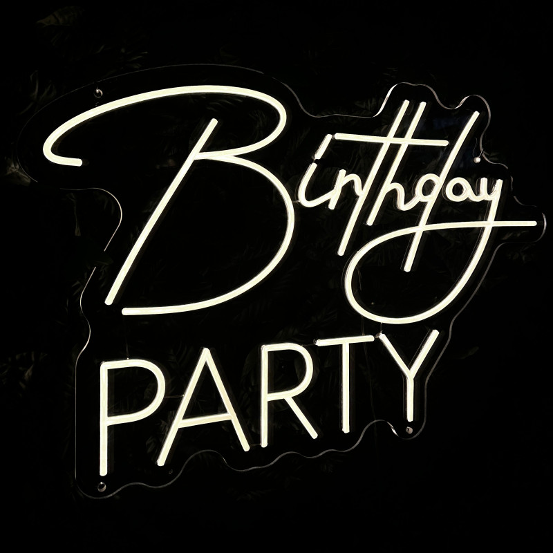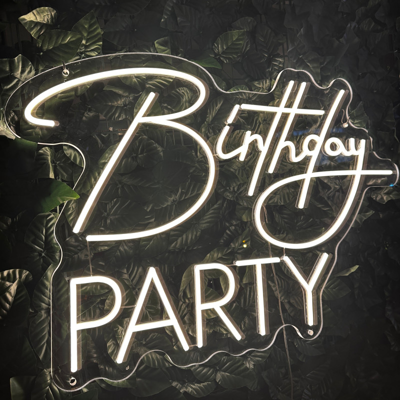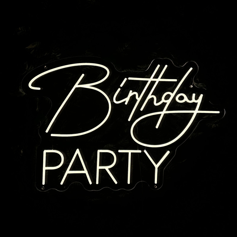 Semnul luminos „Birthday Party” este creat ca punct de atracție pentru photo corner, candy bar, scenă, recepție sau brand wall. Profil subțire, lumină uniformă, montaj curat; fotogenic în foto/video și ușor de personalizat (dimensiuni, culori, finisaje, font) pentru petreceri acasă, în local sau venue.