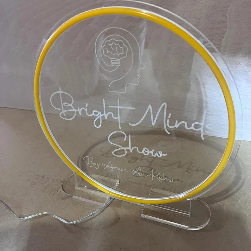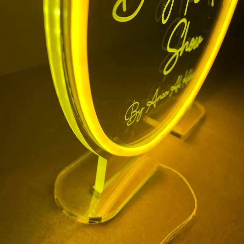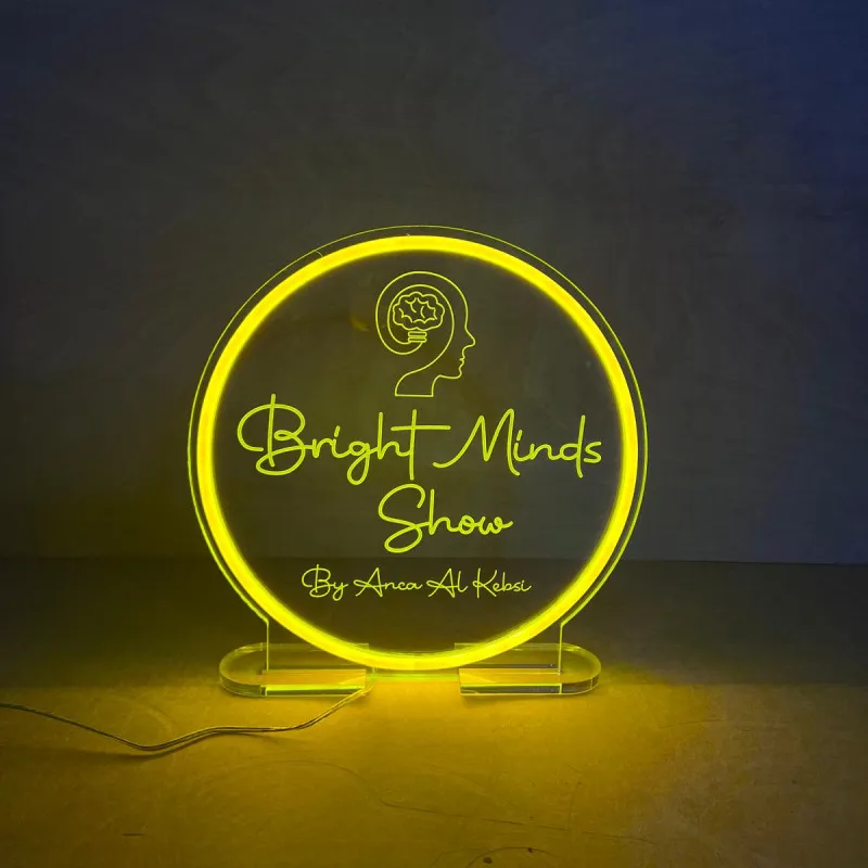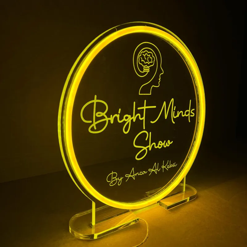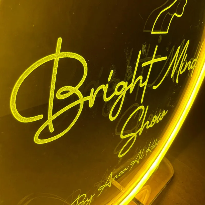 Bright Minds Show este un semn luminos personalizat, de interior, care combină vizibilitatea puternică cu eleganța detaliilor. Iluminat cu bandă LED galben lemon, acoperită cu silicon galben lemon, creează un efect vibrant și uniform. Designul decupat regulat pune în valoare liniile clare ale brandului, iar suportul din plexiglas transparent, cu gravură adaugă un plus de rafinament și modernitate.