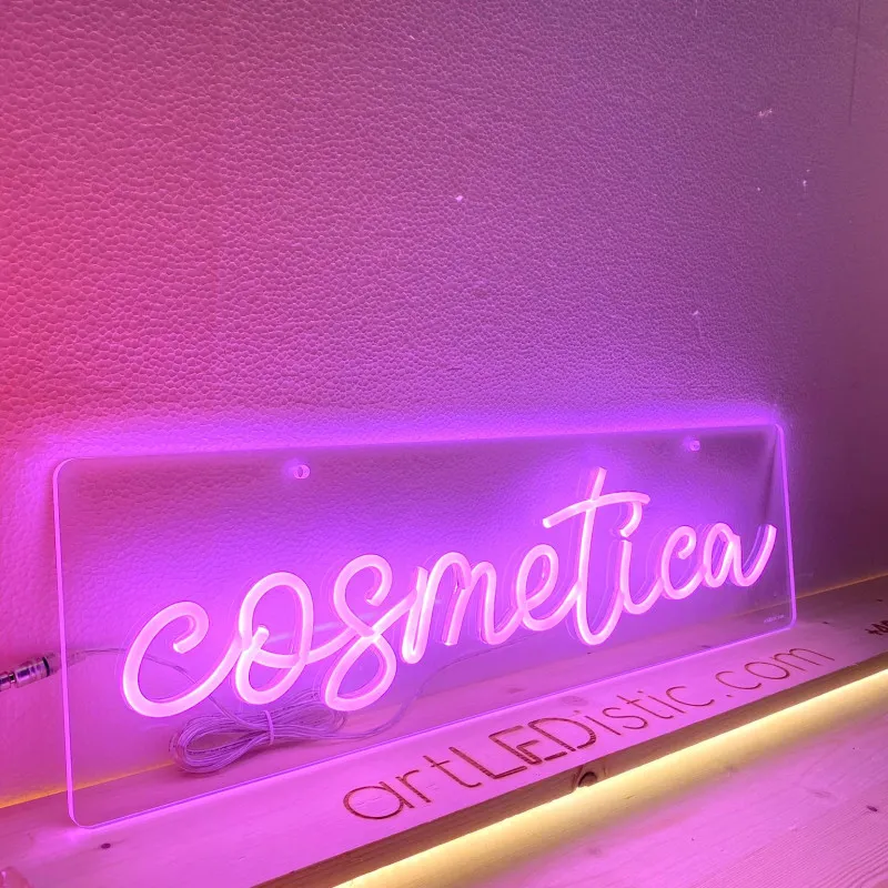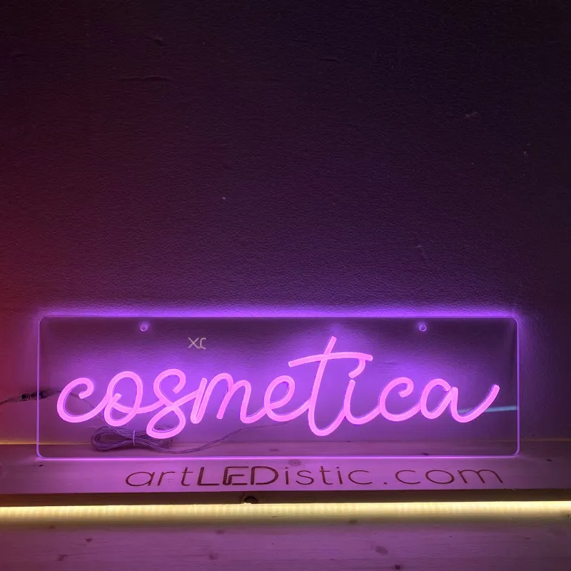 Semnul luminos "Cosmetica" pe plexiglas transparent, cu iluminare în nuanța de roz, adaugă un farmec modern și elegant oricărui salon de cosmetică sau spa. Cu un design minimalist și scris cursiv, acest semn luminează delicat și creează o atmosferă primitoare și relaxantă. Ideal pentru a atrage atenția clienților și a oferi un accent de rafinament, semnul este perfect pentru a îmbunătăți vizibilitatea și estetica oricărui spațiu de înfrumusețare.