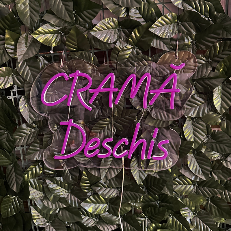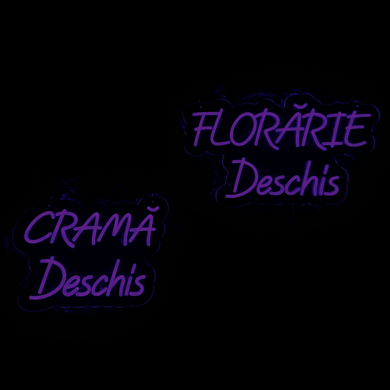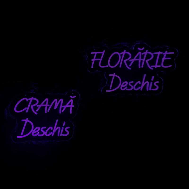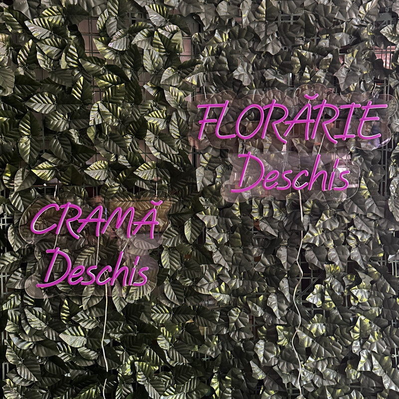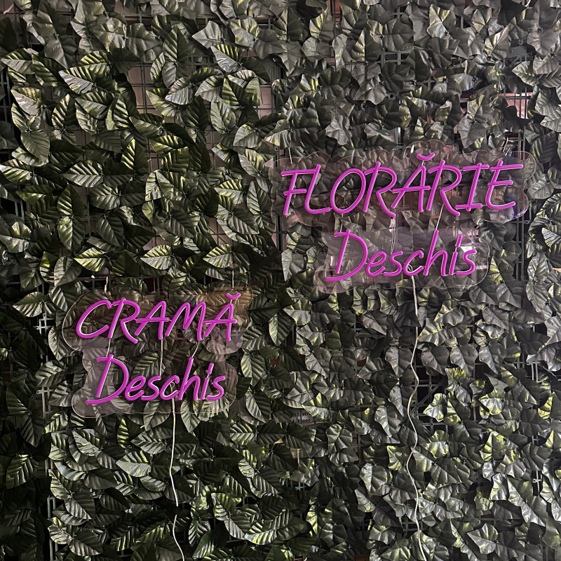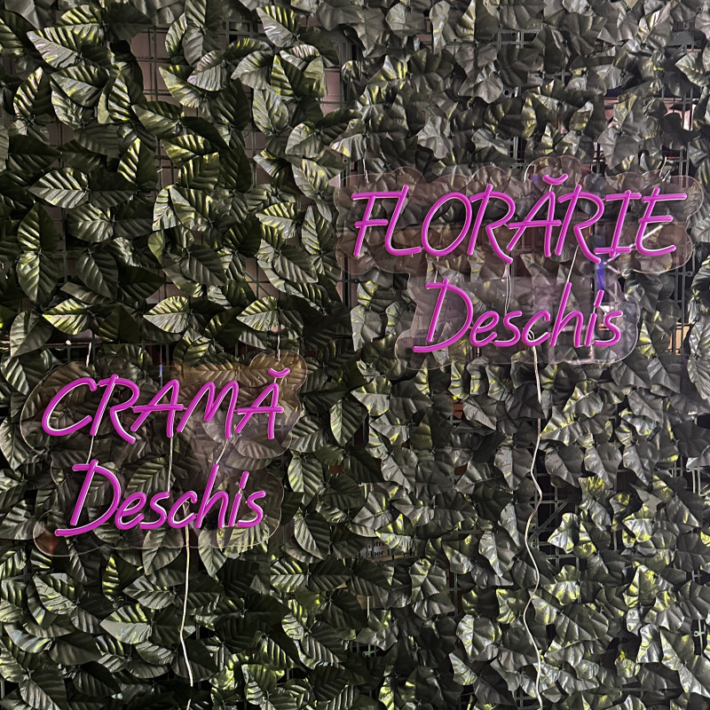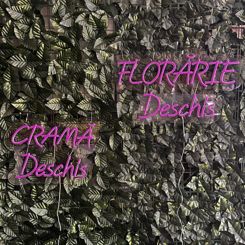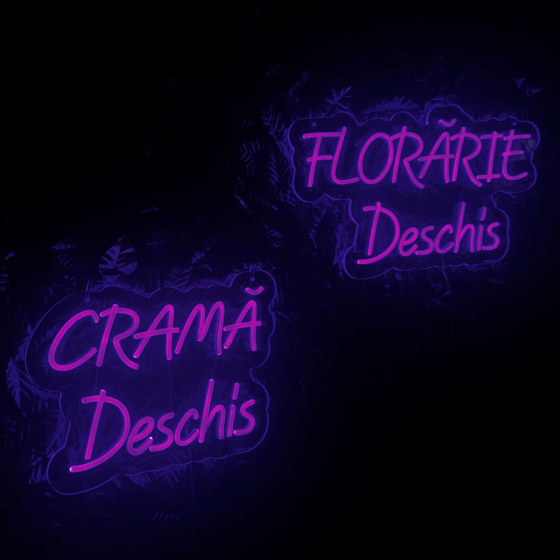 Setul de semne luminoase „CRAMA Deschis” și „FLORARIE Deshis” funcționează ca repere de orientare & identitate la intrare, pe fațadă sau în vitrină. Profil subțire, lumină uniformă, montaj curat și lizibilitate de la distanță; fotogenice în foto/video. Personalizabile rapid (dimensiuni, culori, finisaje, font) pentru a se potrivi esteticii unei crame/wine-bar și a unei florării.