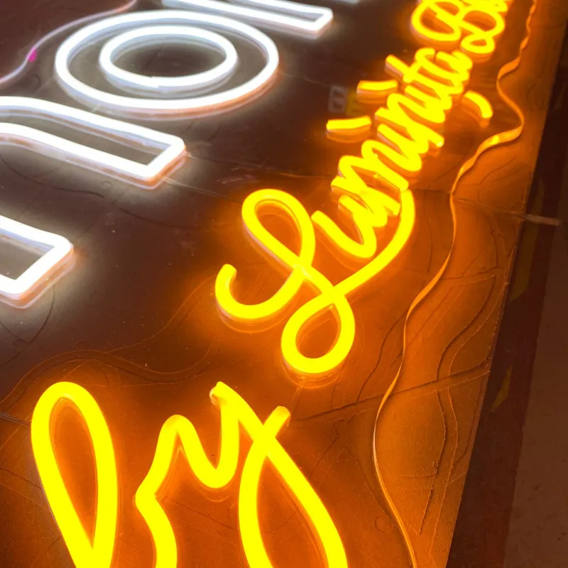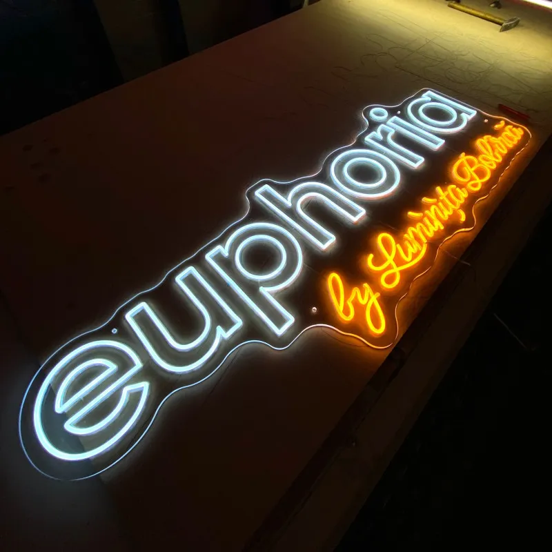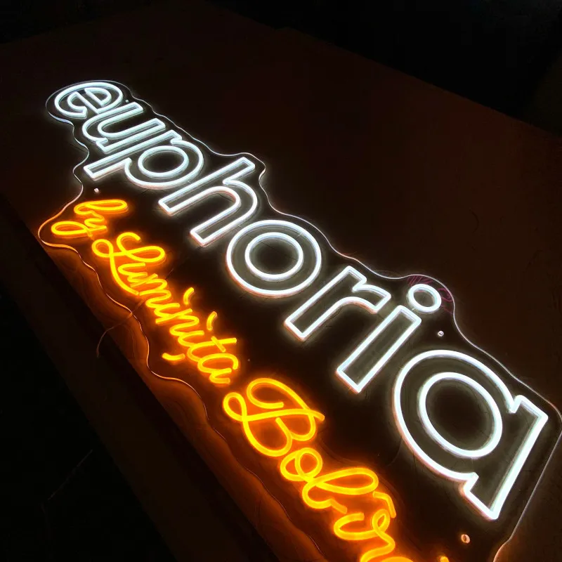 Semnul luminos "Euphoria by Luminița Bobîrcă" pe plexiglas transparent emană o eleganță rafinată și o vibrație vibrantă. Literele sunt conturate cu claritate și precizie pe suprafața netedă a plexiglasului transparent, permițând luminii să strălucească în mod captivant și atrăgător. Culoarea alb rece adaugă o notă de modernitate și sobrietate, în timp ce portocaliul aduce o explozie de energie și căldură. Iluminarea este plasată strategic în spatele semnului, oferindu-i o strălucire uniformă și plăcută. Lumina delicată îmbrățișează fiecare literă, evidențiind numele într-un mod subtil și sofisticat. Cablurile și componentele electronice sunt discret integrate în spatele semnului, menținând un aspect curat și ordonat al designului.