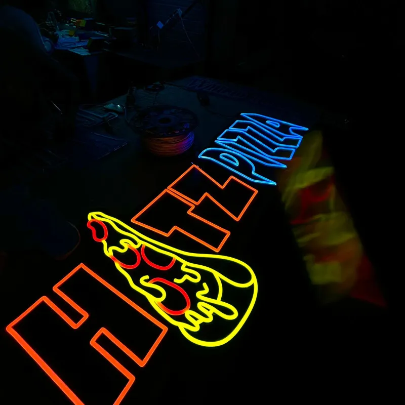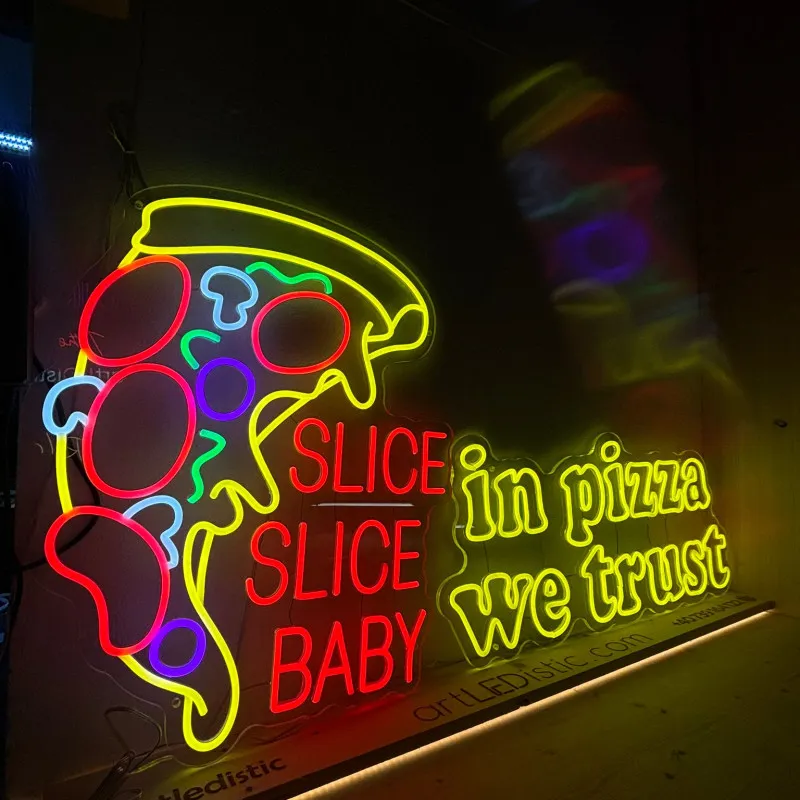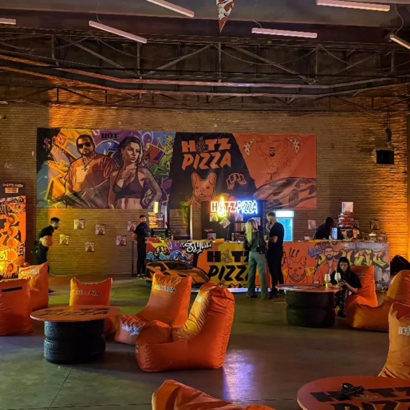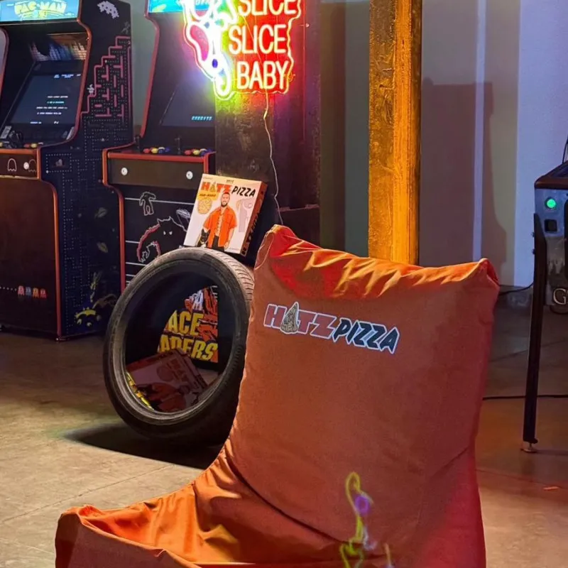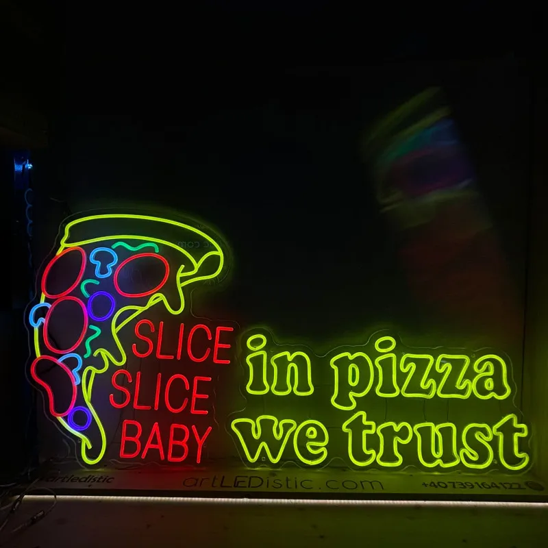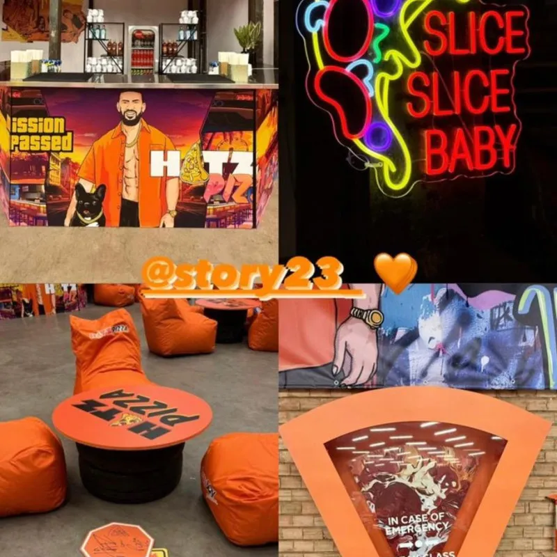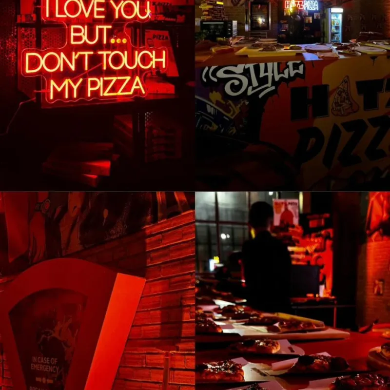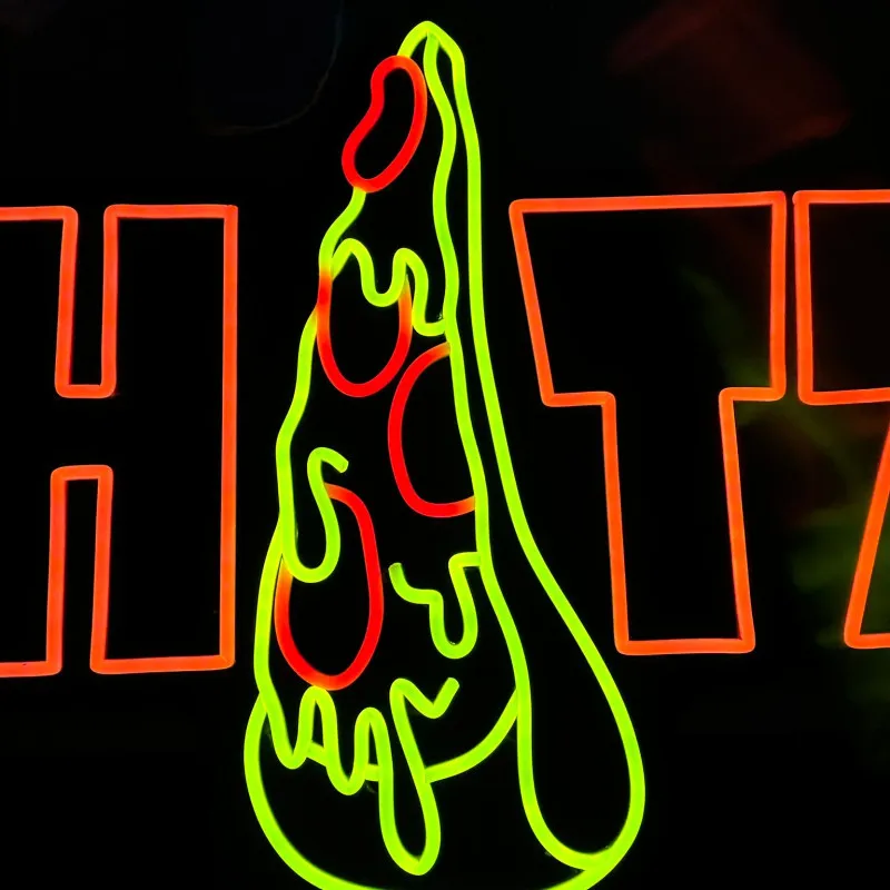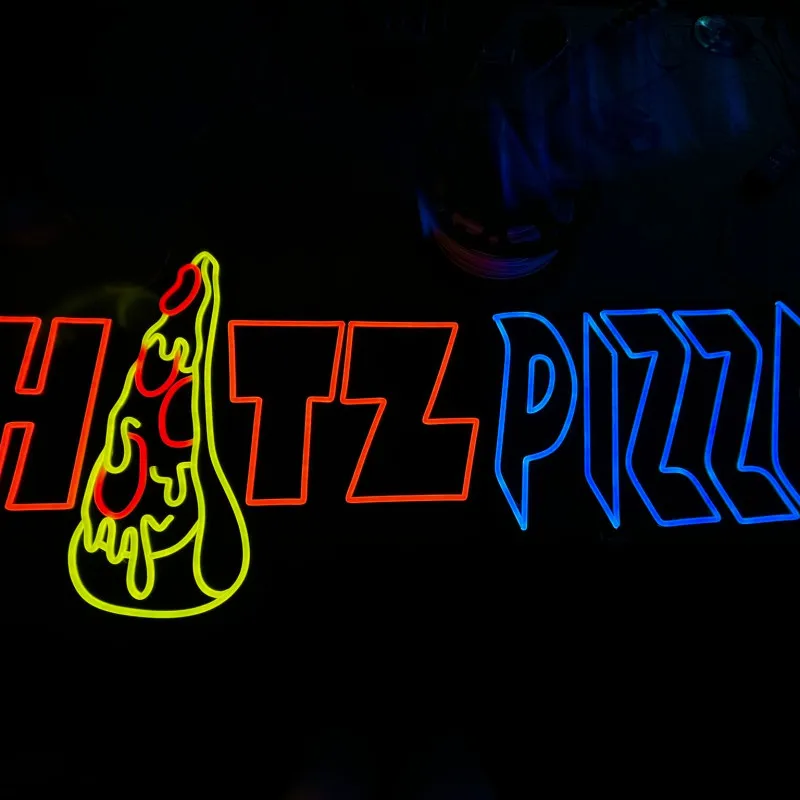 Acest semn luminos unic, creat special pentru faimoasa pizzerie a lui Chelutzu & Dorian Popa, este confecționat din plexiglas negru de înaltă calitate, oferind un aspect modern și îndrăzneț. Textul "HATZ" este iluminat în portocaliu vibrant, unde litera "A" este transformată artistic într-o felie de pizza, adăugând un element creativ și jucăuș. Cuvântul "pizza" este iluminat cu LED alb rece, completând designul cu un contrast elegant și profesional. Semnul combină perfect stilul energic și nonconformist al lui Dorian Popa cu un design atractiv, garantând vizibilitate și impact maxim pentru pizzerie, atât ziua, cât și noaptea.