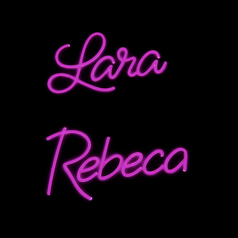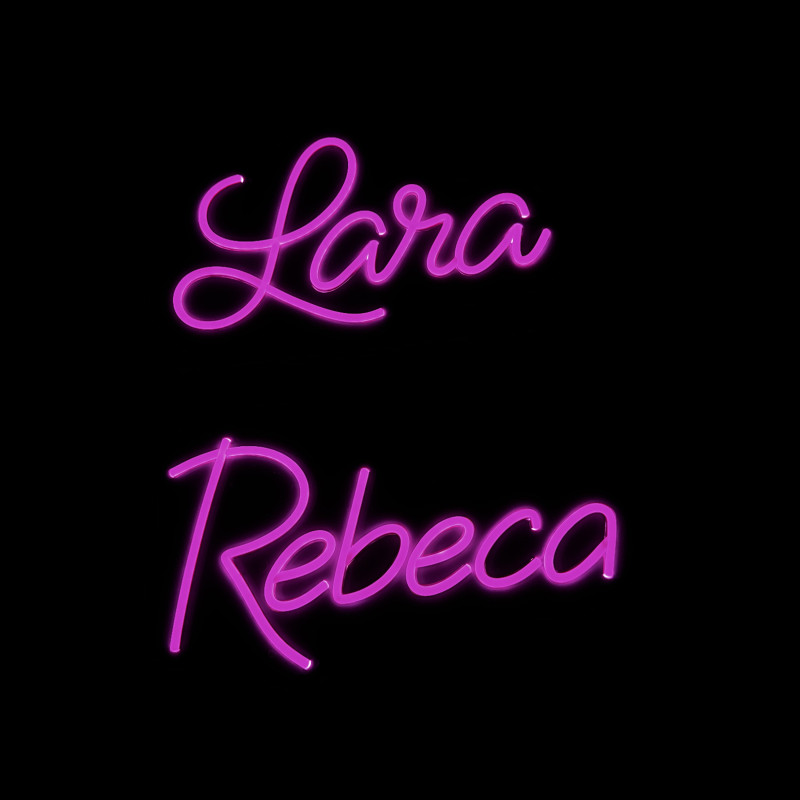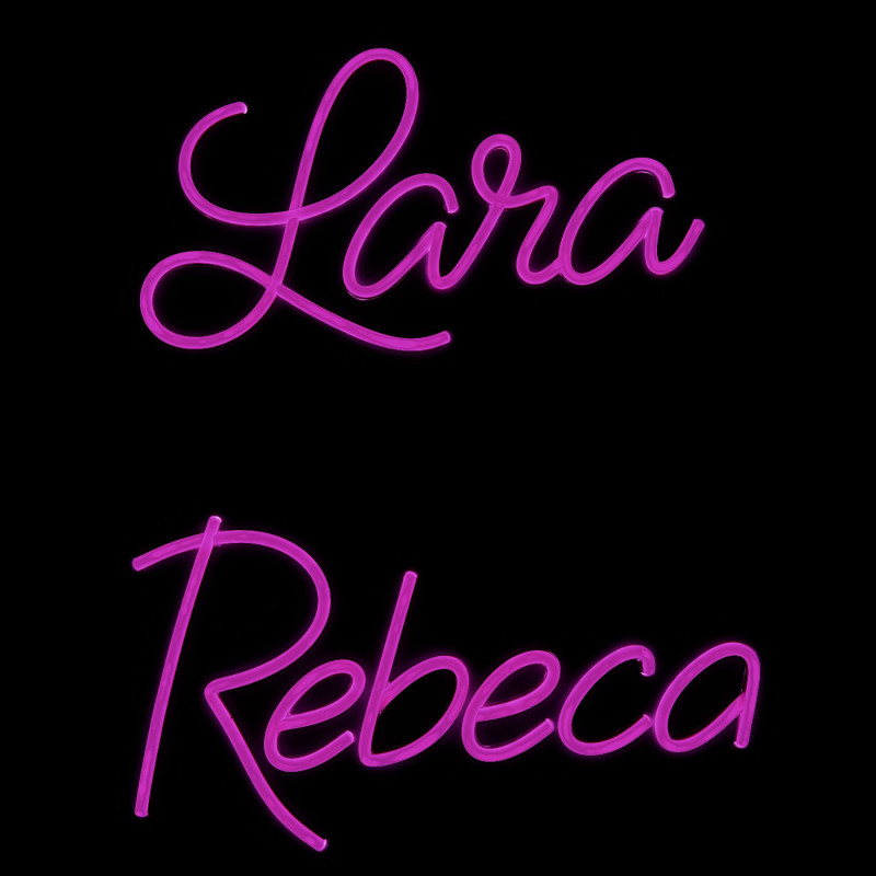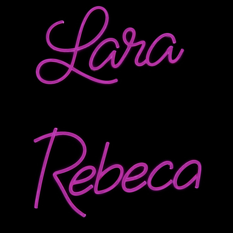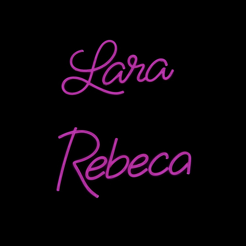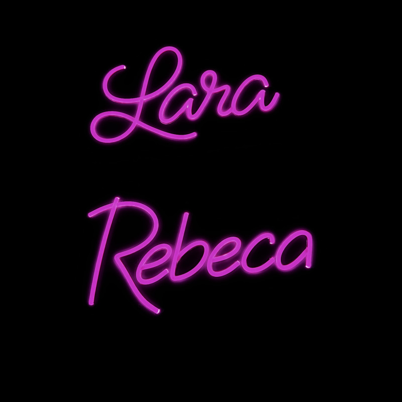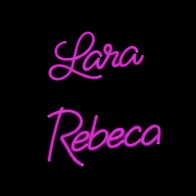 Semnele luminoase „LARA” și „REBECA” funcționează ca ancore de identitate pentru vitrină, recepție, cameră, candy bar, photo spot sau brand wall. Profil subțire, lumină uniformă, montaj curat; fotogenice în foto/video. Personalizabile rapid (dimensiuni, culori, finisaje, font) și ușor de adaptat altor nume/monograme.