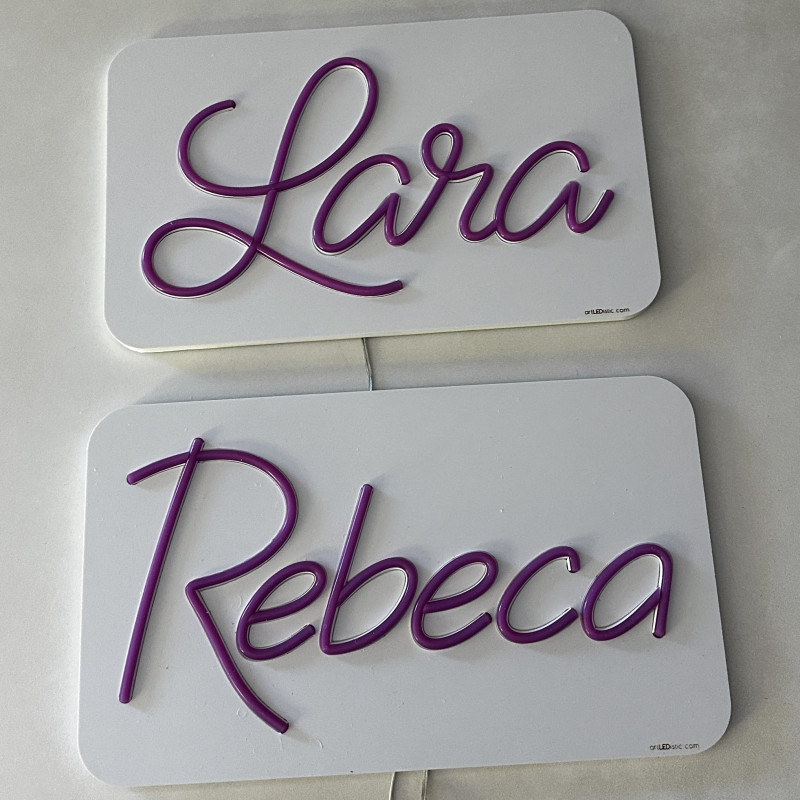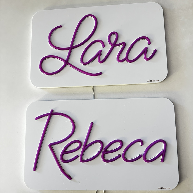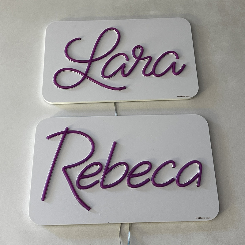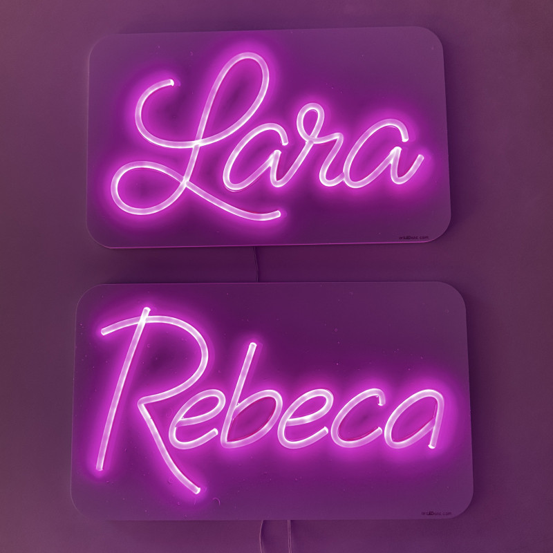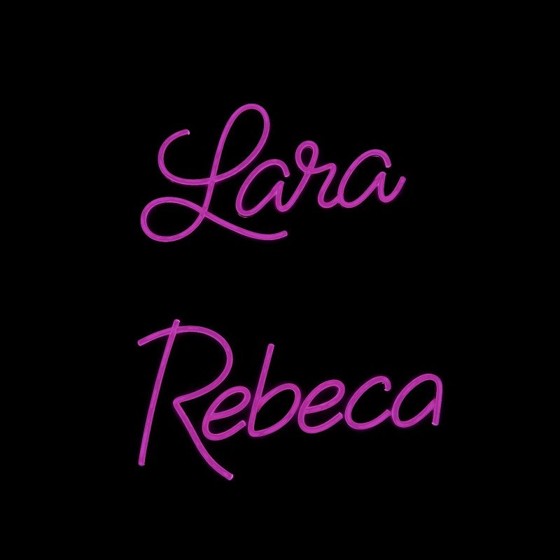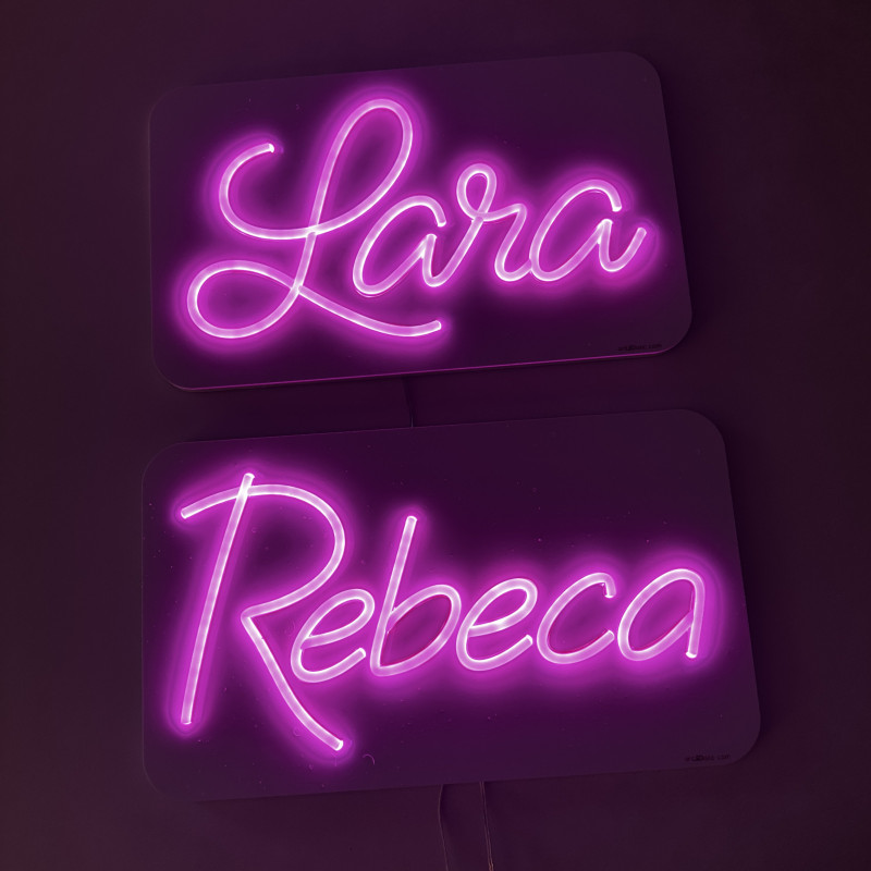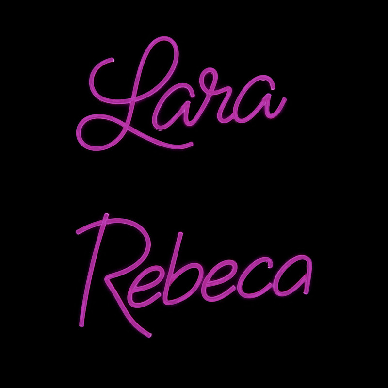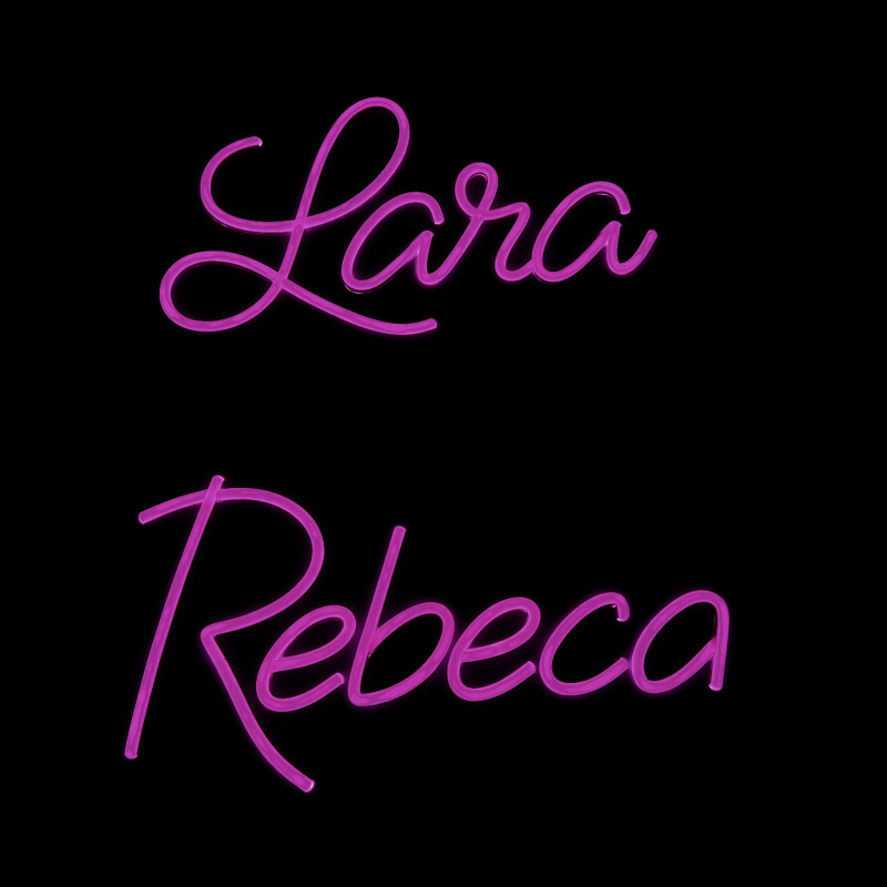Semnele luminoase „LARA” și „REBECA” funcționează ca ancore de identitate pentru vitrină, recepție, cameră, candy bar, photo spot sau brand wall. Profil subțire, lumină uniformă, montaj curat; fotogenice în foto/video. Personalizabile rapid (dimensiuni, culori, finisaje, font) și ușor de adaptat altor nume/monograme.