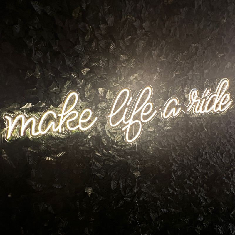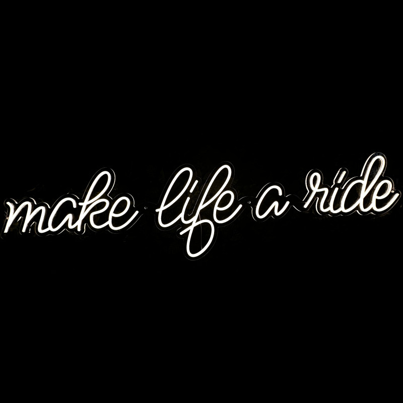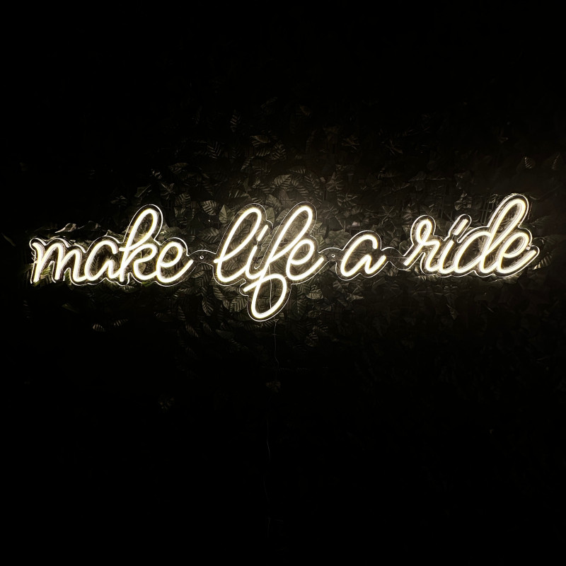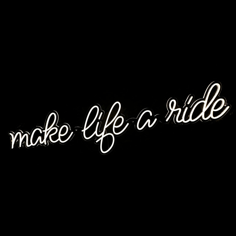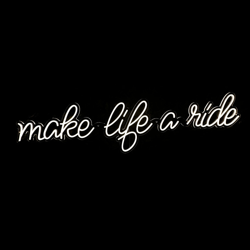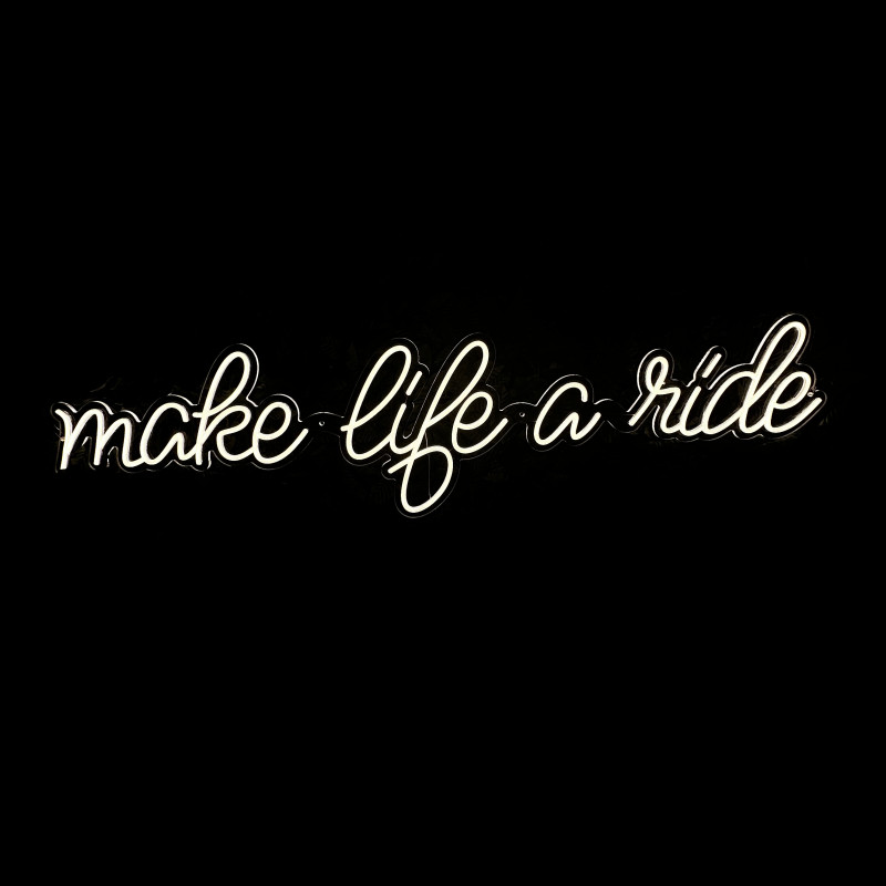 Semnul luminos make life a ride aduce un mesaj energizant, ideal ca punct de vibe în showroom, garaj, studio, sală de sport, bar sau living. Profil subțire, lumină uniformă, montaj curat, vizibilitate excelentă în foto/video. Personalizabil rapid în dimensiuni, culori și finisaje pentru potrivire cu identitatea spațiului.