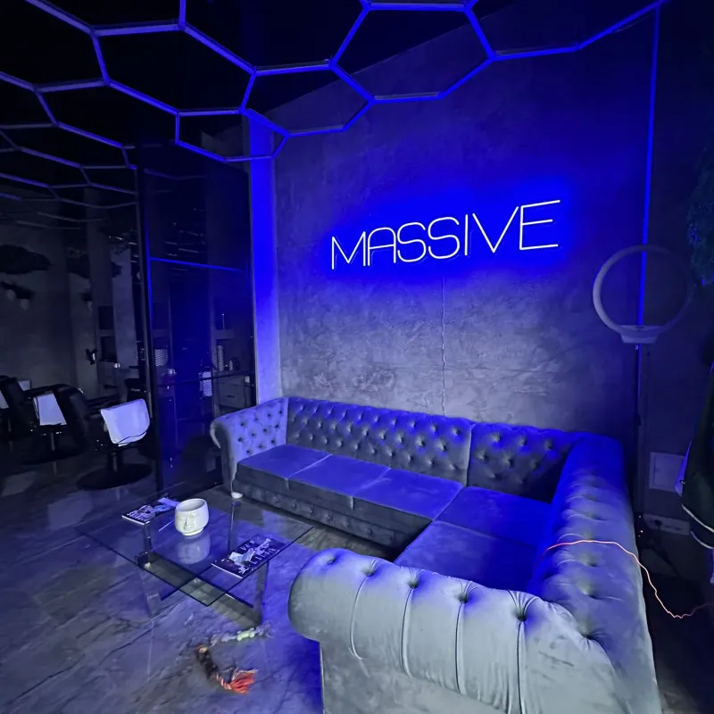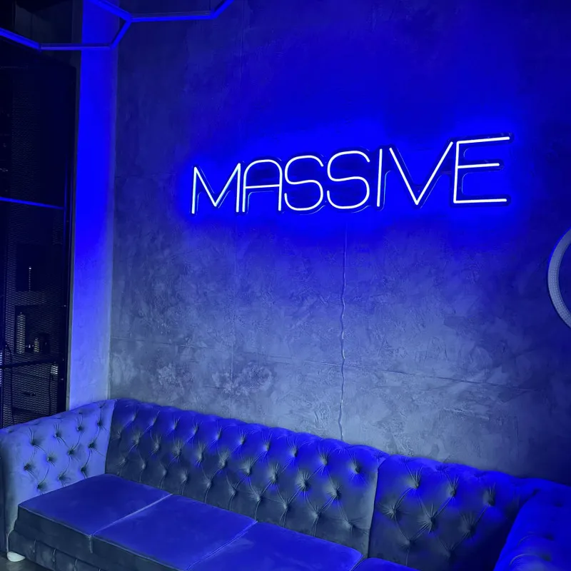 Semnul luminos "Massive" este conceput pentru a oferi un aspect modern și impactant, ideal pentru a atrage atenția și a adăuga un element de stil oricărui spațiu. Realizat din plexiglas transparent de înaltă calitate, acest semn combină durabilitatea materialului cu tehnologia LED de ultimă generație, utilizând o iluminare albastră strălucitoare pentru a crea un efect vizual puternic și captivant.