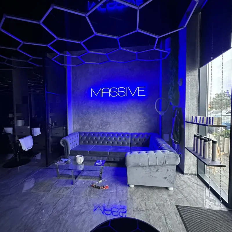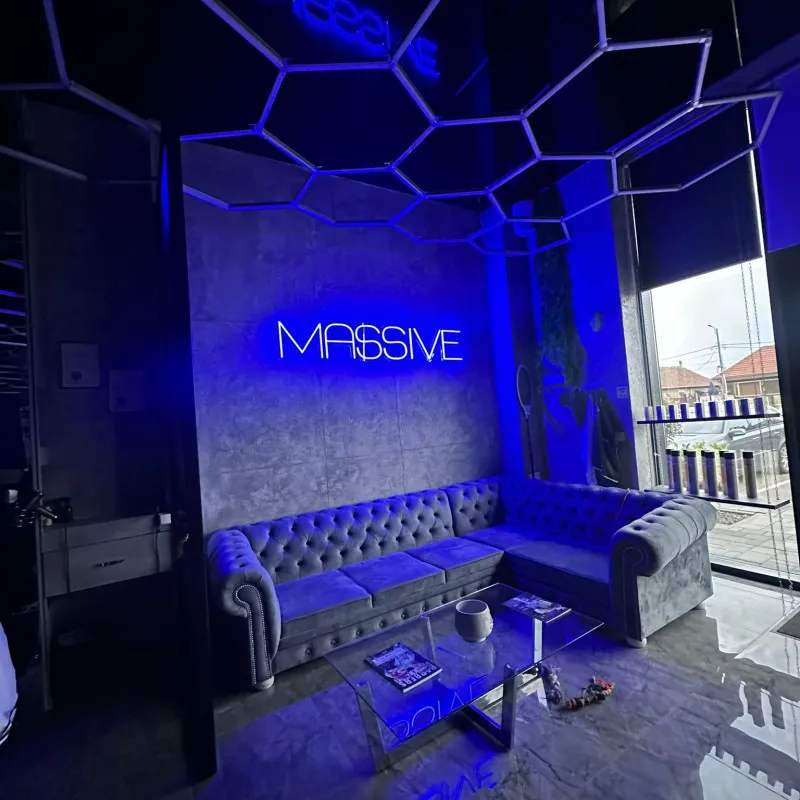 Acest semn luminos "Massive" nu doar că îmbunătățește vizibilitatea și atractivitatea spațiului, dar adaugă și un element decorativ esențial, transformând orice locație într-un loc mai atrăgător și plin de viață. Lumina albastră contribuie la crearea unei atmosfere dinamice și profesionale, subliniind caracterul modern și inovator al brandului sau mesajului promovat.