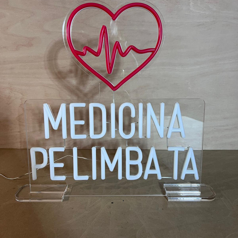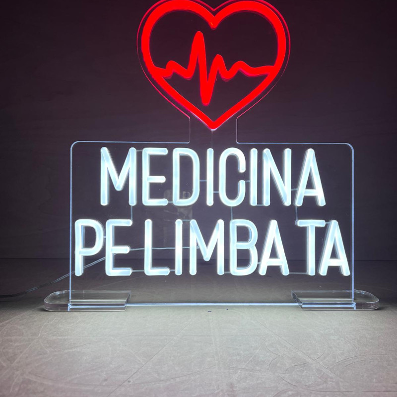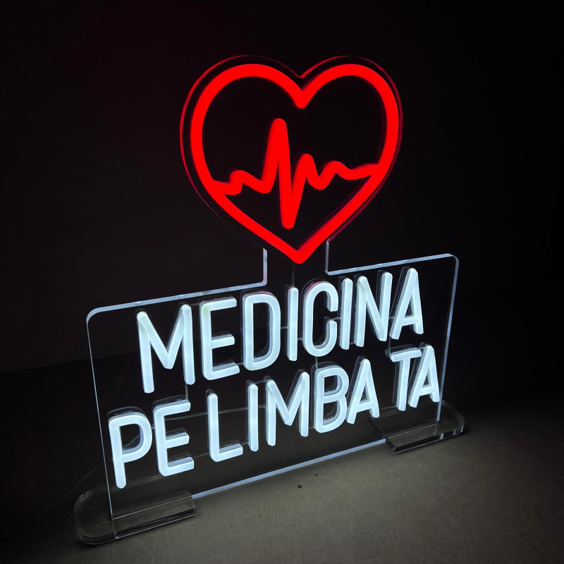 Semnul luminos personalizat „Medicina pe Limba Ta”, cu text iluminat cu banda LED alb rece și roșu, acoperit cu silicon alb și inimă cu puls în silicon roșu, oferă vizibilitate decupat regulat pe plexiglas transparent, identitate și transmite mesajul clar din primul moment. Cu un design curat, semnul luminos este potrivit pentru recepții, cabinete și clinici, aduce vizibilitate, personalitate și claritate mesajului tău.
