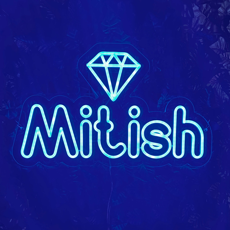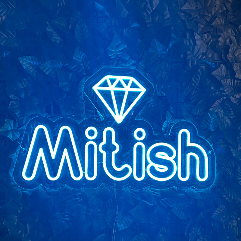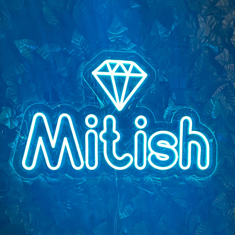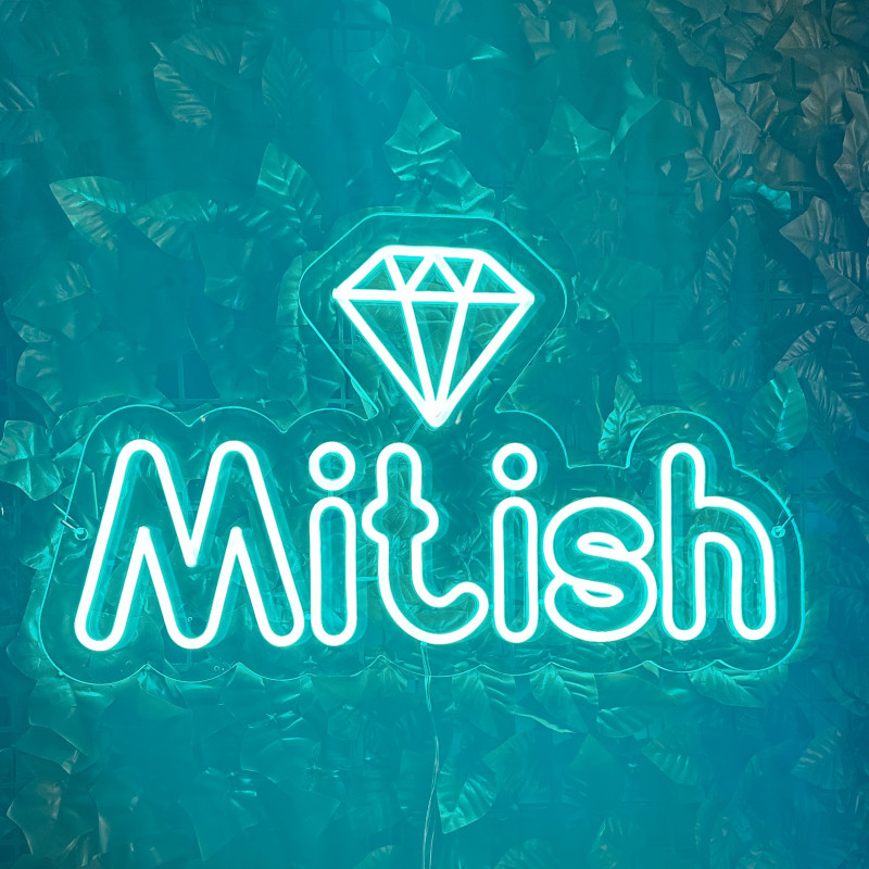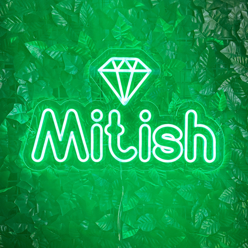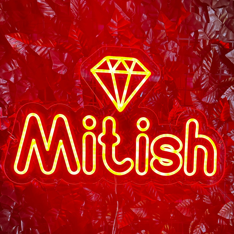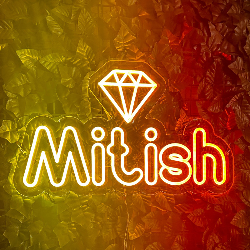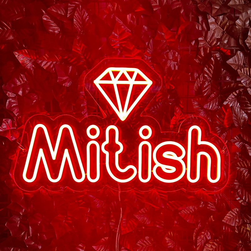 Semnul luminos „Mitish” are numele în prim-plan, cu diamantul ca element grafic de accent. Iluminarea RGB oferă scene dinamice (solid/fade/chase), vizibile pe fațadă, recepție, lounge, studio sau brand wall. Profil subțire, lumină uniformă, montaj curat; personalizabil (dimensiuni, palete, finisaje, control telecomandă).