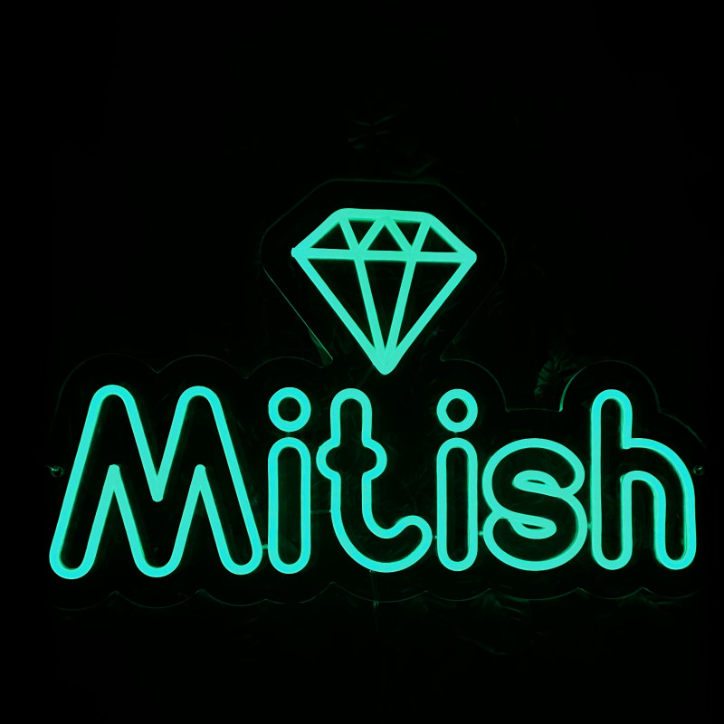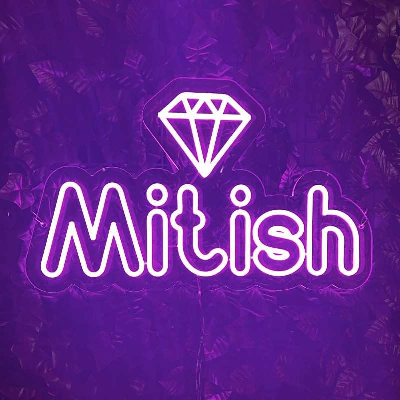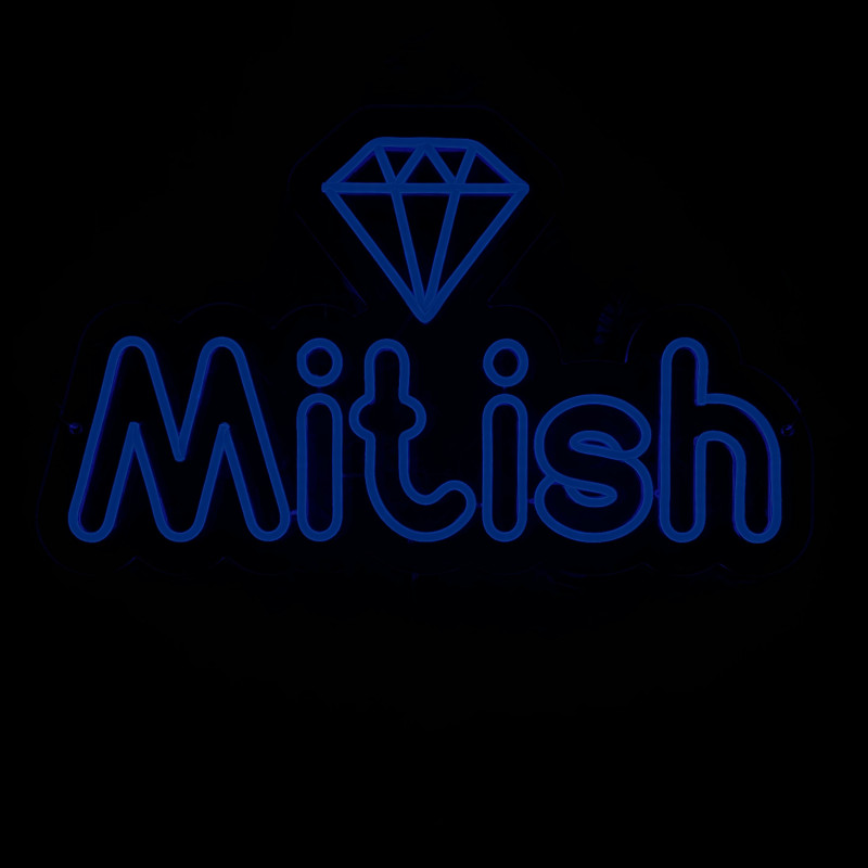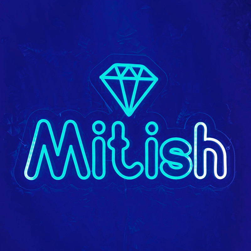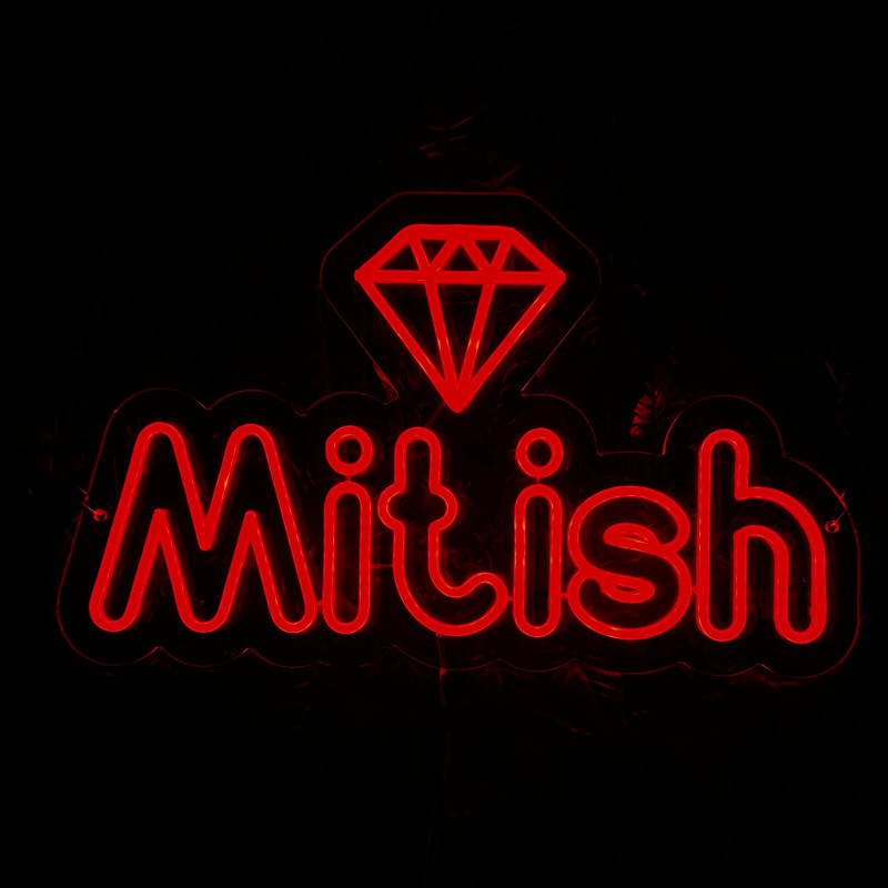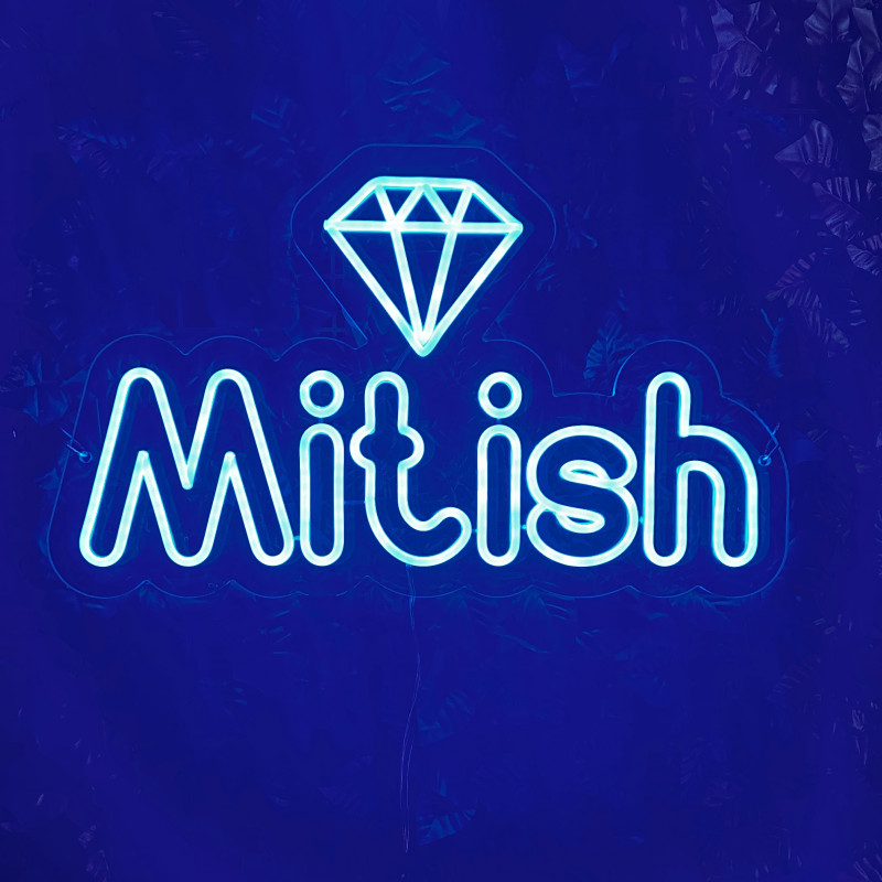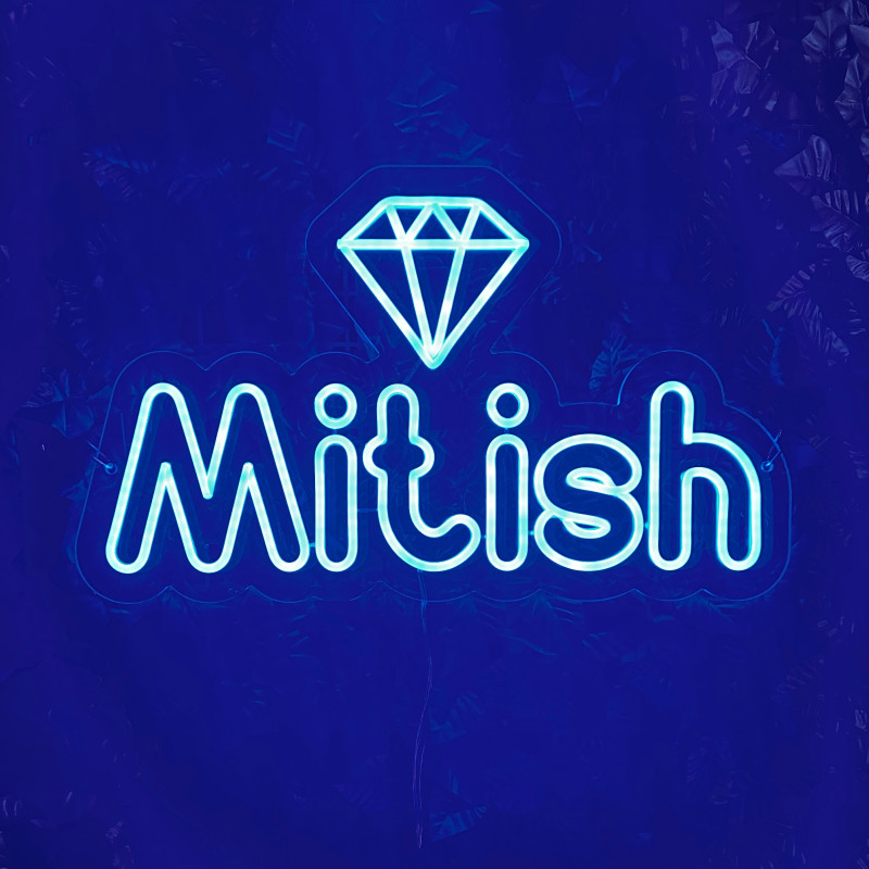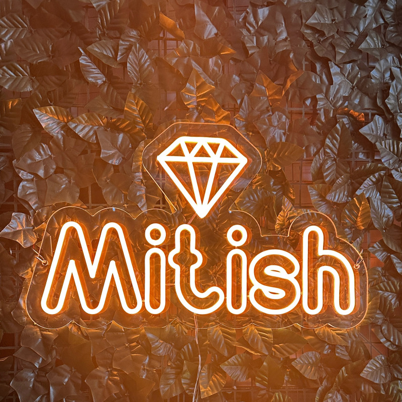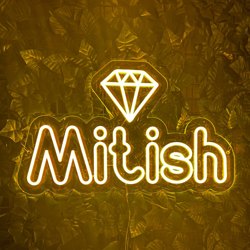 Semnul luminos „Mitish” are numele în prim-plan, cu diamantul ca element grafic de accent. Iluminarea RGB oferă scene dinamice (solid/fade/chase), vizibile pe fațadă, recepție, lounge, studio sau brand wall. Profil subțire, lumină uniformă, montaj curat; personalizabil (dimensiuni, palete, finisaje, control telecomandă).