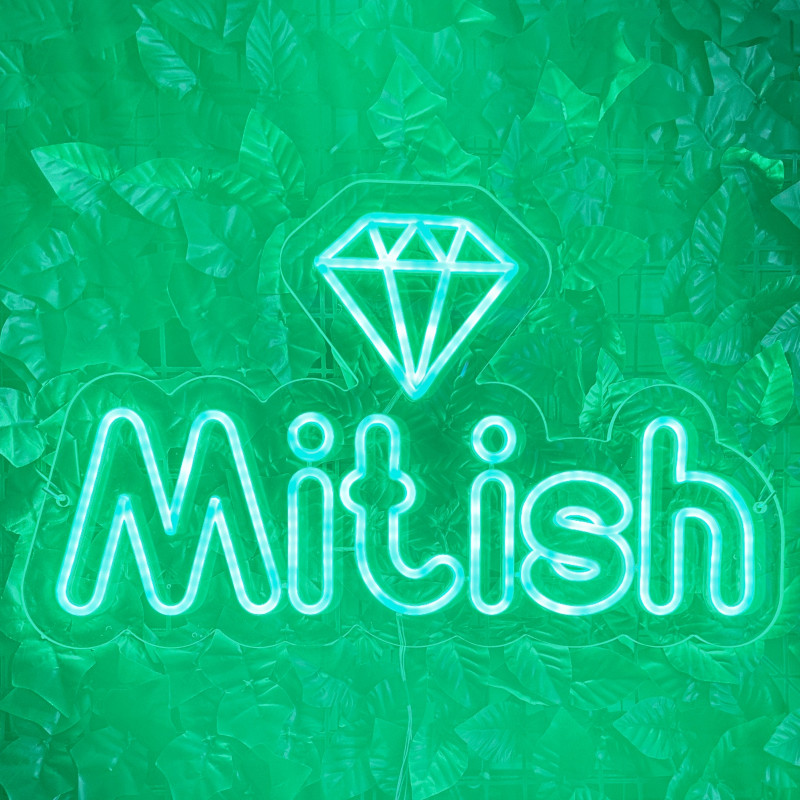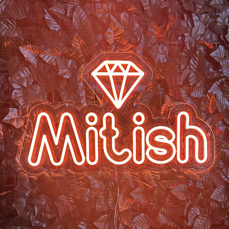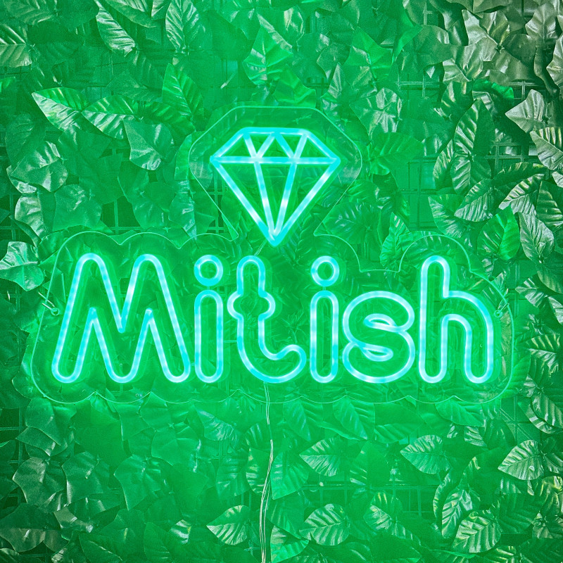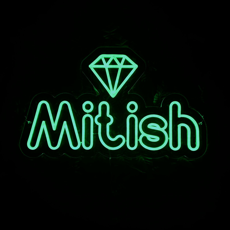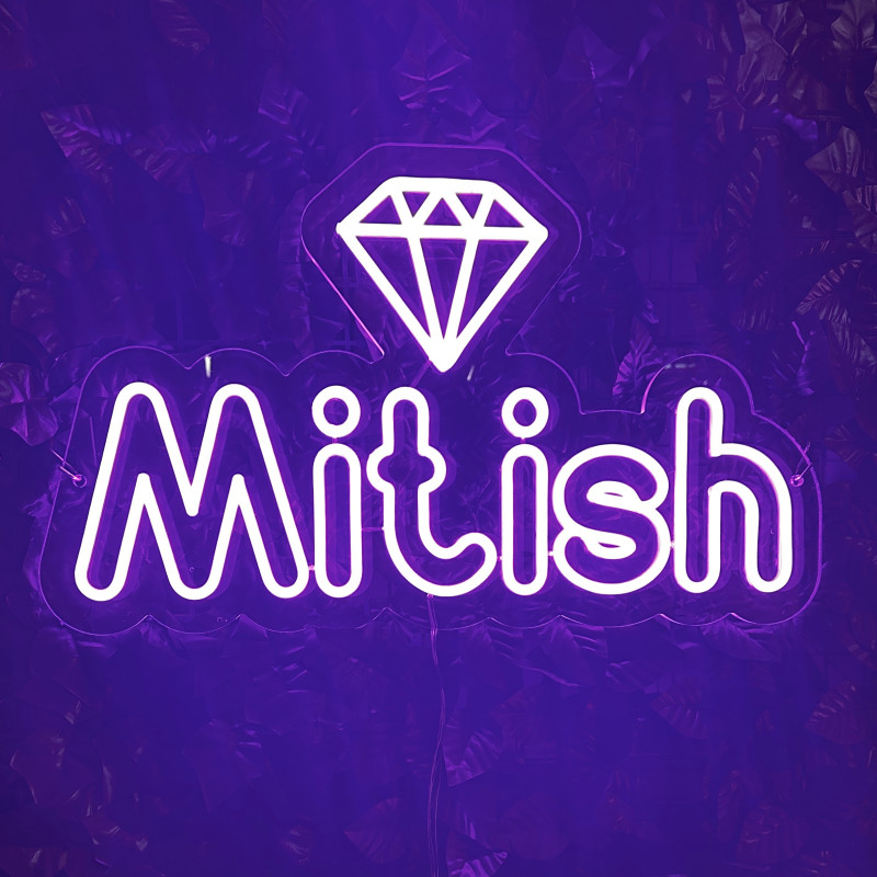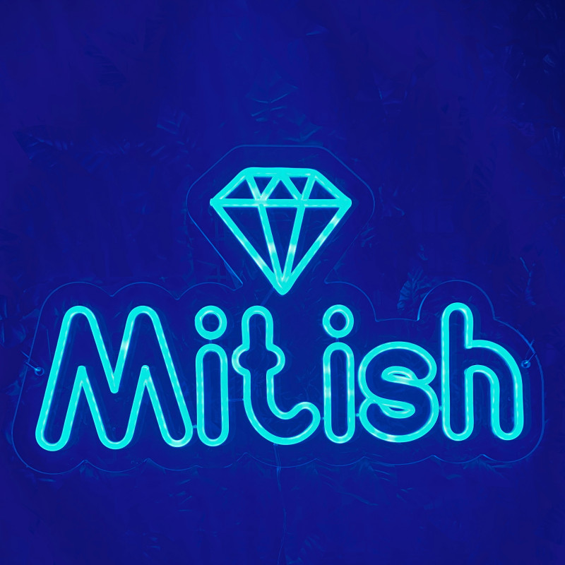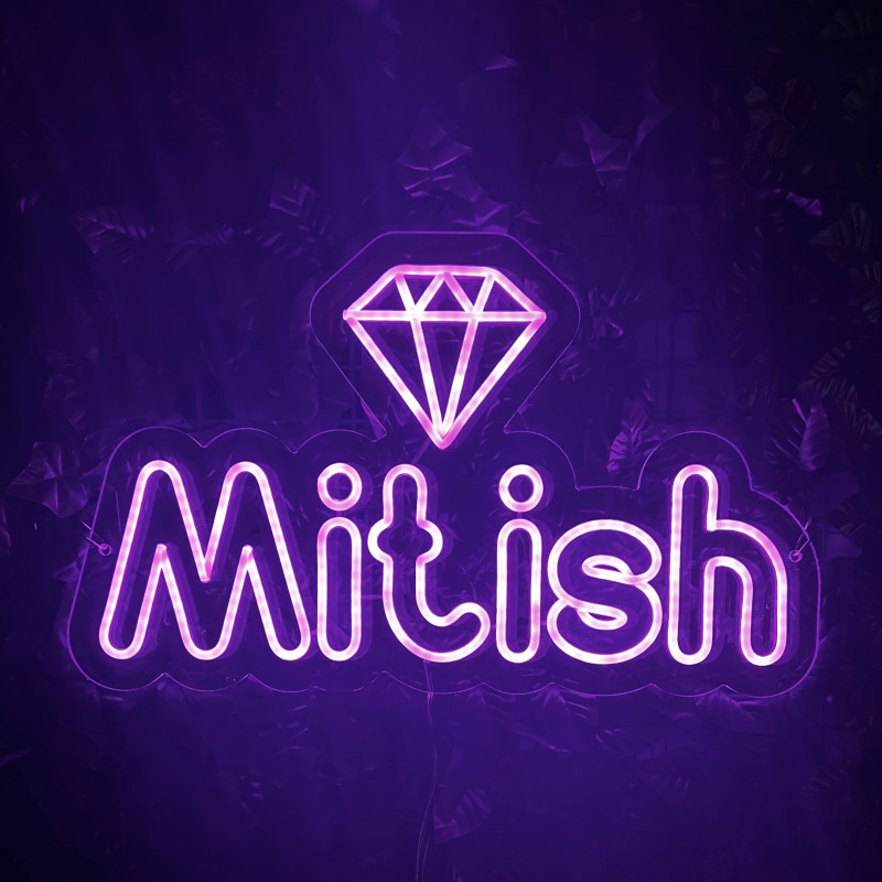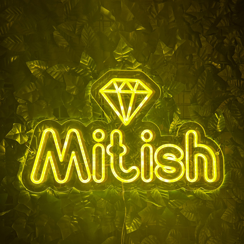 Semnul luminos „Mitish” are numele în prim-plan, cu diamantul ca element grafic de accent. Iluminarea RGB oferă scene dinamice (solid/fade/chase), vizibile pe fațadă, recepție, lounge, studio sau brand wall. Profil subțire, lumină uniformă, montaj curat; personalizabil (dimensiuni, palete, finisaje, control telecomandă).