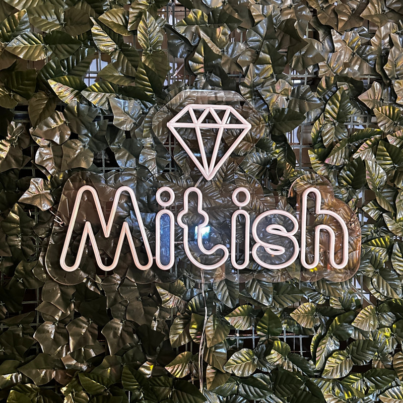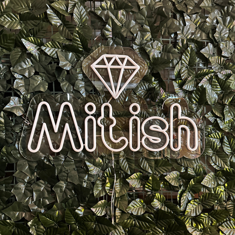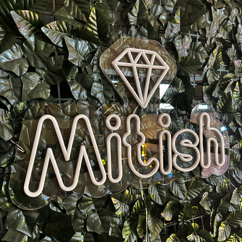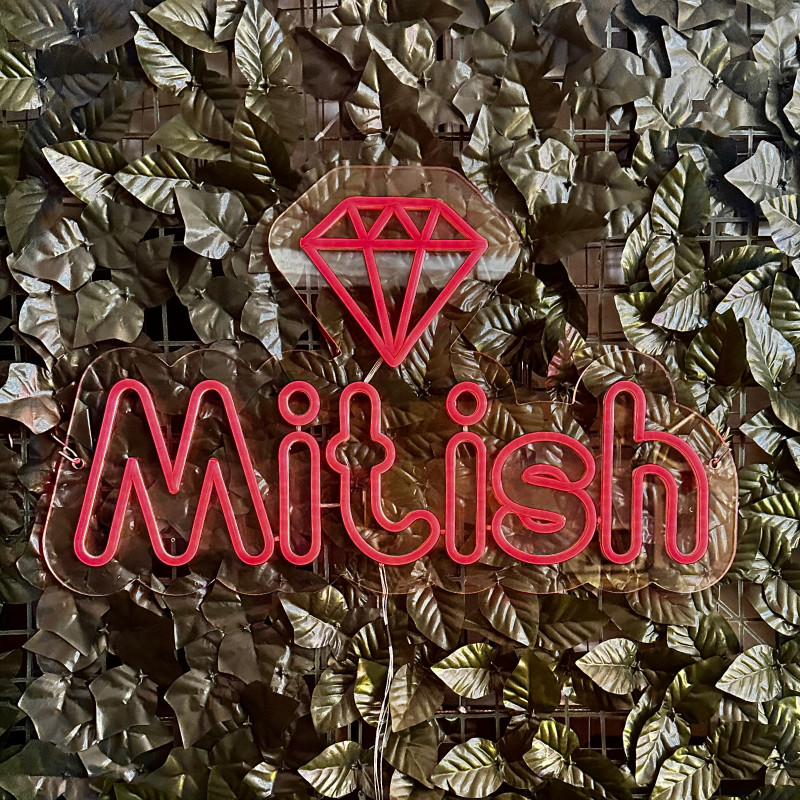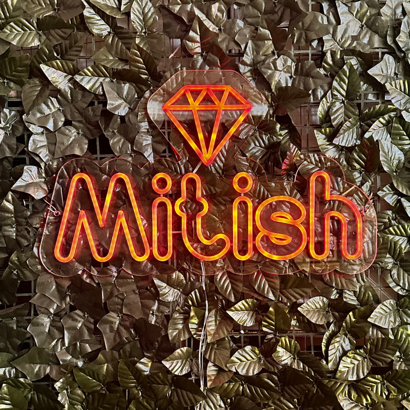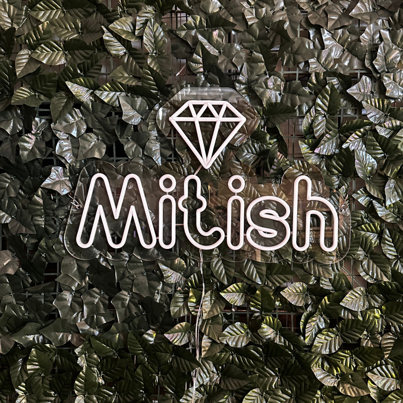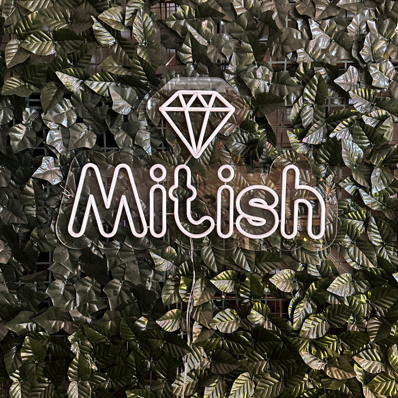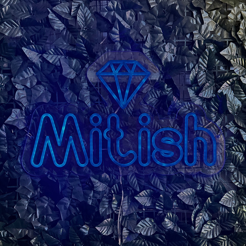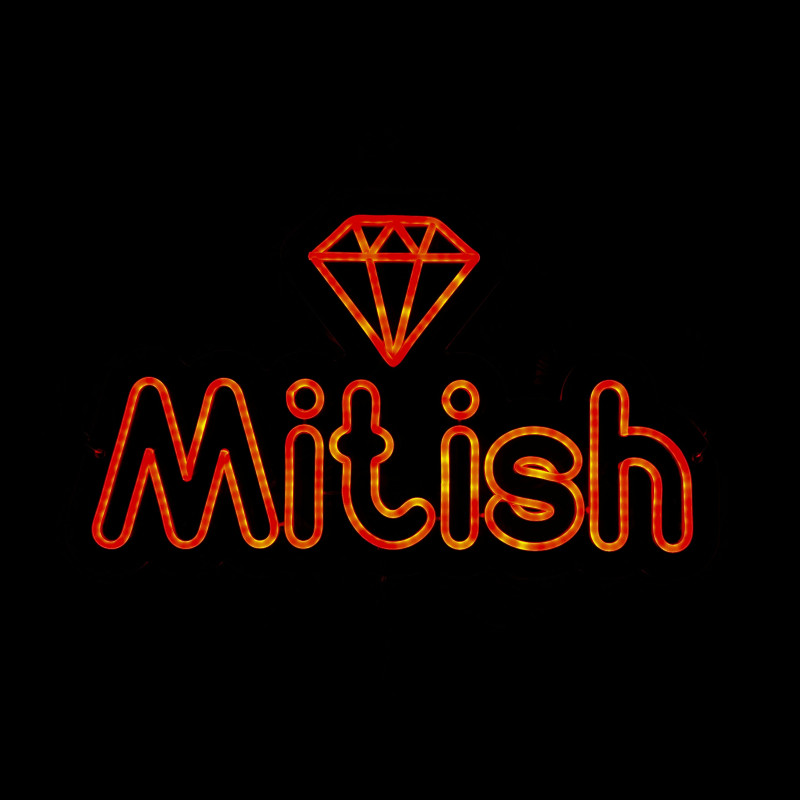 Semnul luminos „Mitish” are numele în prim-plan, cu diamantul ca element grafic de accent. Iluminarea RGB oferă scene dinamice (solid/fade/chase), vizibile pe fațadă, recepție, lounge, studio sau brand wall. Profil subțire, lumină uniformă, montaj curat; personalizabil (dimensiuni, palete, finisaje, control telecomandă).