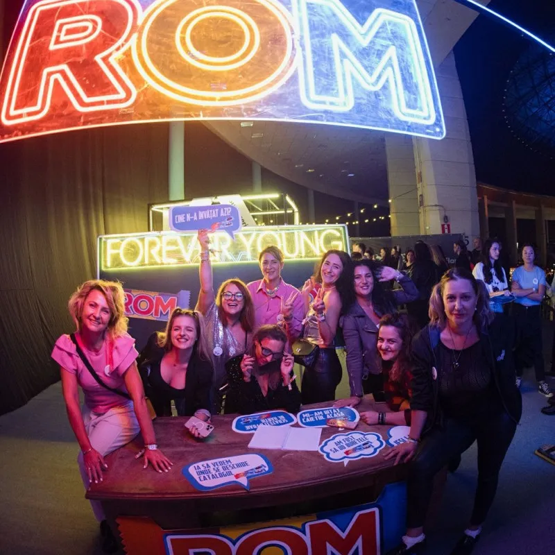Folosind culorile roșu, galben și albastru în această succesiune specifică, semnul luminos "ROM" își transmite mesajul iconic, identificându-l instantaneu ca fiind asociat cu celebrul brand de ciocolată. Această aranjare strategică a culorilor accentuează recunoașterea și familiaritatea cu marcă, atrăgând atenția și creând un impact puternic în rândul participanților la festival.