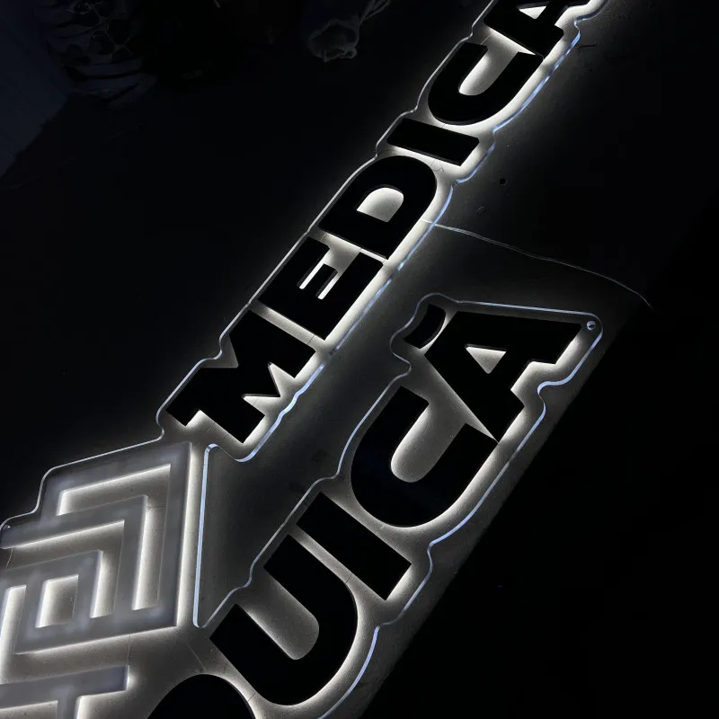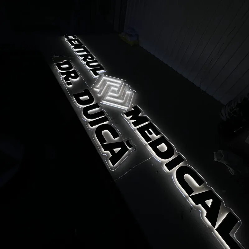 Semnul luminos LED personalizat Centrul Medical Dr. Duică este realizat de artLEDistic pentru evidențierea identității vizuale a centrului medical printr-un logo luminos clar și ușor de observat. Iluminarea este realizată cu bandă LED cu cipuri, culoare alb rece, acoperită cu silicon alb. Baza semnului este realizată din plexiglas transparent, completată cu elemente albe și negre pentru contrast vizual și evidențierea logo-ului.