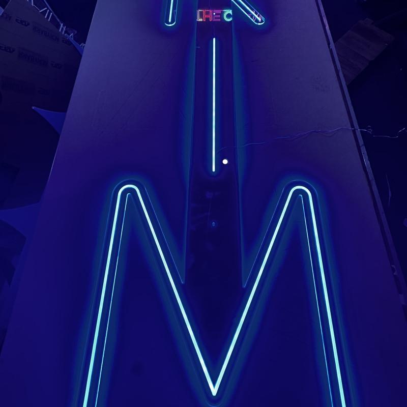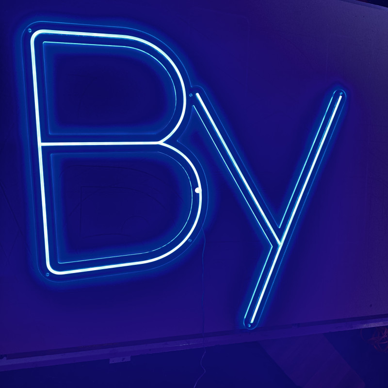 Proiectul include și două semne verticale „By RIM”, destinate montajului exterior pe clădire. Fiecare structură are aproximativ 250 cm înălțime și 118 cm lățime. Literele sunt decupate neregulat și montate pe plexiglas transparent. Iluminarea este realizată cu bandă LED cu cipuri, culoare albastru, pentru vizibilitate maximă de la distanță. Sistemul de montaj include 12 distanțiere metalice pentru fiecare structură.