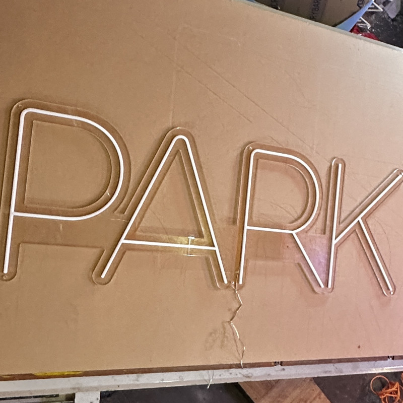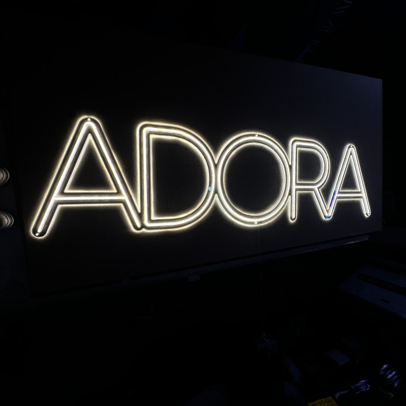 Semnul ADORA PARK are o lungime totală de aproximativ 400 cm și înălțimea de 55 cm, fiind realizat din două module. Literele sunt decupate regulat și montate pe bază din plexiglas transparent pentru o integrare directă pe fațadă. Iluminarea este realizată cu bandă LED cu cipuri, culoare alb cald, acoperită cu silicon alb pentru distribuție uniformă și lizibilitate optimă pe timp de noapte. Montajul este asigurat de 12 distanțiere metalice, iar intensitatea este reglabilă prin telecomandă cu dimmer.