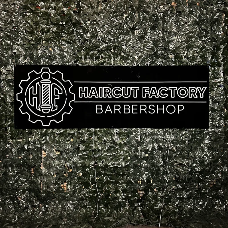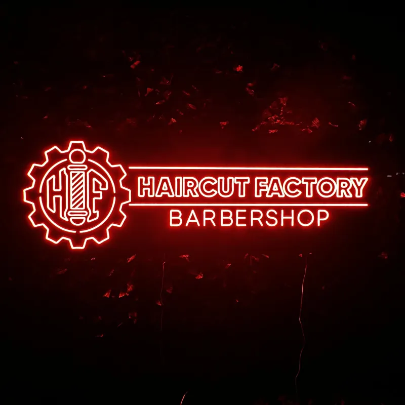 Semn luminos personalizat Haircut Factory Barbershop, realizat de artLEDistic, producător din România specializat în semne LED pentru exterior. Livrarea se face oriunde în România.