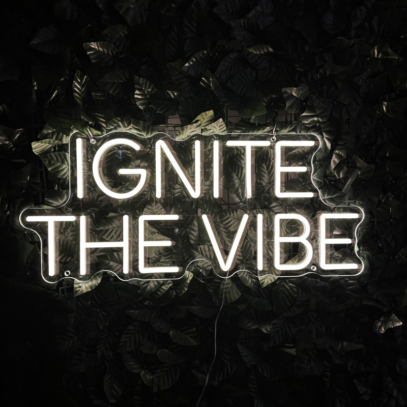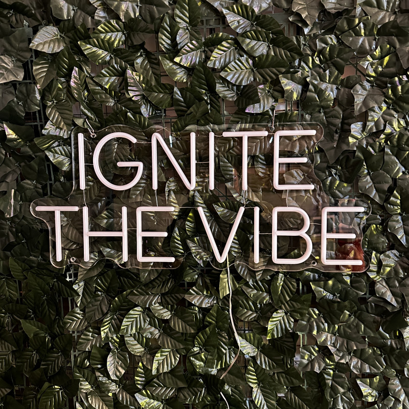 Semnul luminos personalizat IGNITE THE VIBE este realizat de artLEDistic, producător din România specializat în semne luminoase LED personalizate pentru spații comerciale, evenimente și zone de socializare. Proiectul este realizat pentru utilizare la interior și creează un punct vizual puternic în baruri, cafenele sau spații creative.