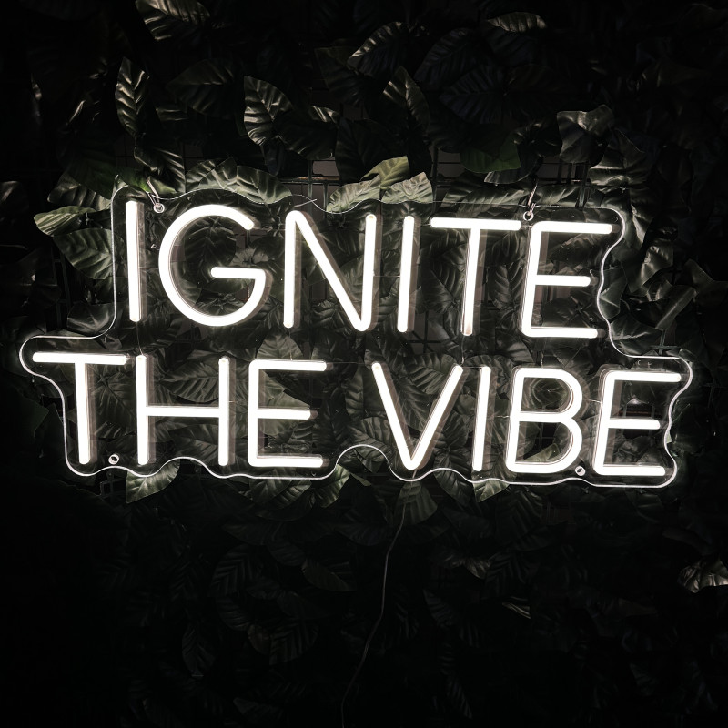 Semnul este decupat neregulat la forma textului IGNITE THE VIBE, pentru un contur clar și lizibilitate bună de la distanță. Iluminarea este realizată cu bandă LED cu cipuri, culoare alb cald, acoperită cu silicon alb pentru lumină uniformă. Textul este montat pe bază din plexiglas transparent, ușor de integrat în decor. Dimensiunea semnului este de aproximativ 700 mm lățime și 300 mm înălțime. Proiectul include telecomandă cu dimmer și kit cu patru distanțiere transparente pentru montaj. Semnul nu include gravură logo artLEDistic.